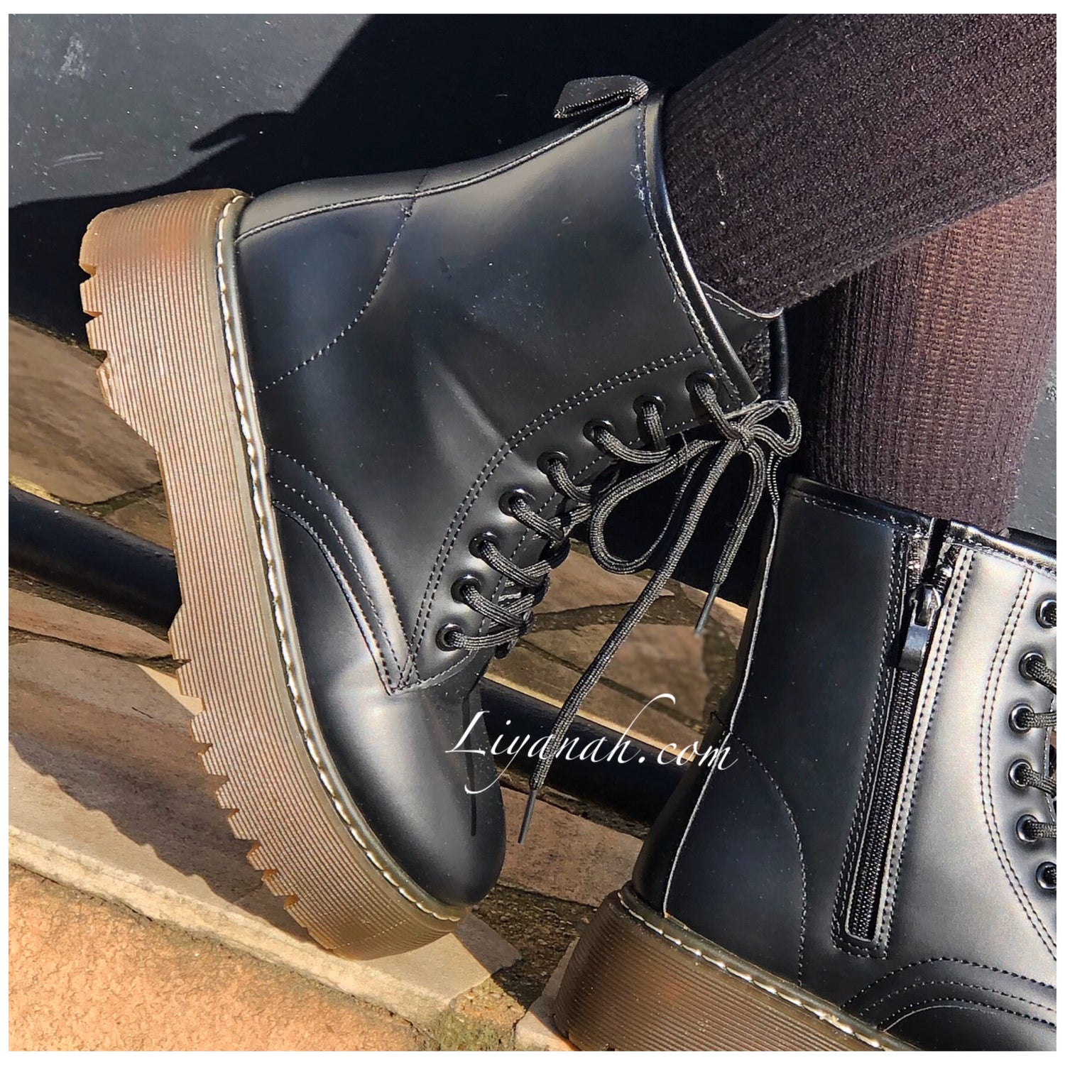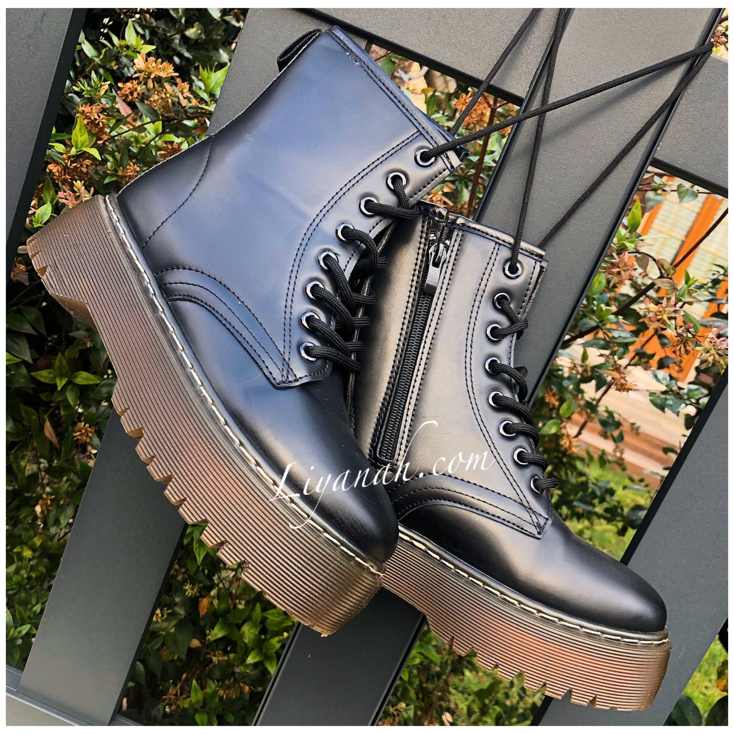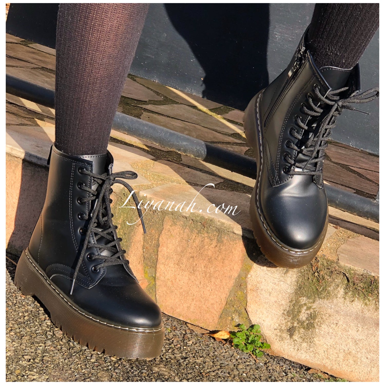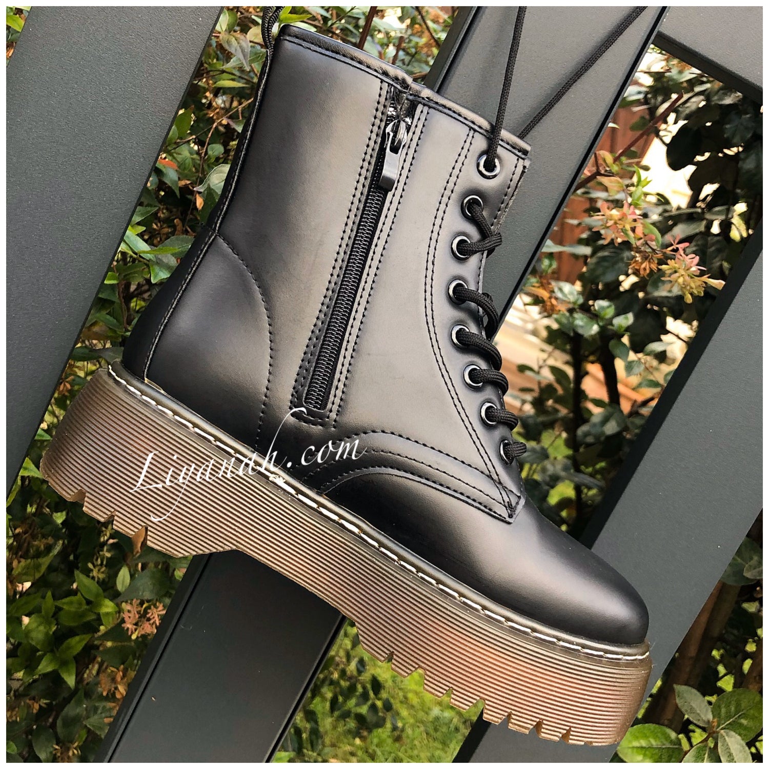 BOOTS Modèle LIZZY NOIR LISSE - Boots noir à fermeture ZIP sur le côté et laçage à 8 œillets, montées sur semelle plateforme, bout rond et languette à l’arrière. Hauteur de la tige Noir : 2,5 cm - Hauteur de la plateforme : 4,5 cm - Matière Synthétique - Taille 36 au 41 (Les chaussures vendus sur notre site ne sont ni repris ni échangé pour des raisons d'hygiène !! CONSEIL : Prenez votre Taille Habituelle)