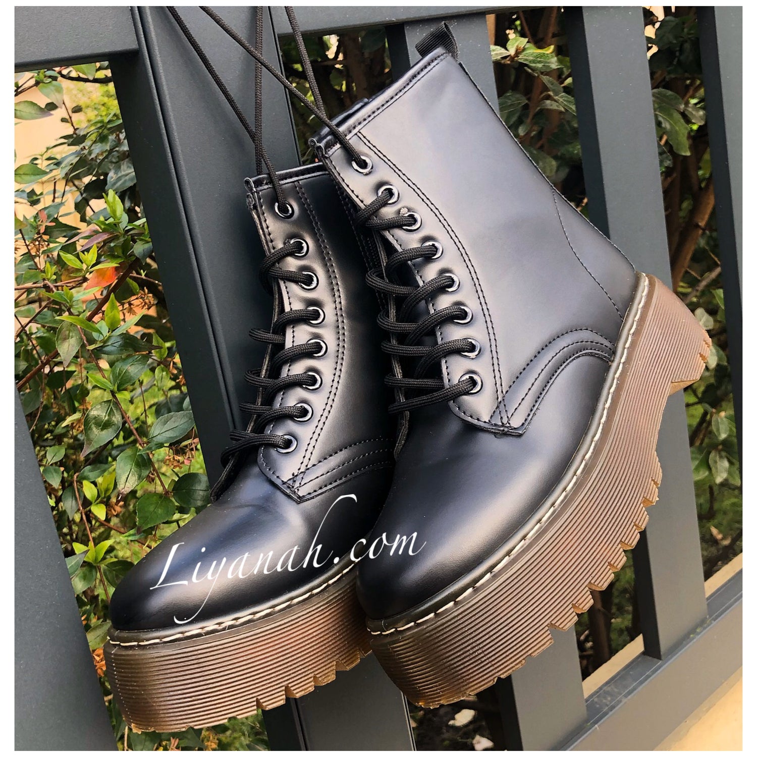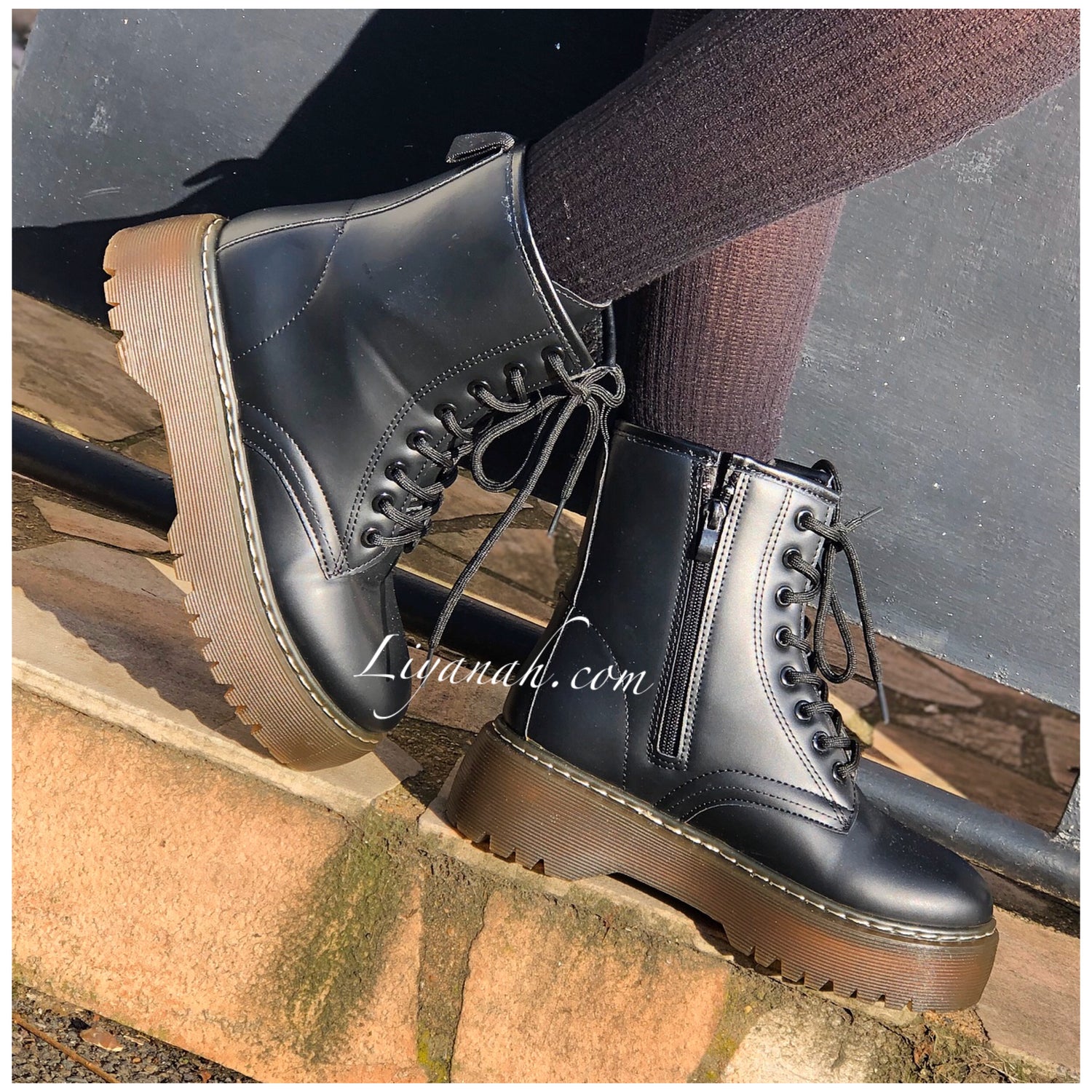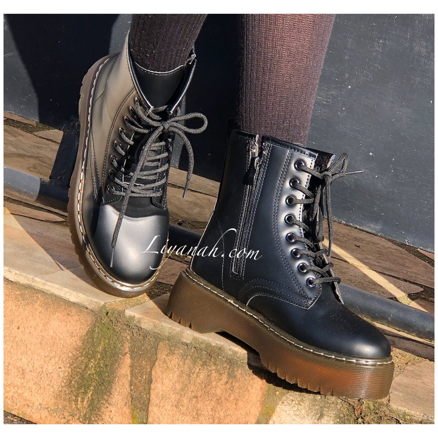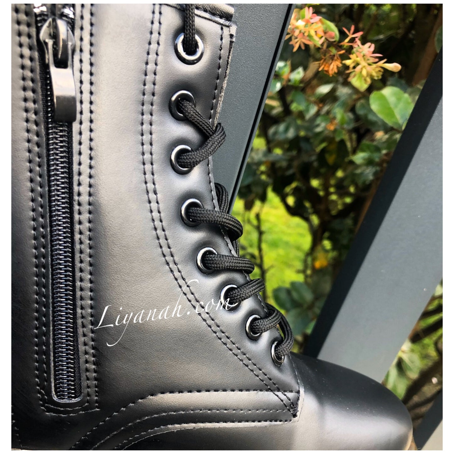 BOOTS Modèle LIZZY NOIR LISSE - Boots noir à fermeture ZIP sur le côté et laçage à 8 œillets, montées sur semelle plateforme, bout rond et languette à l’arrière. Hauteur de la tige Noir : 2,5 cm - Hauteur de la plateforme : 4,5 cm - Matière Synthétique - Taille 36 au 41 (Les chaussures vendus sur notre site ne sont ni repris ni échangé pour des raisons d'hygiène !! CONSEIL : Prenez votre Taille Habituelle)