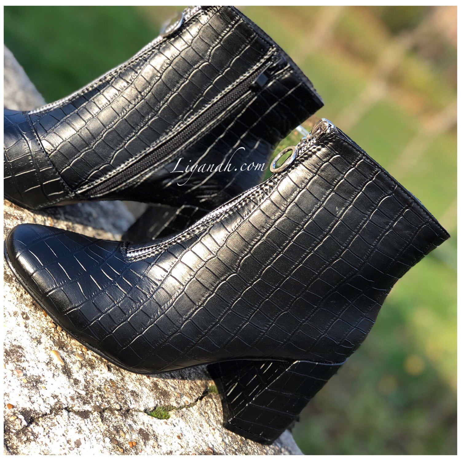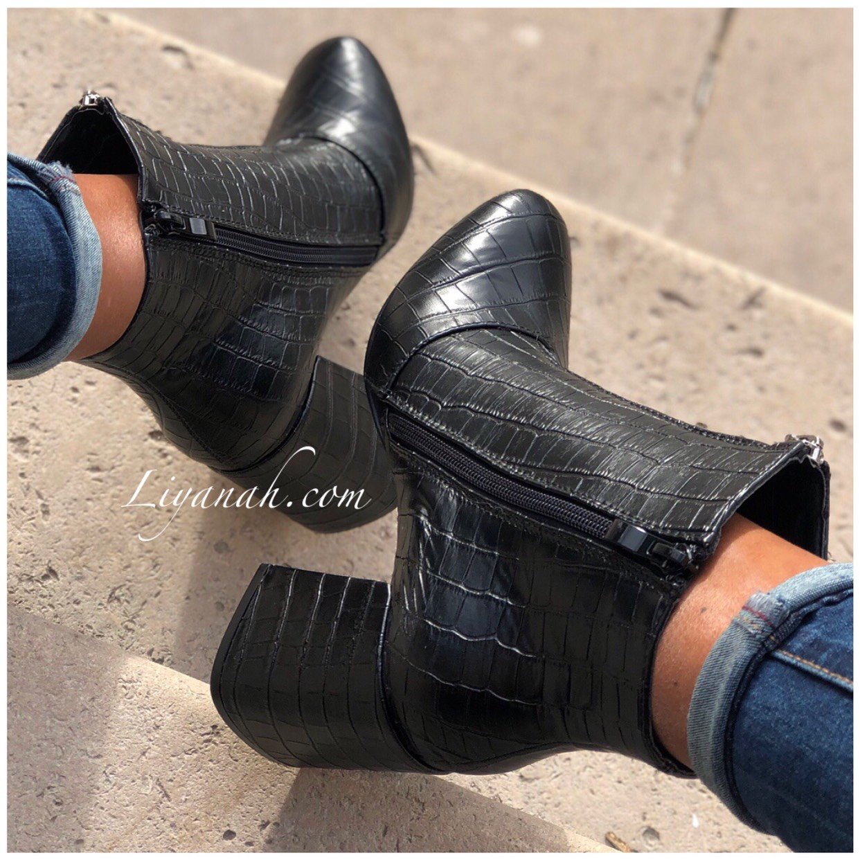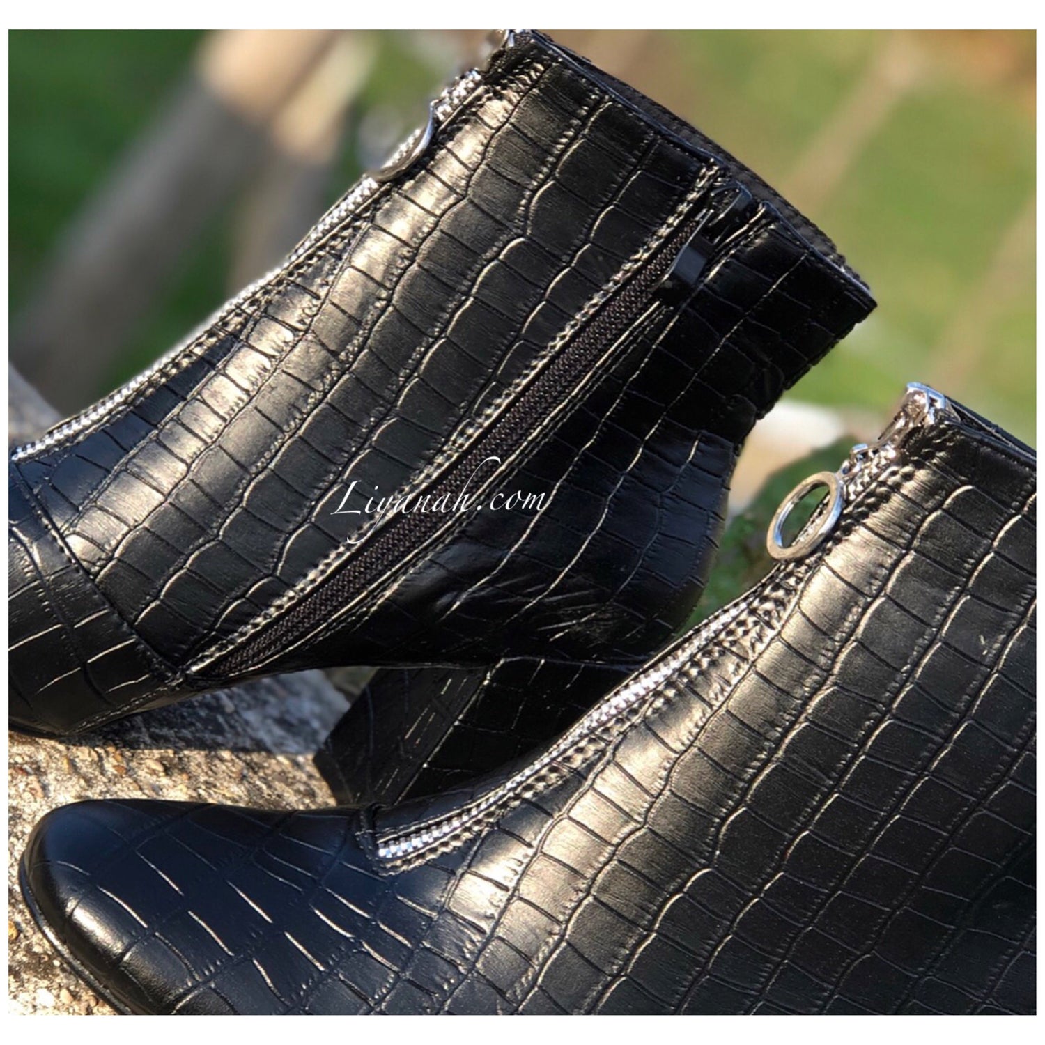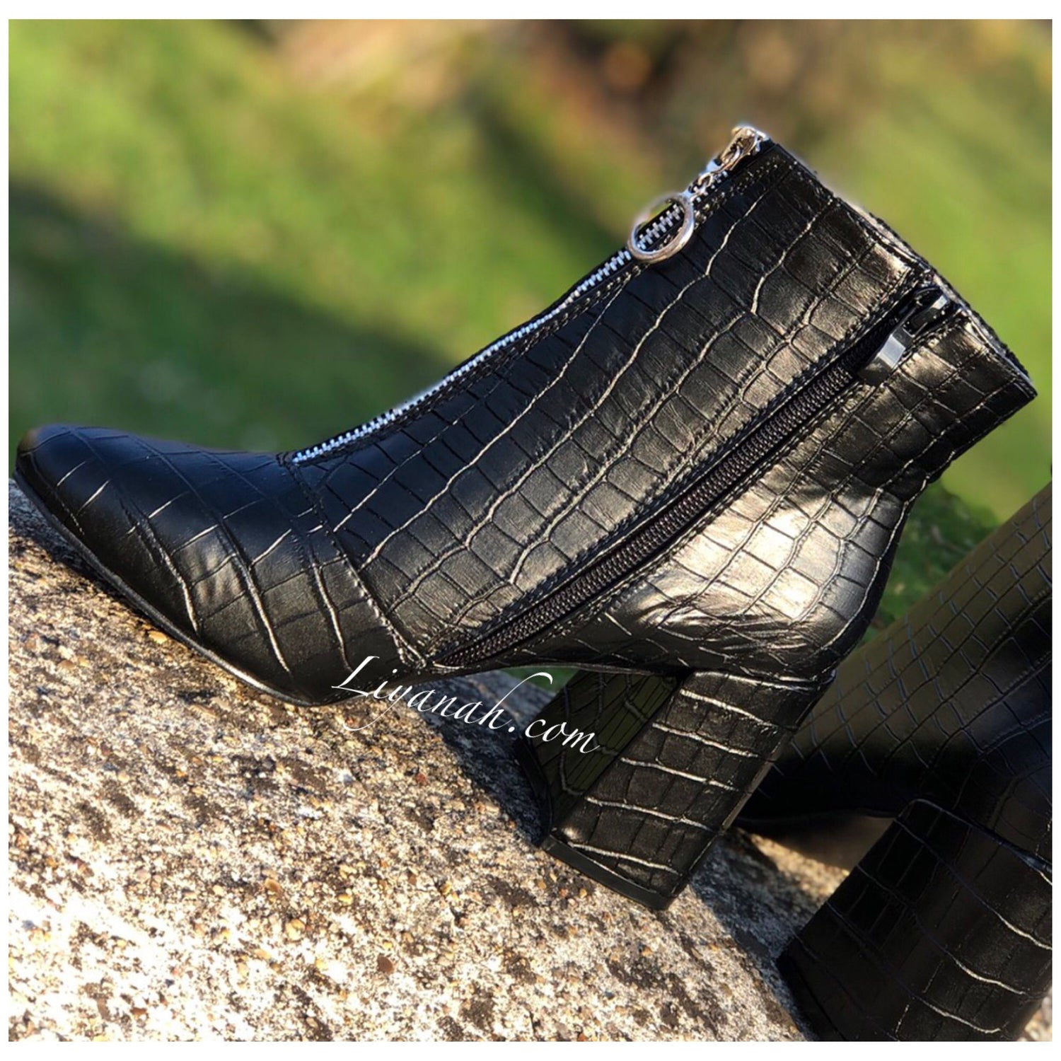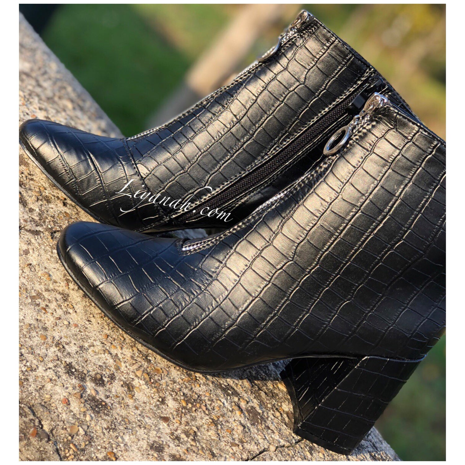 Bottines Aspect Croco à talons Bloc Modèle PARISIENNE NOIR 🖤 Bottines à bout Rond, Gros Talon haut bloc, Bout rond, Fermeture ZIP sur le côté et sur le devant - aspect brillant - SYNTHÉTIQUE 💋 Hauteur du talon : 8,5 cm ✖️ confortable et agréable à porter - Taille 36 à 41(Les chaussures vendus sur notre site ne sont ni repris ni échangé pour des raisons d'hygiène !! CONSEIL : Prenez votre Taille Habituelle