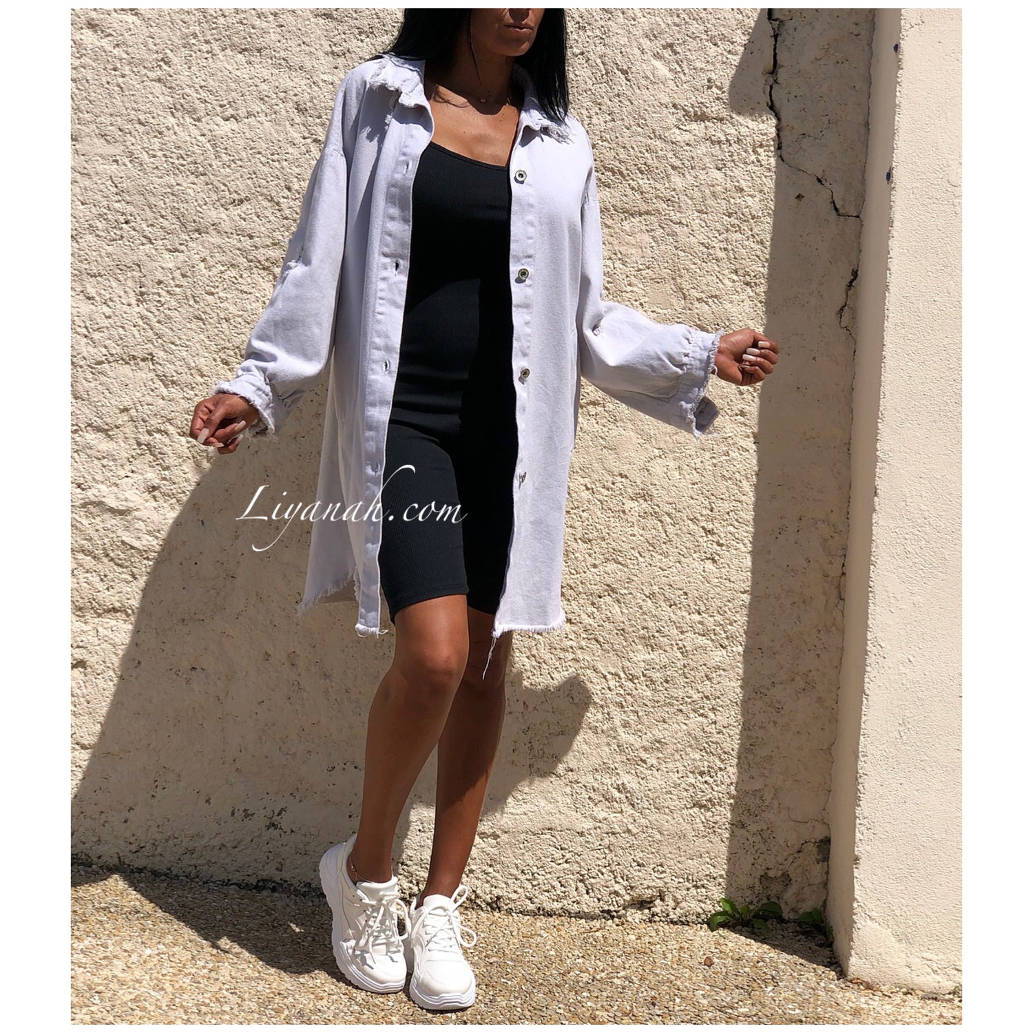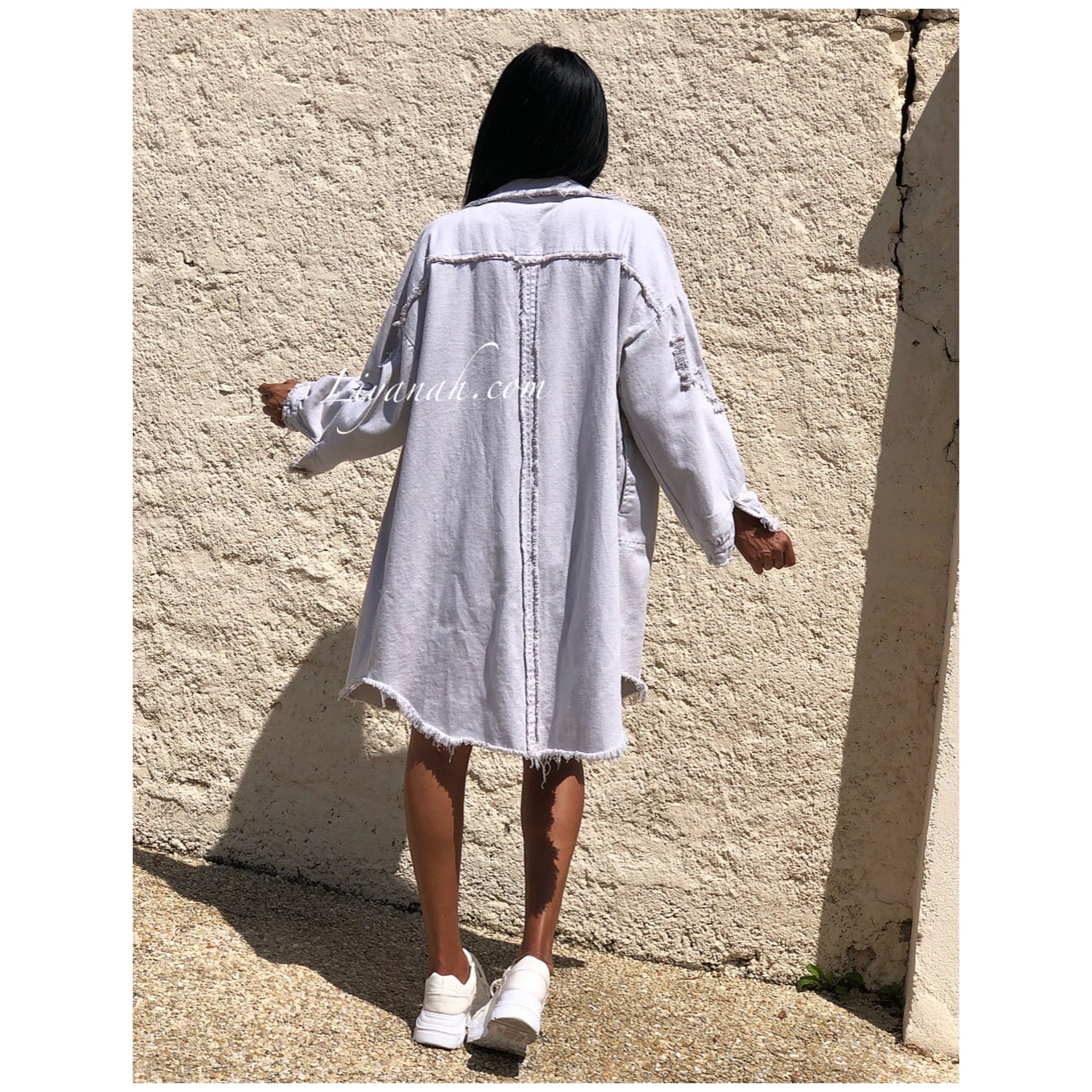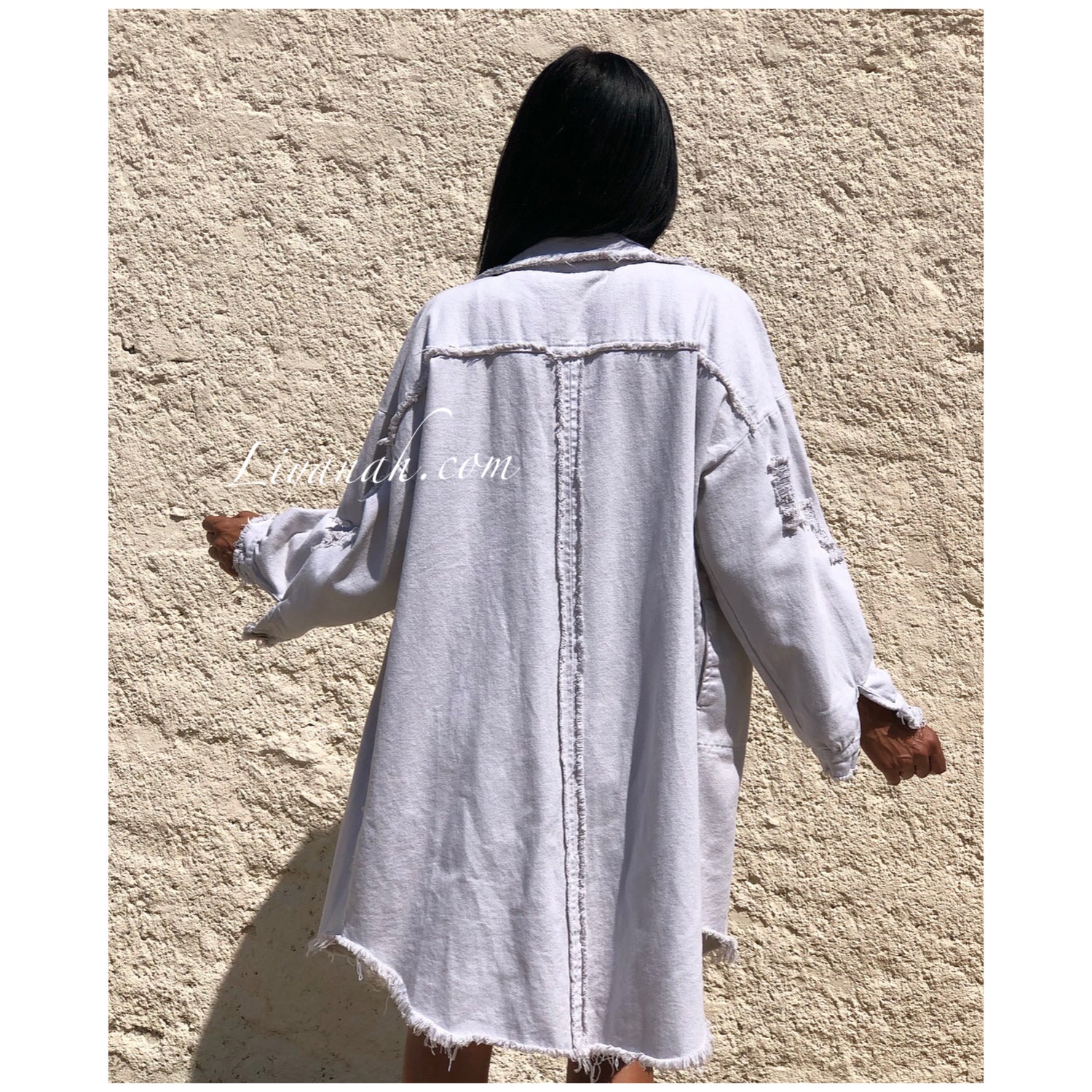 CHEMISE Longue (Style Robe) Modèle BAO GRIS CLAIR - Chemise longue aspect Jean épaisse à porter en veste et également en robe, modèle destroy, coupe large, deux poches fonctionnelles, fermetures boutons, manches 3/4 - 100% Coton  - Taille Unique du 34 au 40