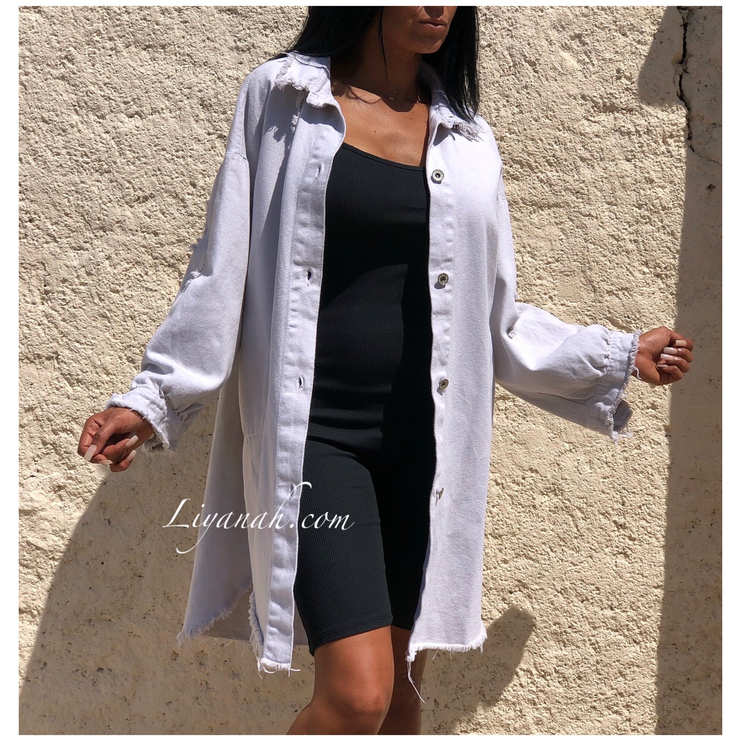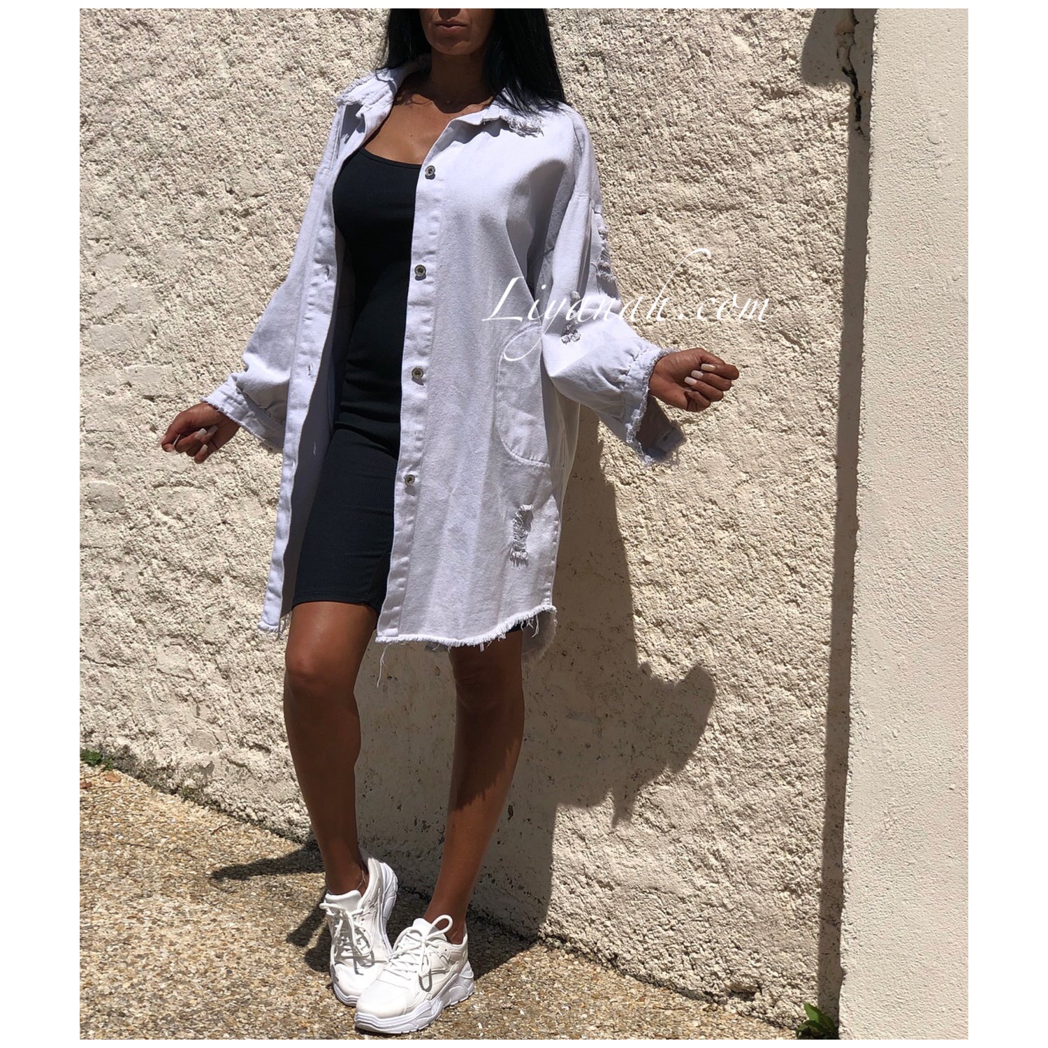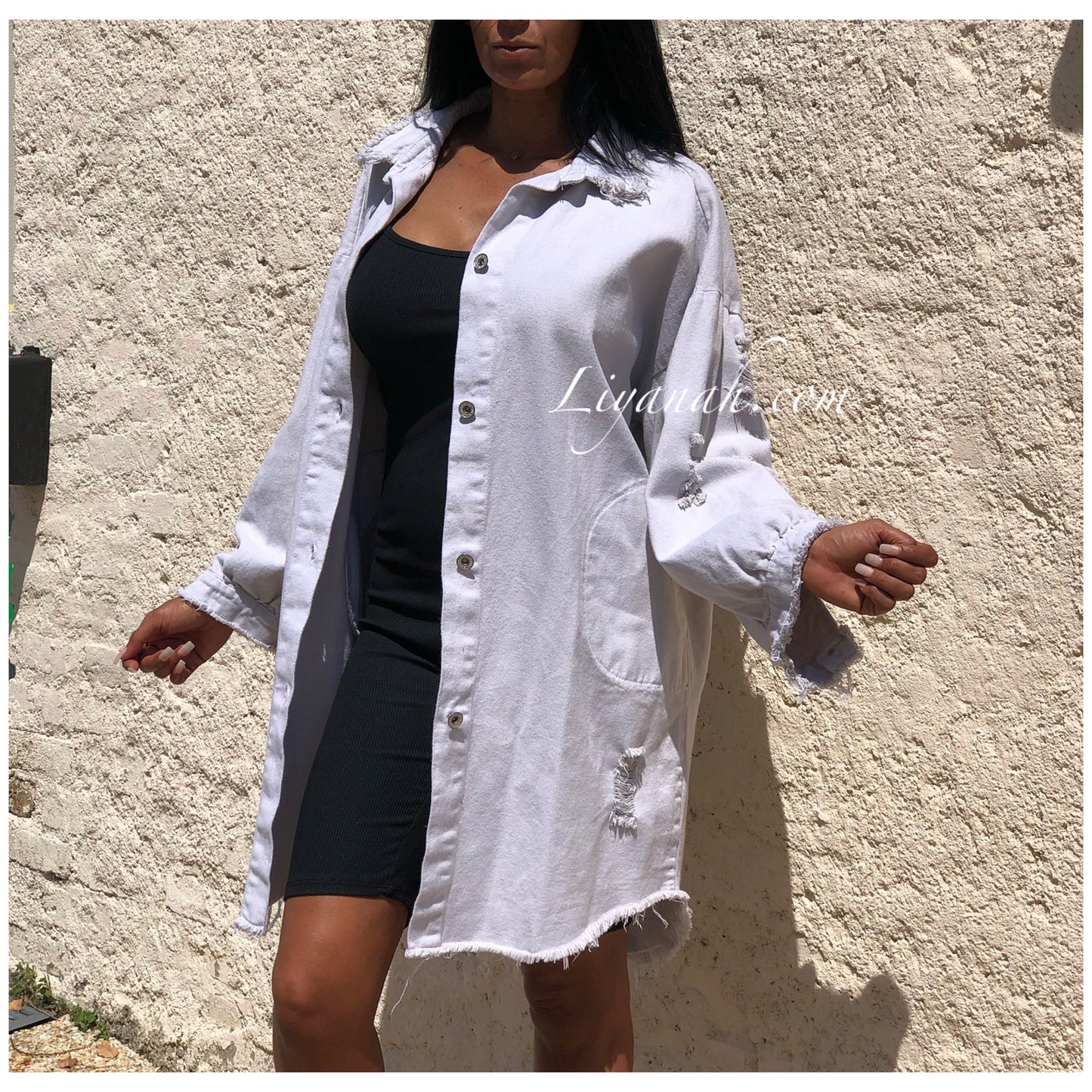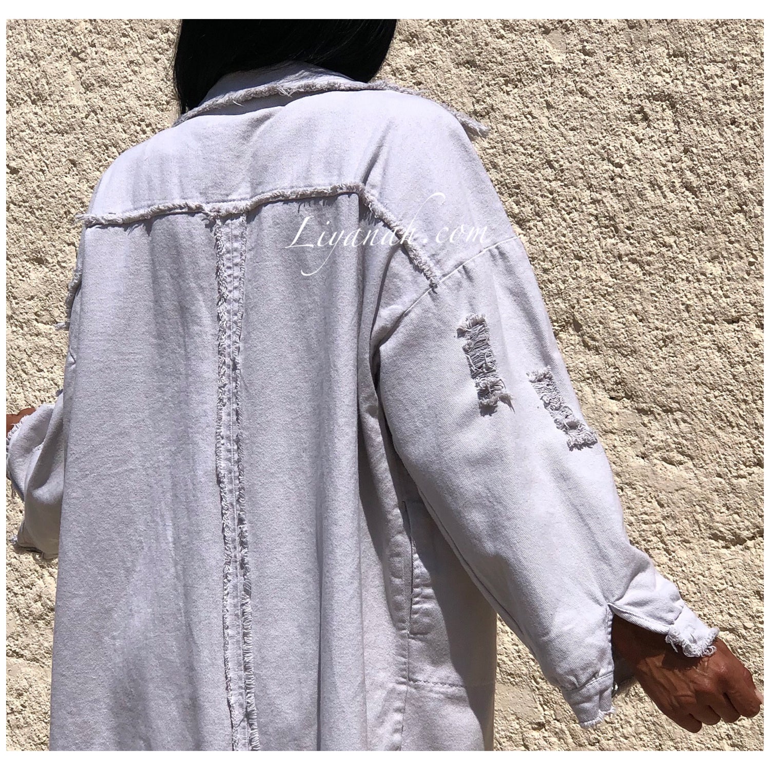 CHEMISE Longue (Style Robe) Modèle BAO GRIS CLAIR - Chemise longue aspect Jean épaisse à porter en veste et également en robe, modèle destroy, coupe large, deux poches fonctionnelles, fermetures boutons, manches 3/4 - 100% Coton  - Taille Unique du 34 au 40