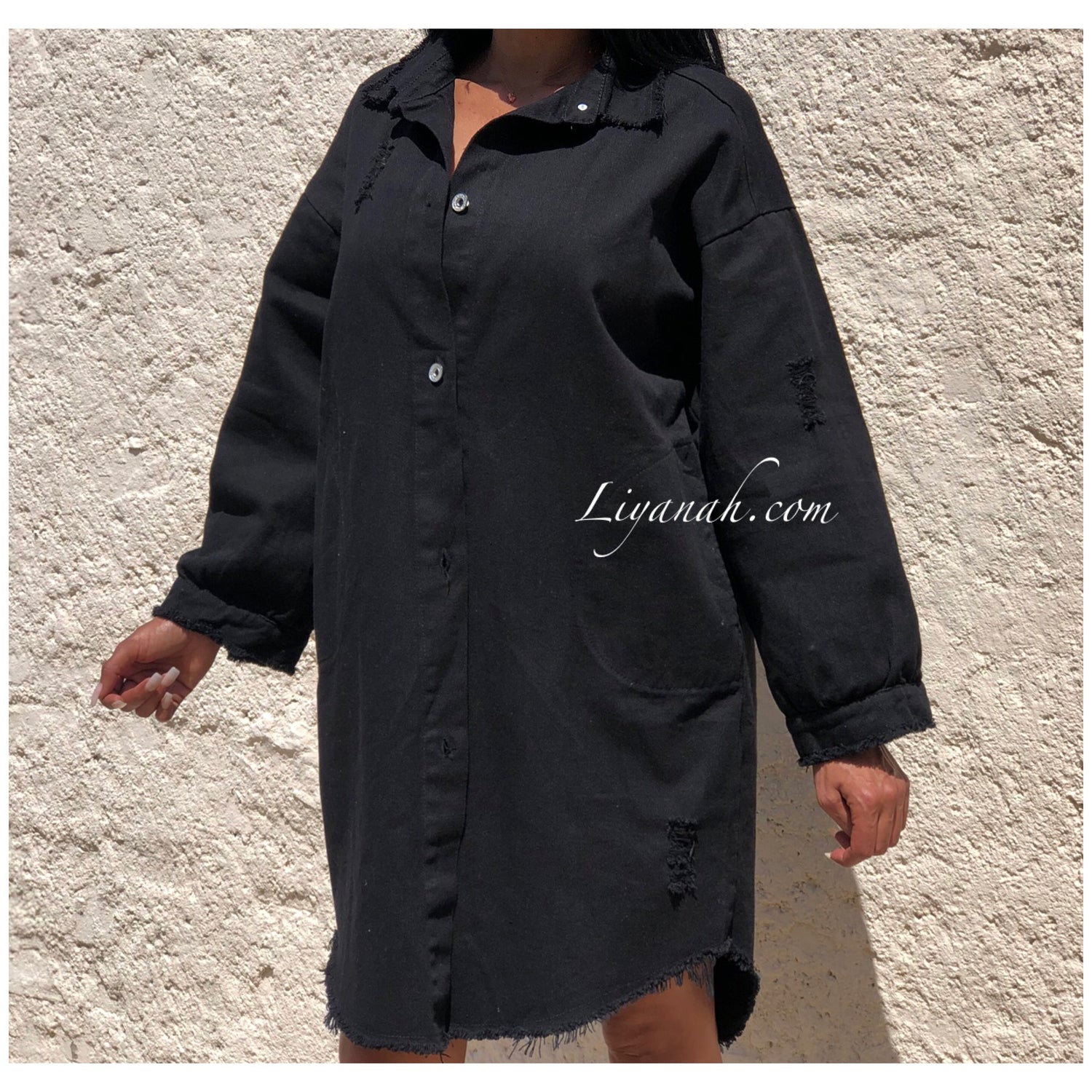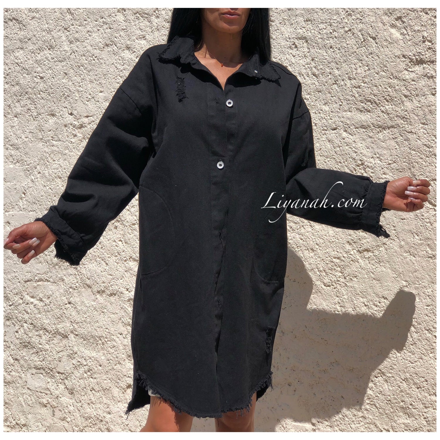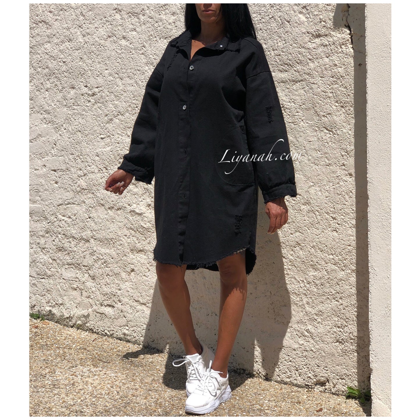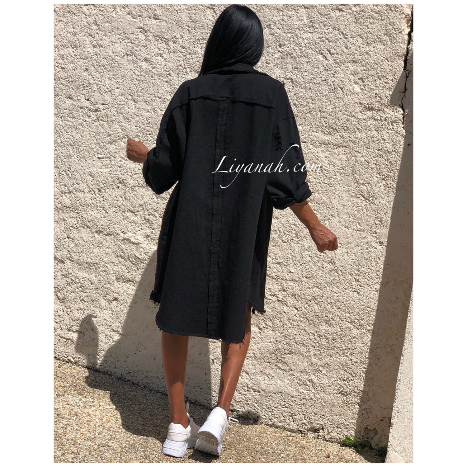 CHEMISE Longue (Style Robe) Modèle BAO NOIR - Chemise longue aspect Jean épaisse à porter en veste et également en robe, modèle destroy, coupe large, deux poches fonctionnelles, fermetures boutons, manches 3/4 - 100% Coton - Taille Unique du 34 au 40