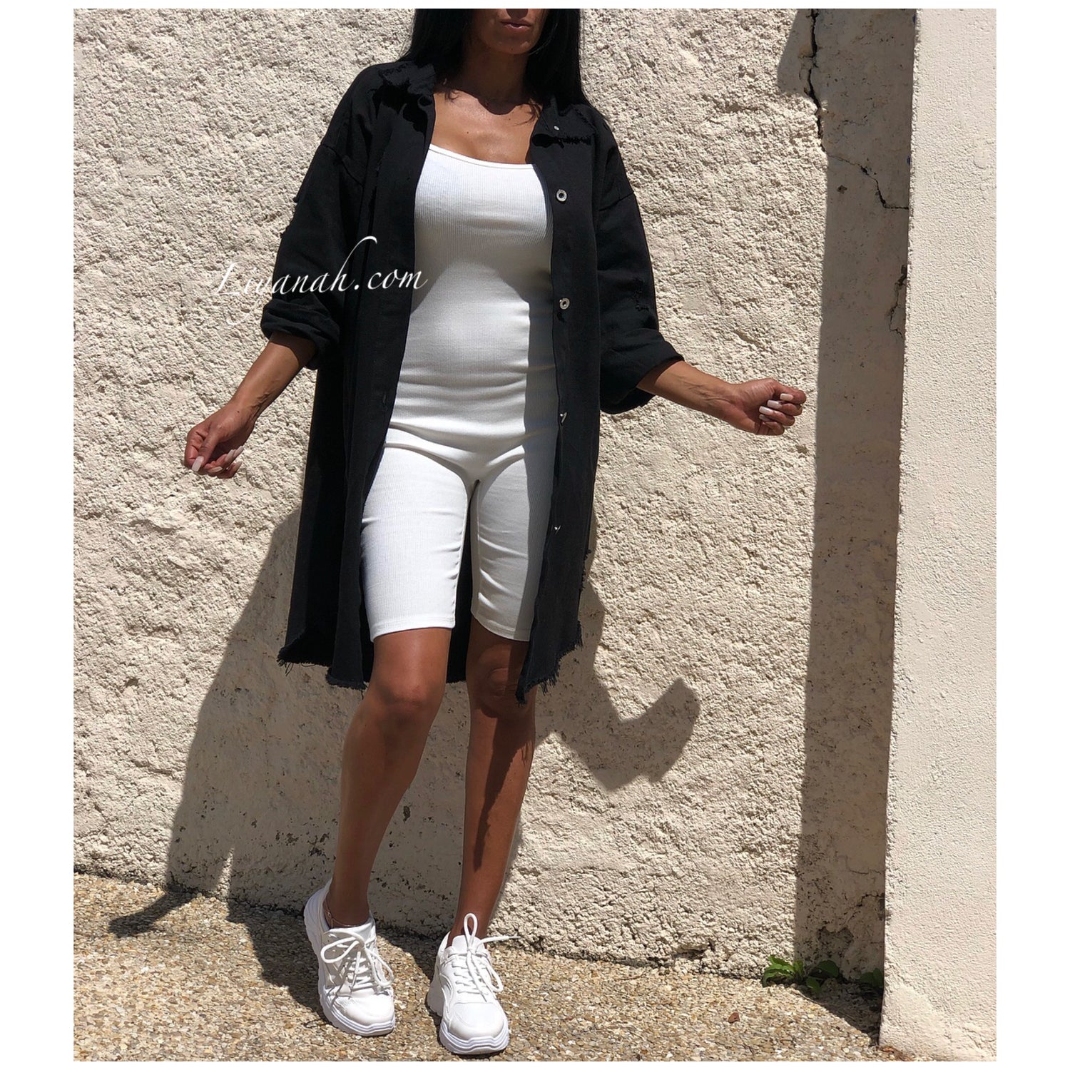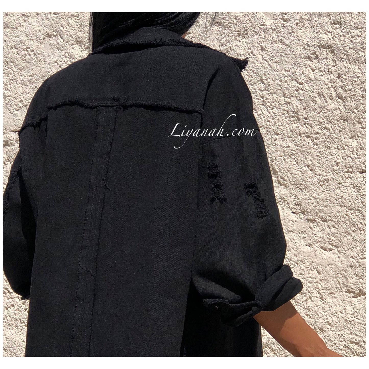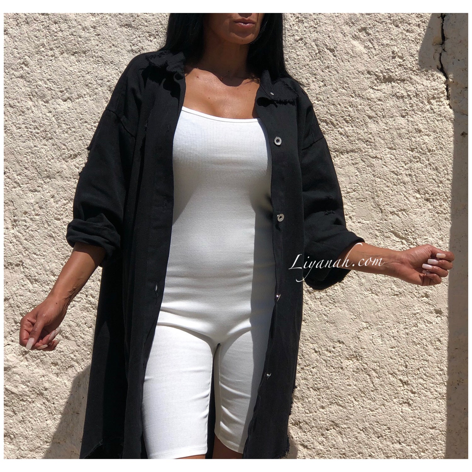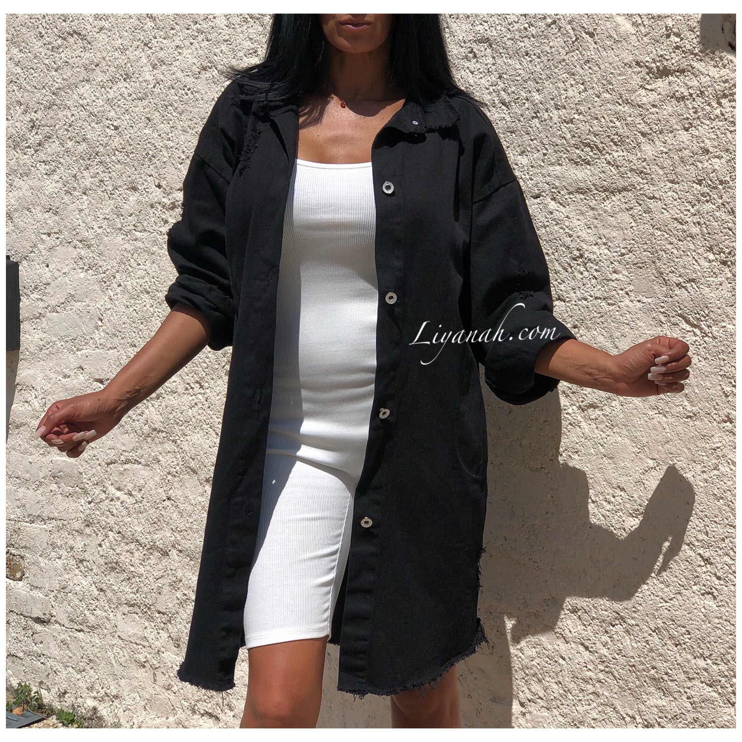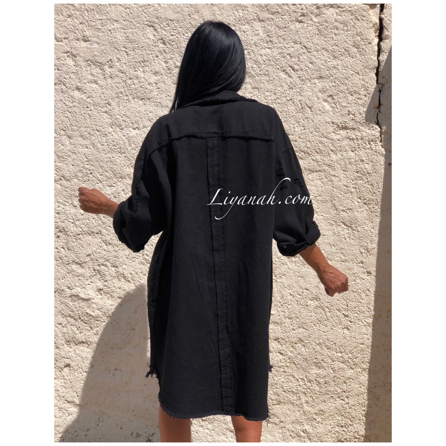 CHEMISE Longue (Style Robe) Modèle BAO NOIR - Chemise longue aspect Jean épaisse à porter en veste et également en robe, modèle destroy, coupe large, deux poches fonctionnelles, fermetures boutons, manches 3/4 - 100% Coton - Taille Unique du 34 au 40