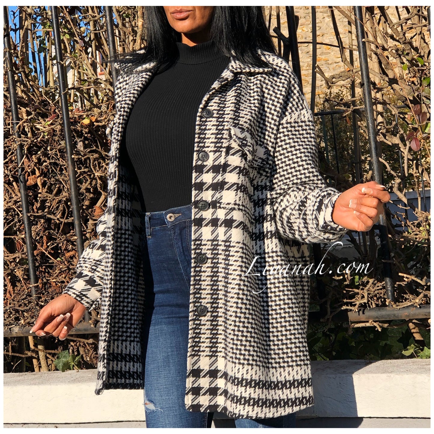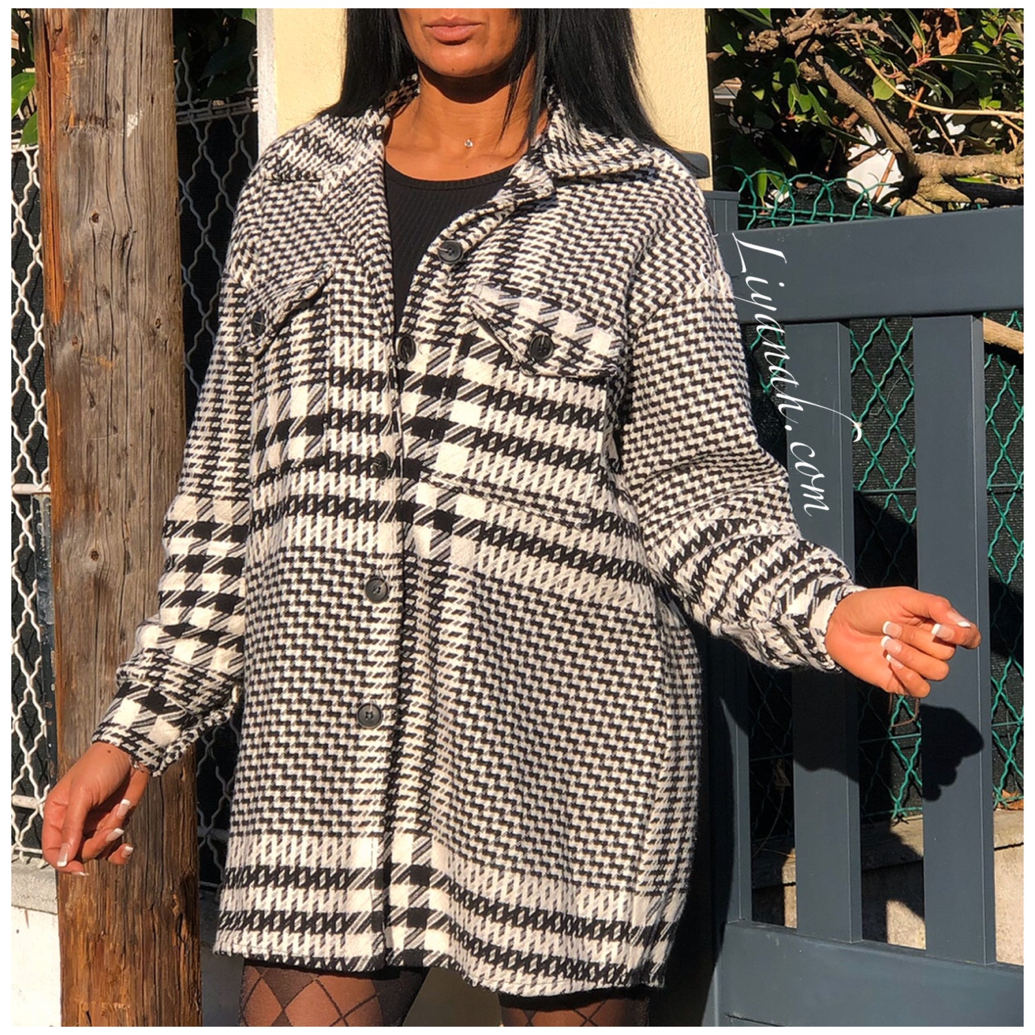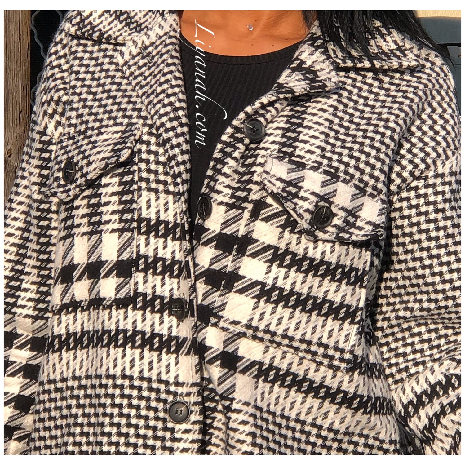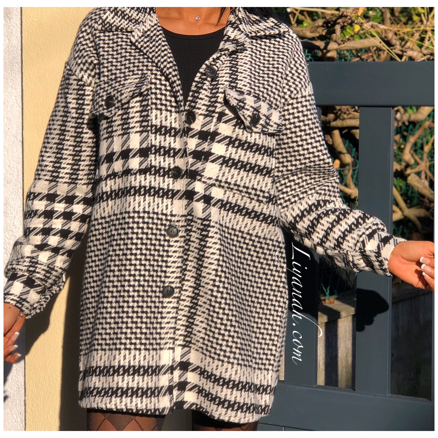 Chemise Modèle TANYA NOIR/BLANC - Coupe légèrement Oversize (se porte un peu large) chemise coupe droite, imprimé carreaux, fermeture boutons, manches longues, deux poches poitrines fonctionnelles, matière épaisse - 100% Polyester - Longueur : 82 cm - Taille Unique du 34 au 38 (Notre modèle mesure 1m70, fait une taille 34)