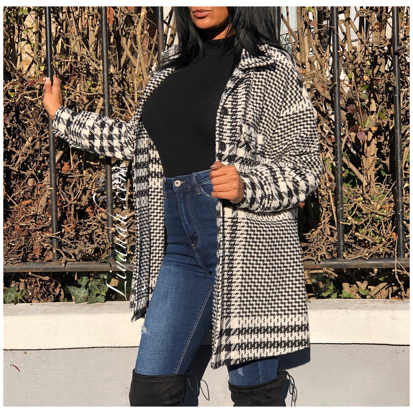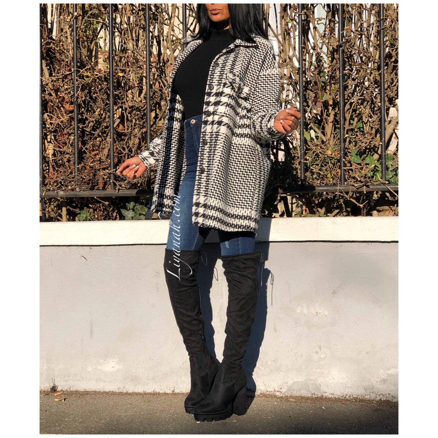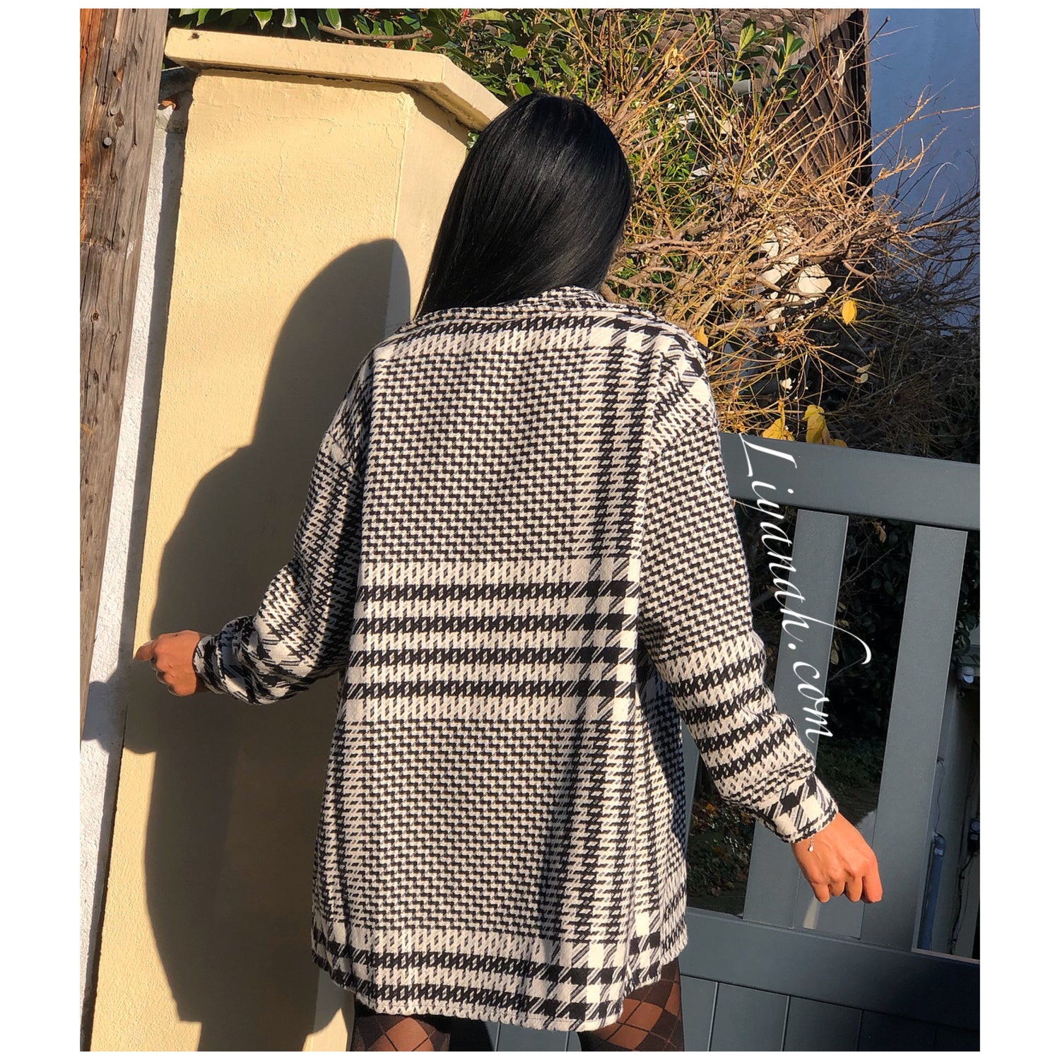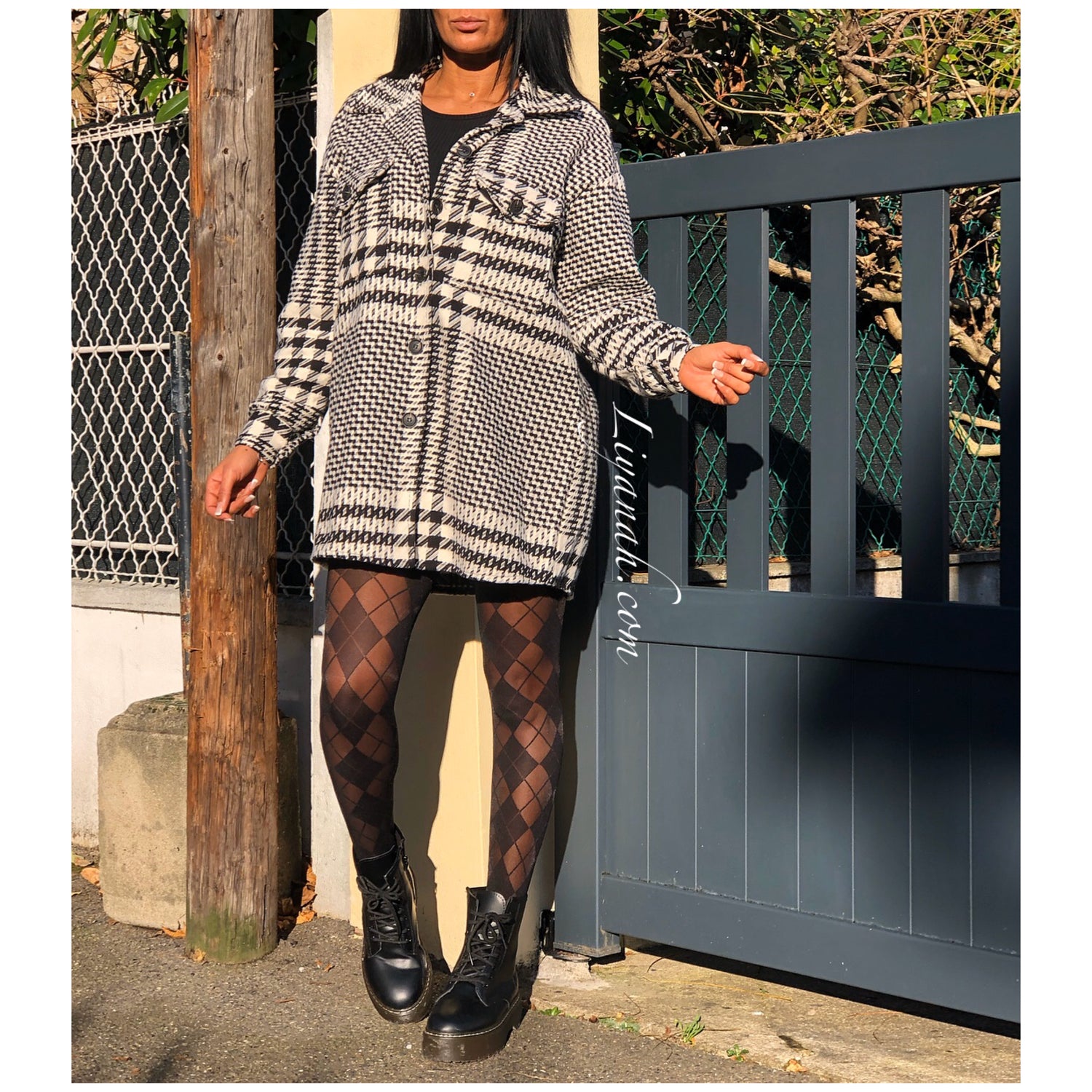 Chemise Modèle TANYA NOIR/BLANC - Coupe légèrement Oversize (se porte un peu large) chemise coupe droite, imprimé carreaux, fermeture boutons, manches longues, deux poches poitrines fonctionnelles, matière épaisse - 100% Polyester - Longueur : 82 cm - Taille Unique du 34 au 38 (Notre modèle mesure 1m70, fait une taille 34)