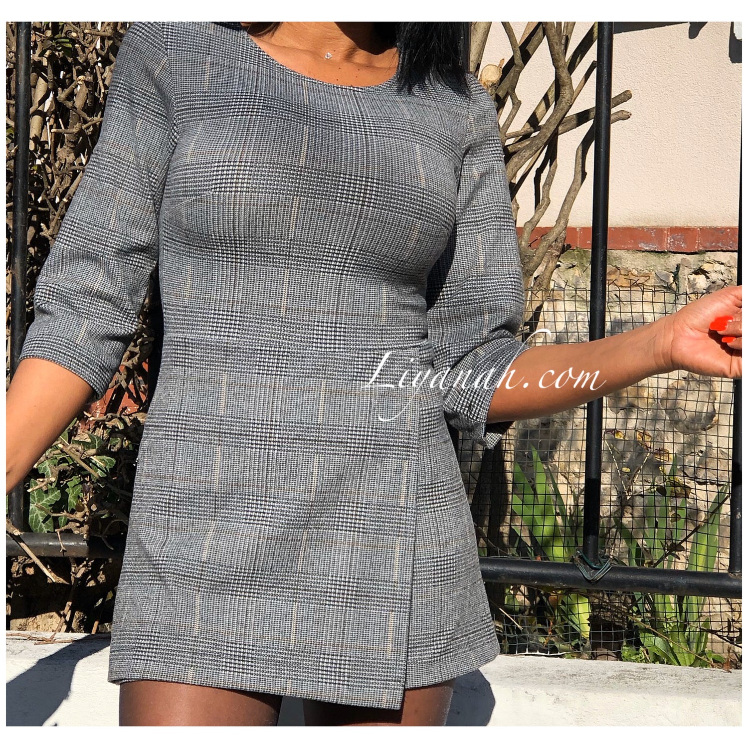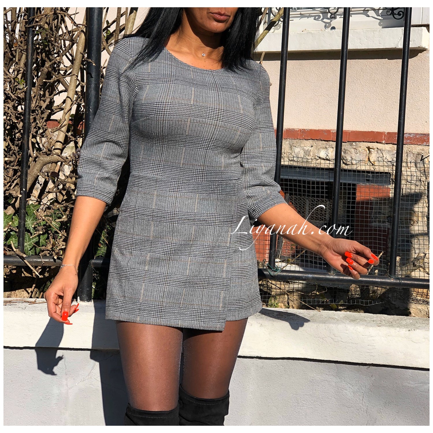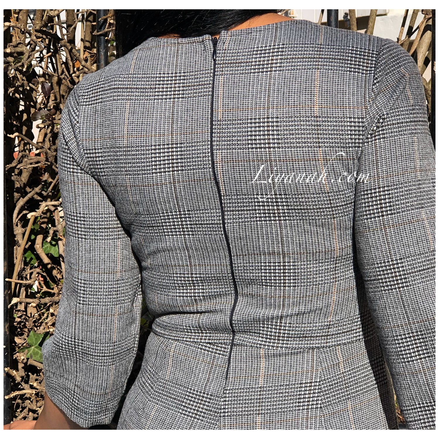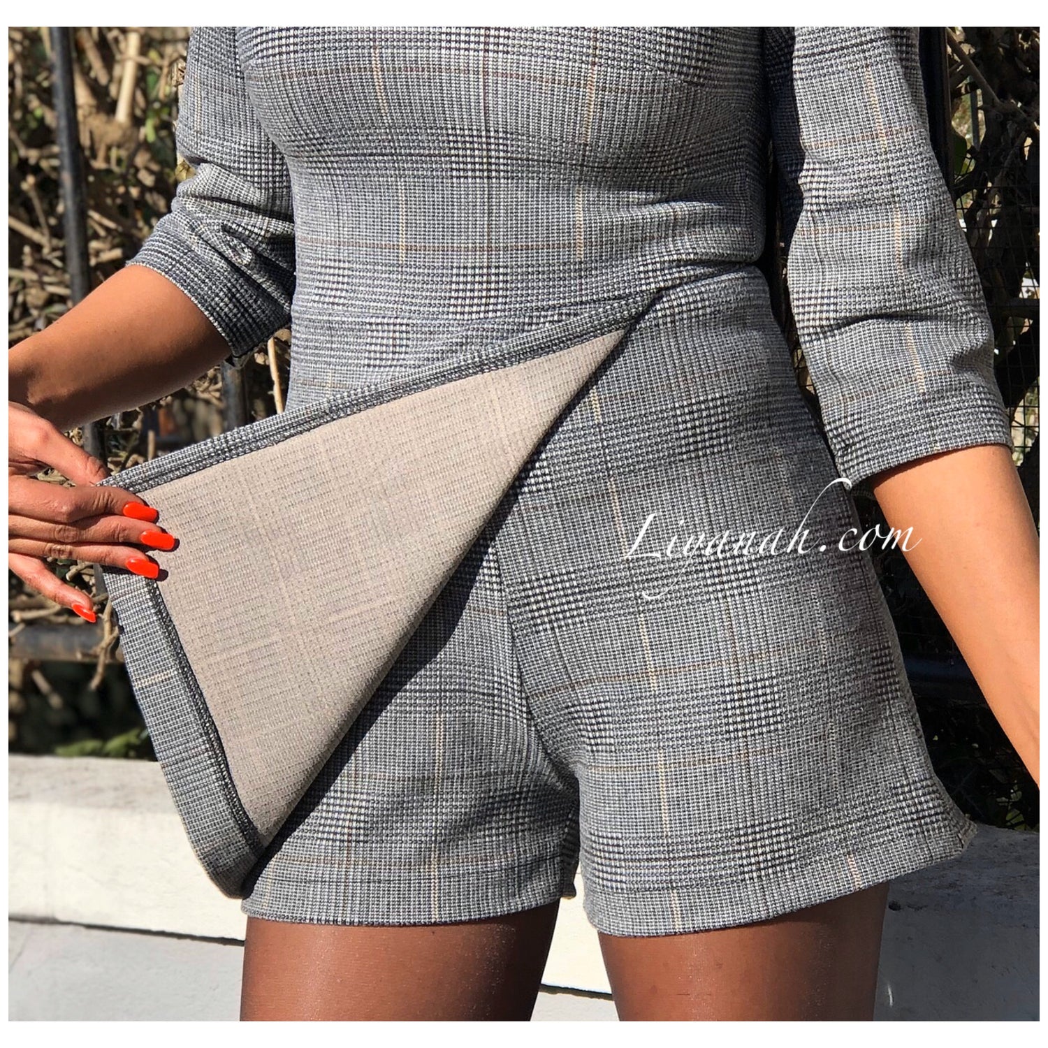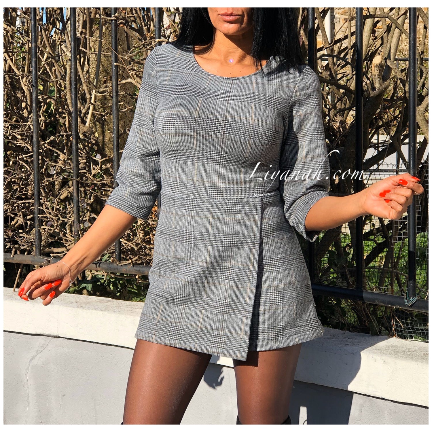 Combishort Modèle EVE - Combishort à enfiler avec fermeture ZIP au dos, imprimé carreaux, se porte très près du corps, matière légèrement épaisse et douce, manches 3/4 - 75% Polyester 18% Viscose 7% Elasthanne - Taille XS au L