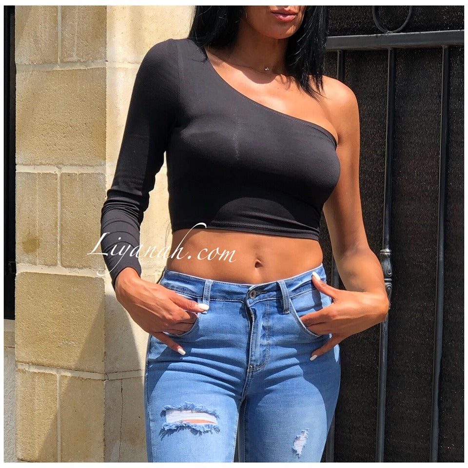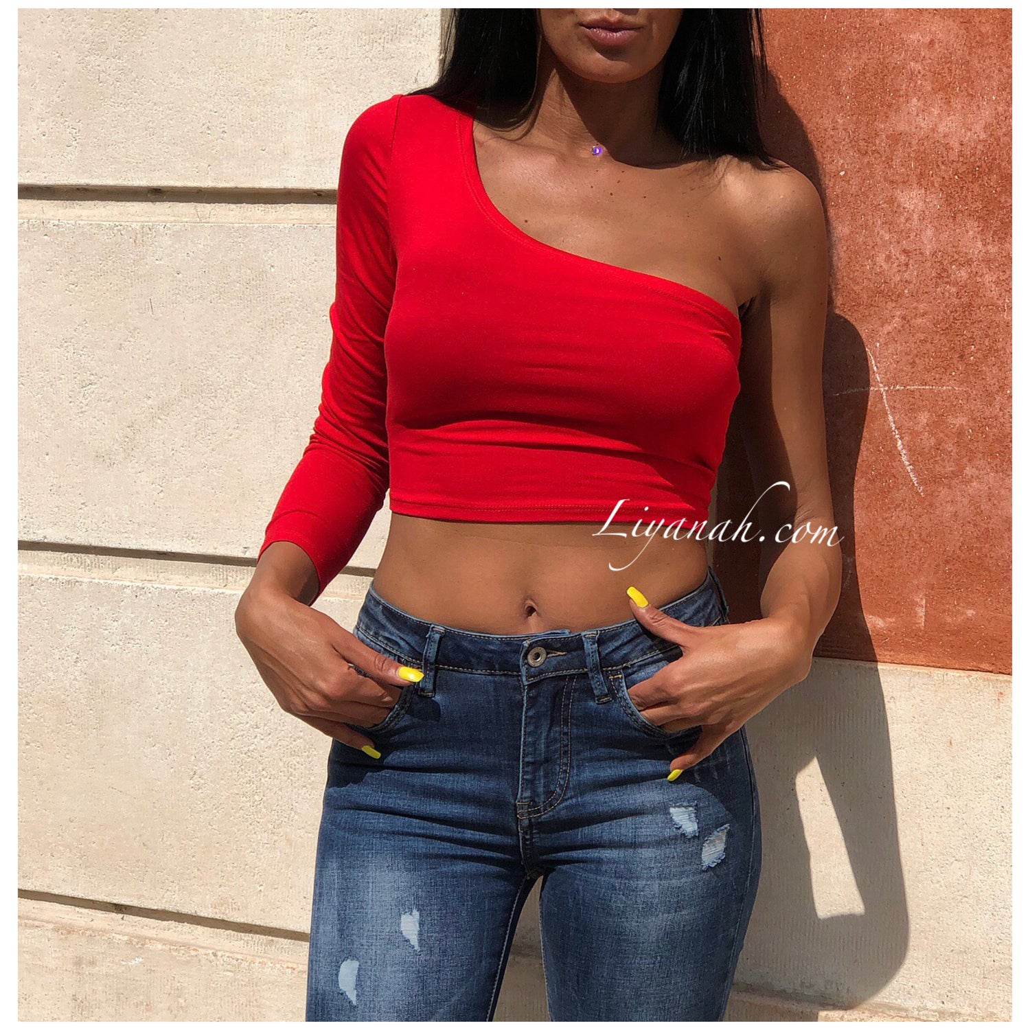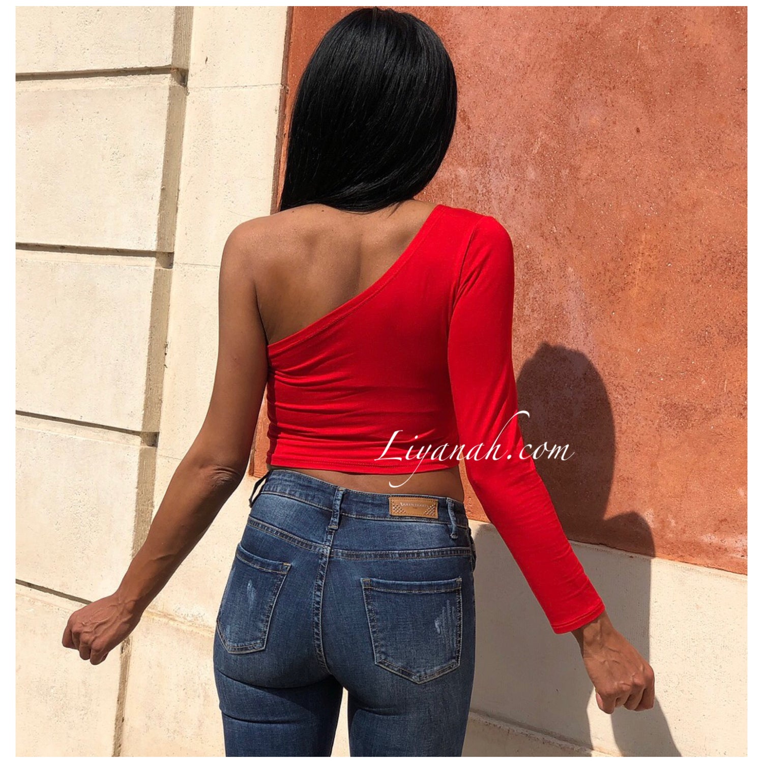 Crop top à manche unique Modèle MYRIS Blanc, Rouge, Beige ou Noir - Top avec une manche qui se porte court, matière fluide, élastique et légèrement transparente - Taille Unique du 34 au 38 - 95% Viscose 5% Elasthanne - Chic et féminin, une coupe asymétique à épaule nue, il sera parfait pour cet été.