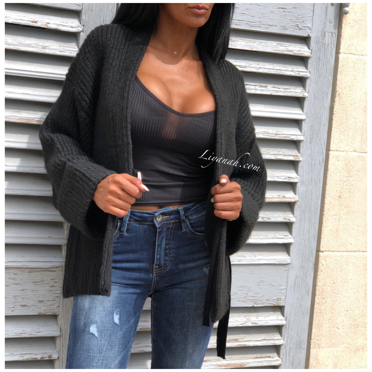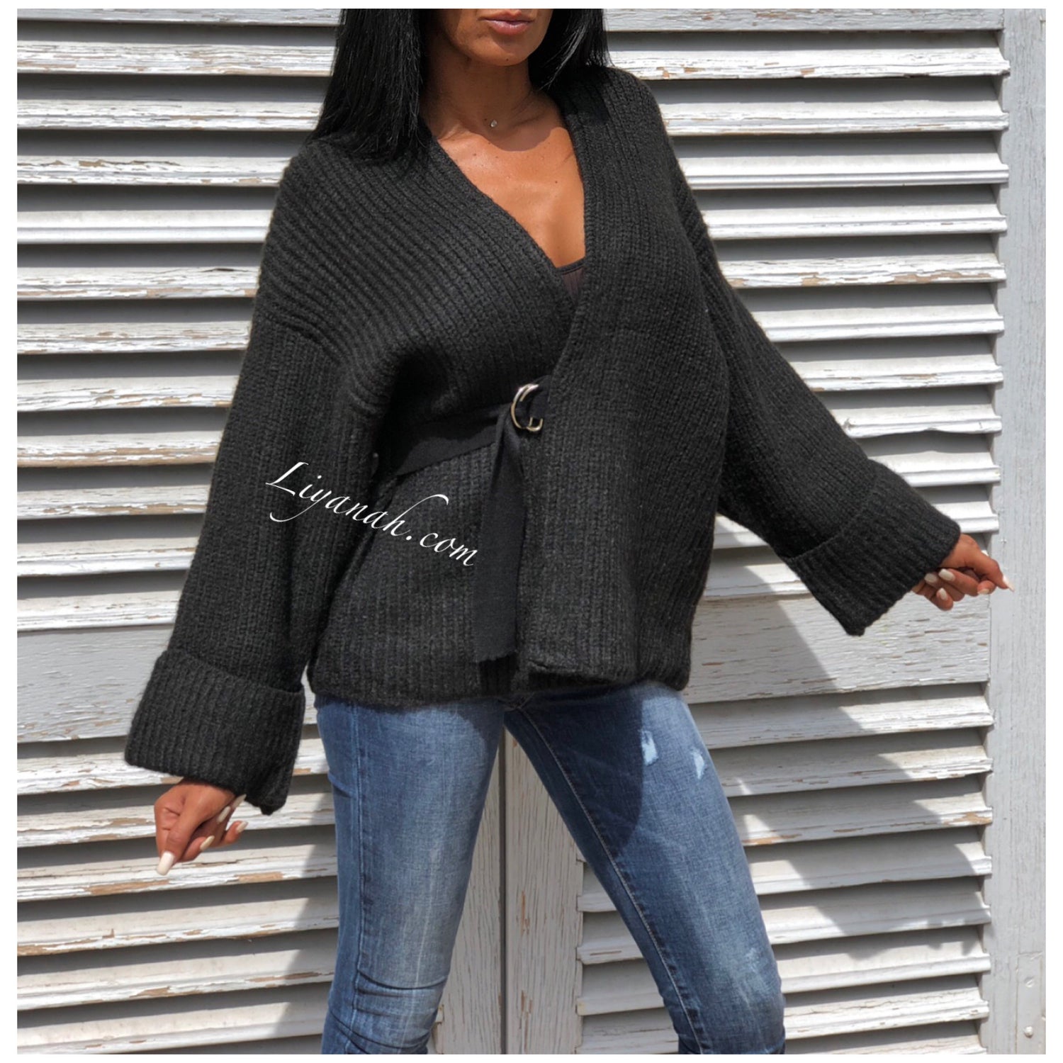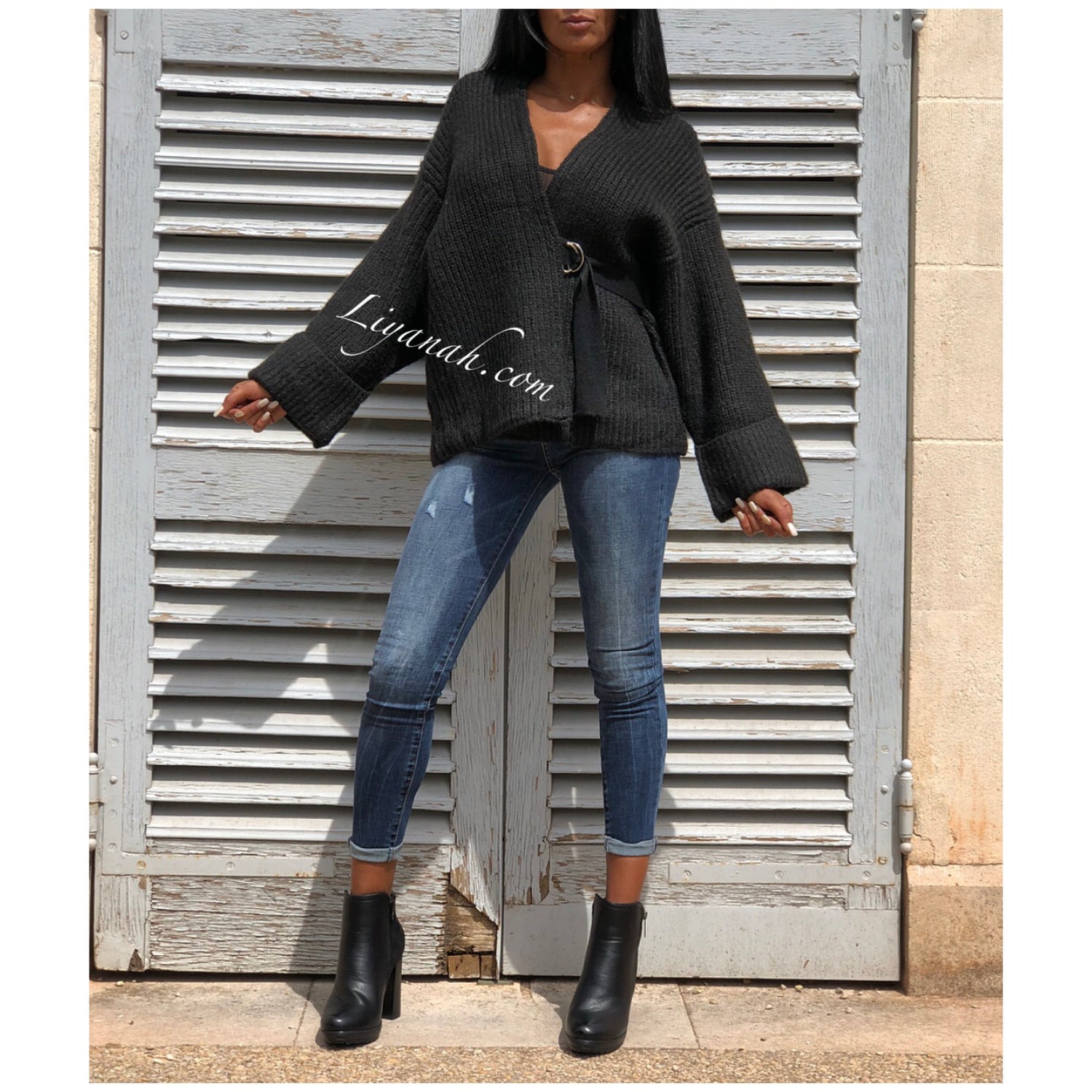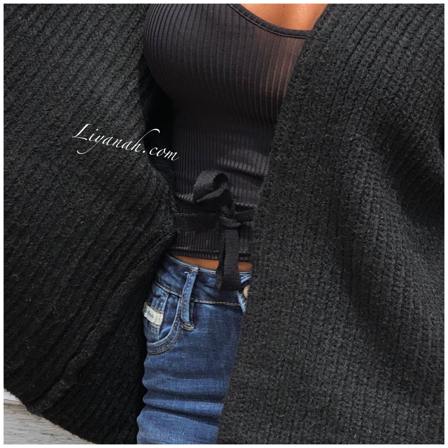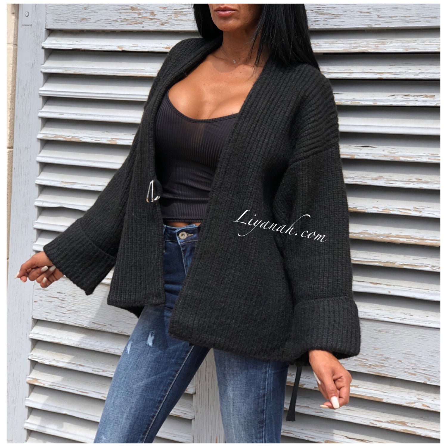Gilet Cache Cœur Modèle LYRILA NOIR Gilet en maille épaisse, tout doux et tout chaud 🌸 coupe courte oversize et manches larges - noeud intérieur et extérieur avec anneaux ✖️ Longueur : 72 cm - 20% LAINE 30% Viscose 50% Acrylique - Taille SM ou ML ❤️ POUR UN STYLE DÉCONTRACTÉ AVEC ÉLÉGANCE