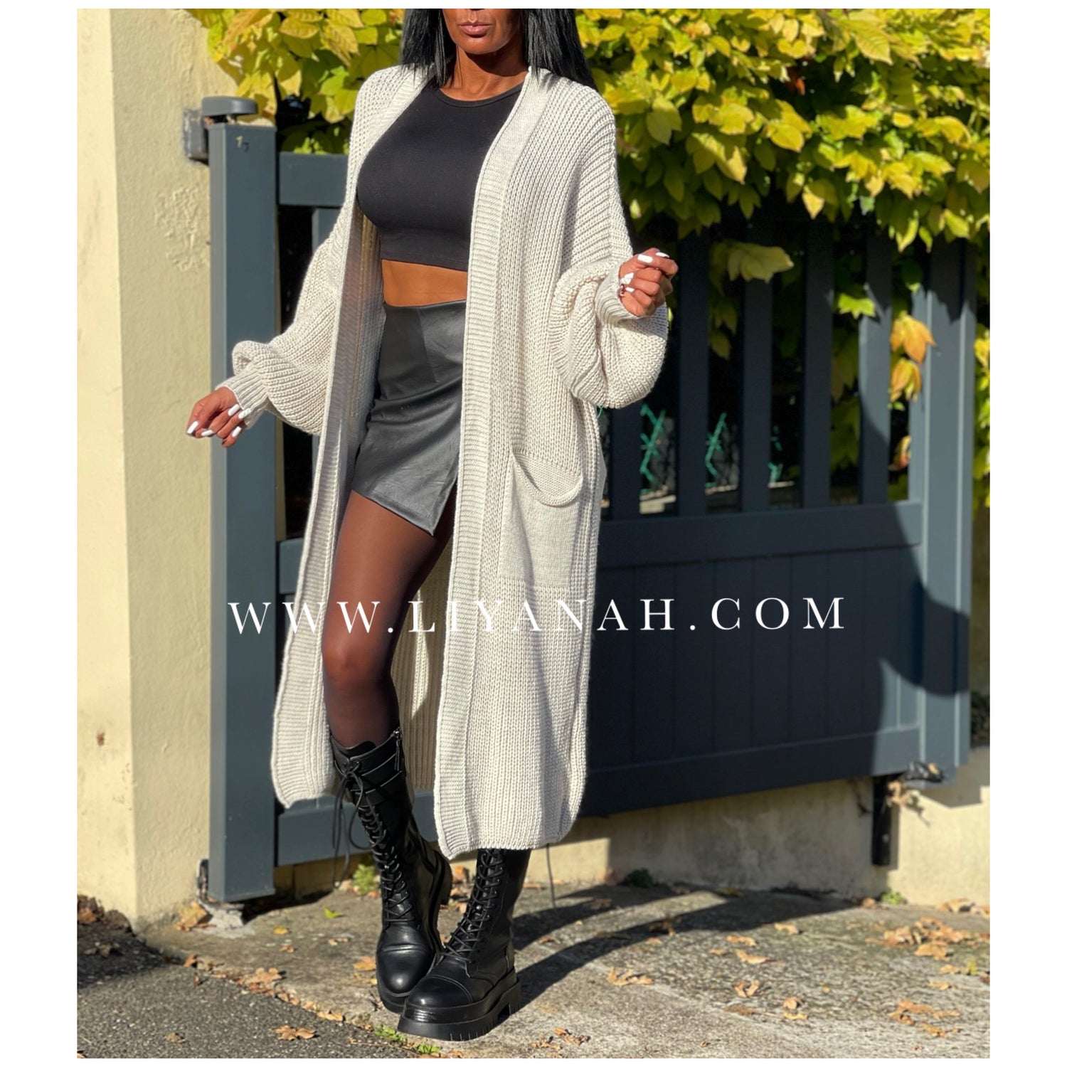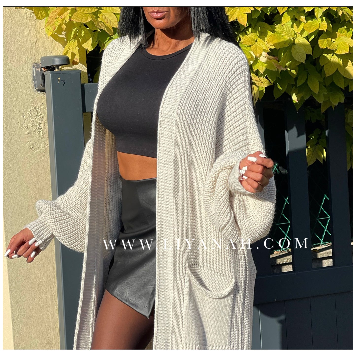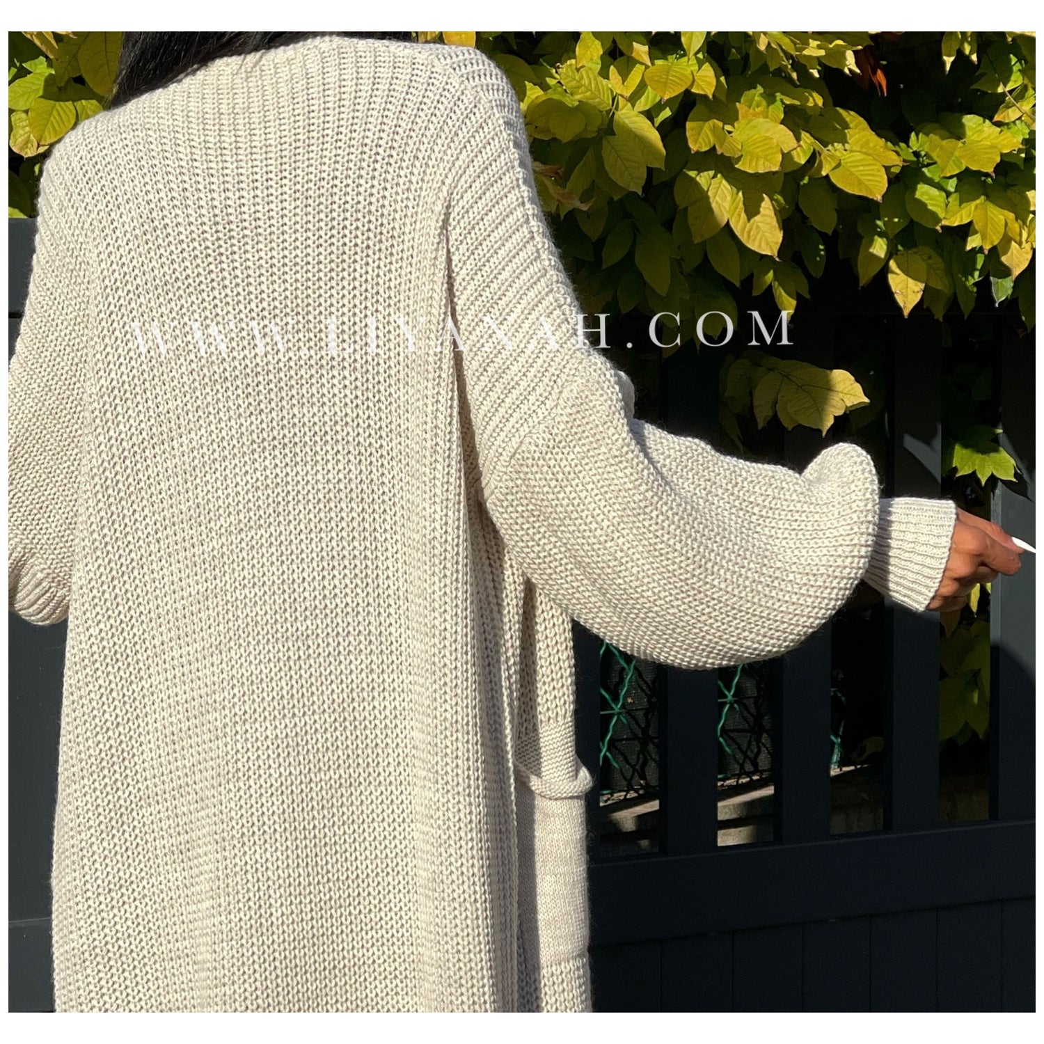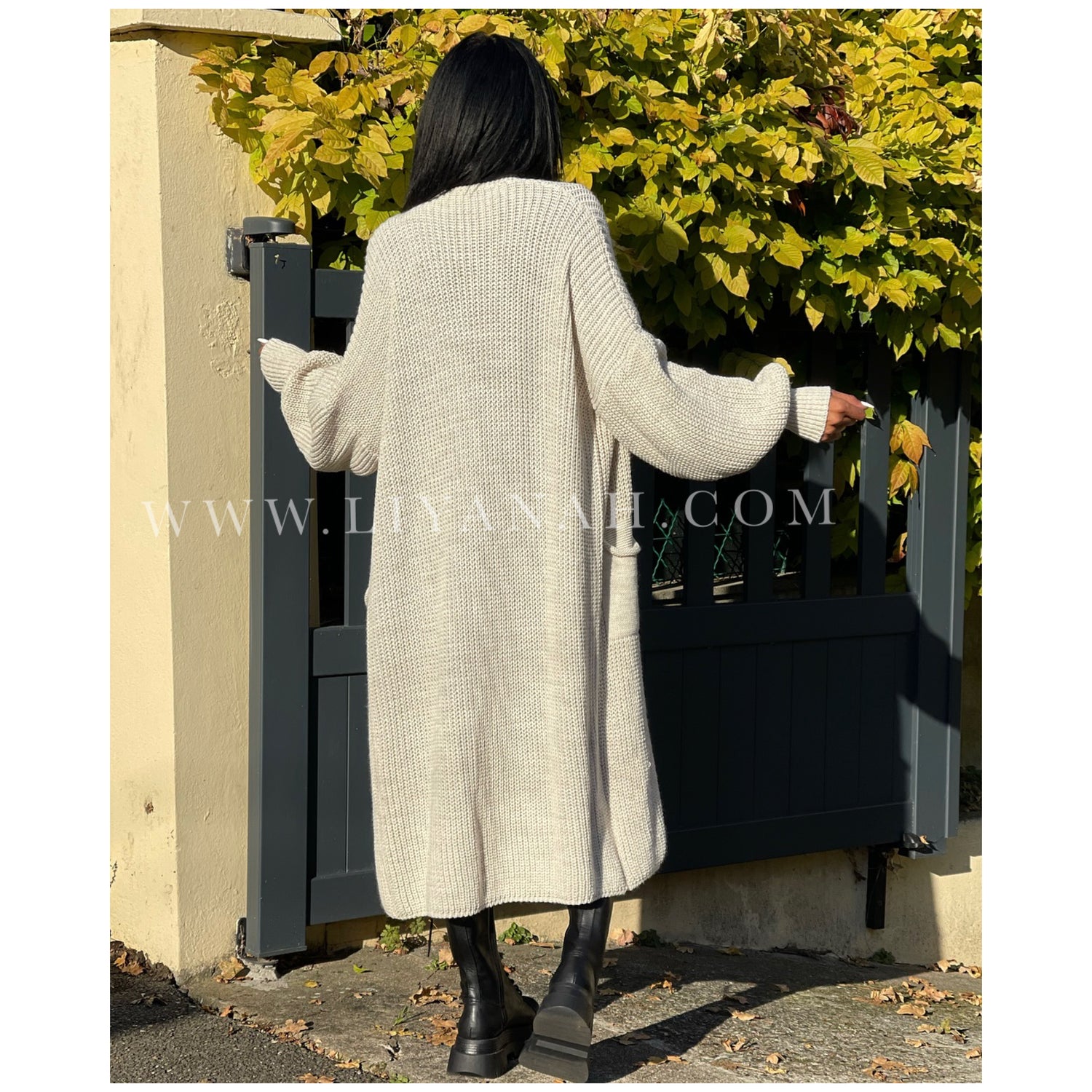 Gilet long et large, côtelé et 2 poches, manches bouffantes - TAILLE UNIQUE DU 34 au 40 - 100% Acrylique - Notre Modèle fait une taille 34 et mesure 1m70