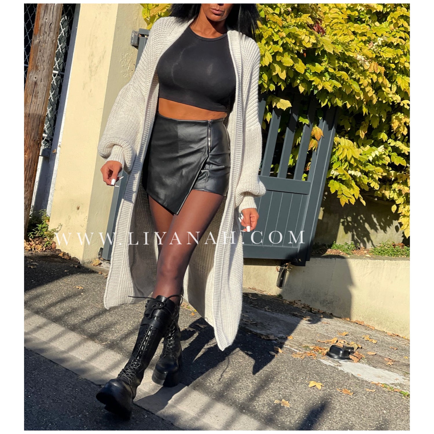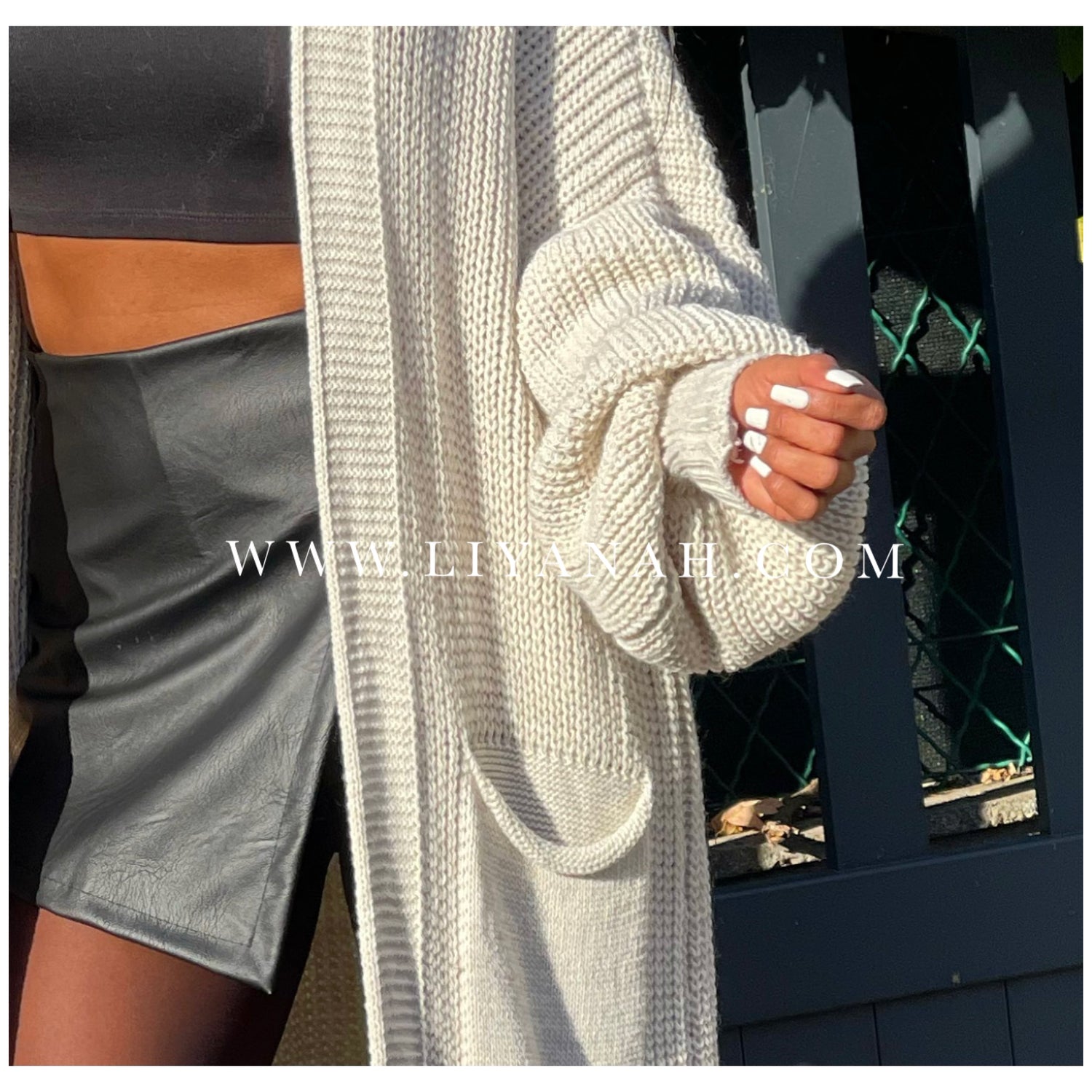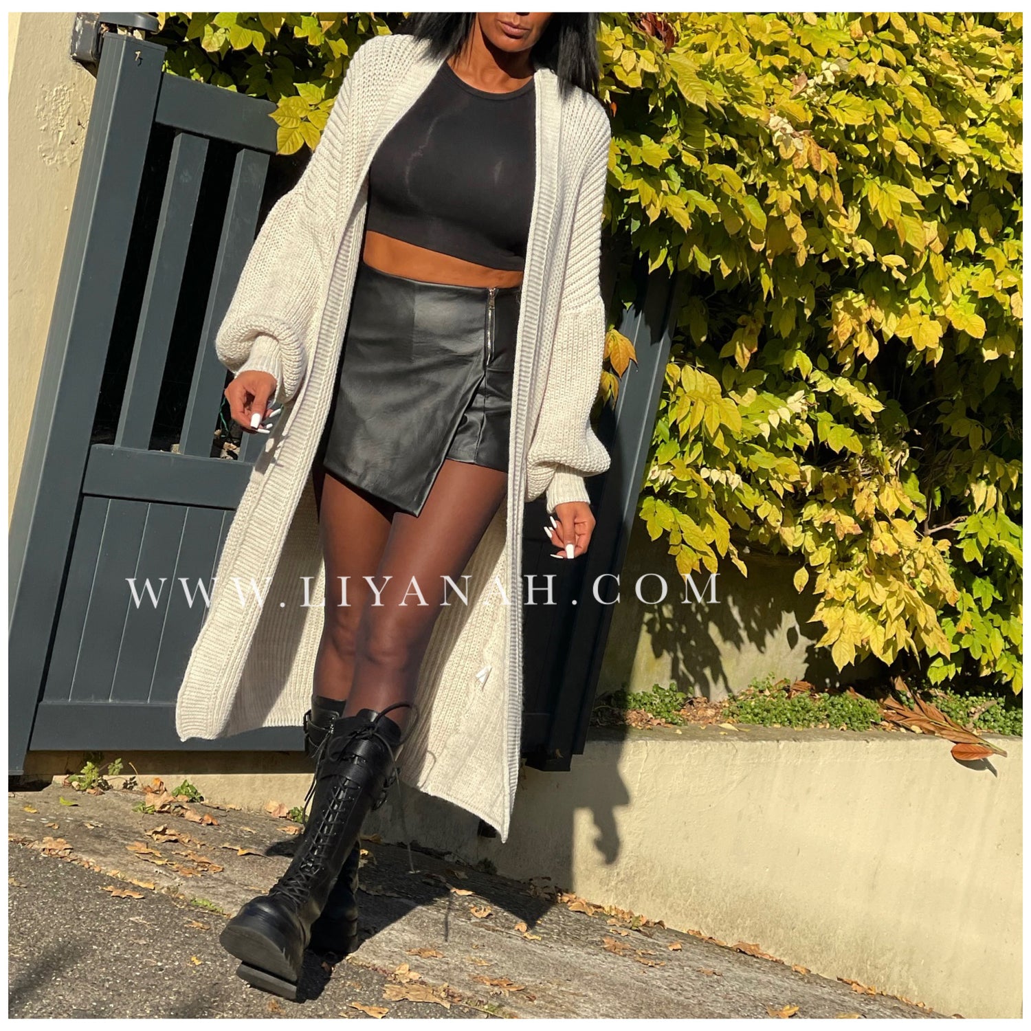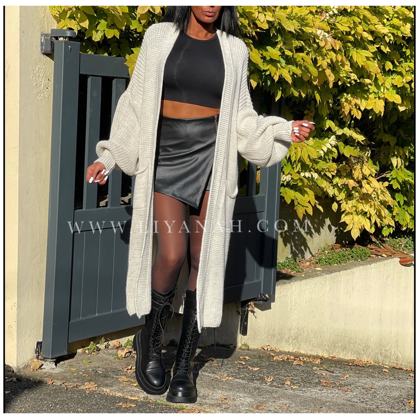 Gilet long et large, côtelé et 2 poches, manches bouffantes - TAILLE UNIQUE DU 34 au 40 - 100% Acrylique - Notre Modèle fait une taille 34 et mesure 1m70