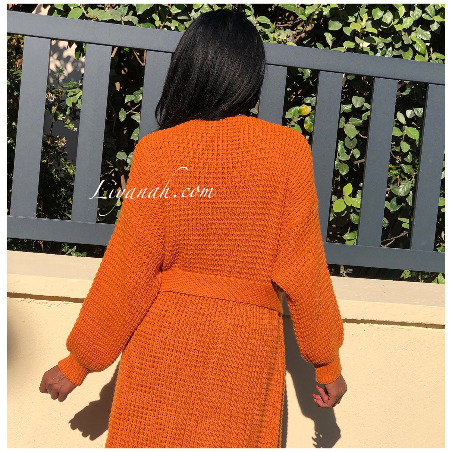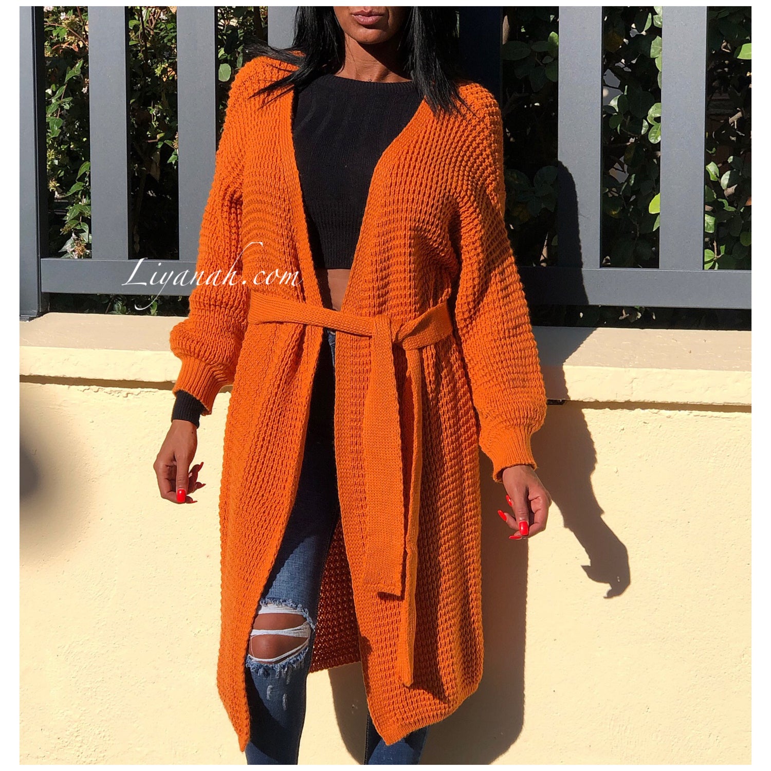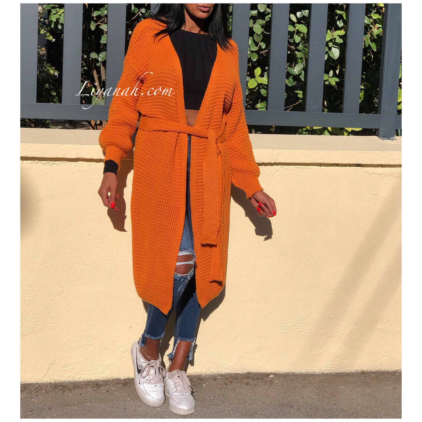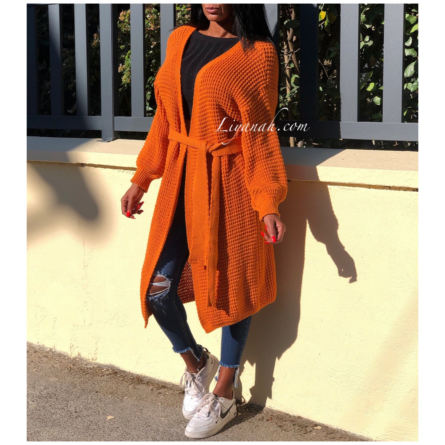 Gilet Modèle LAURA ORANGE - Gillet mi-long en maille épaisse, manches longues et noeud à nouer non fixe - 100% Acrylique - modèle Oversize (Taille Unique du 34 au 42)