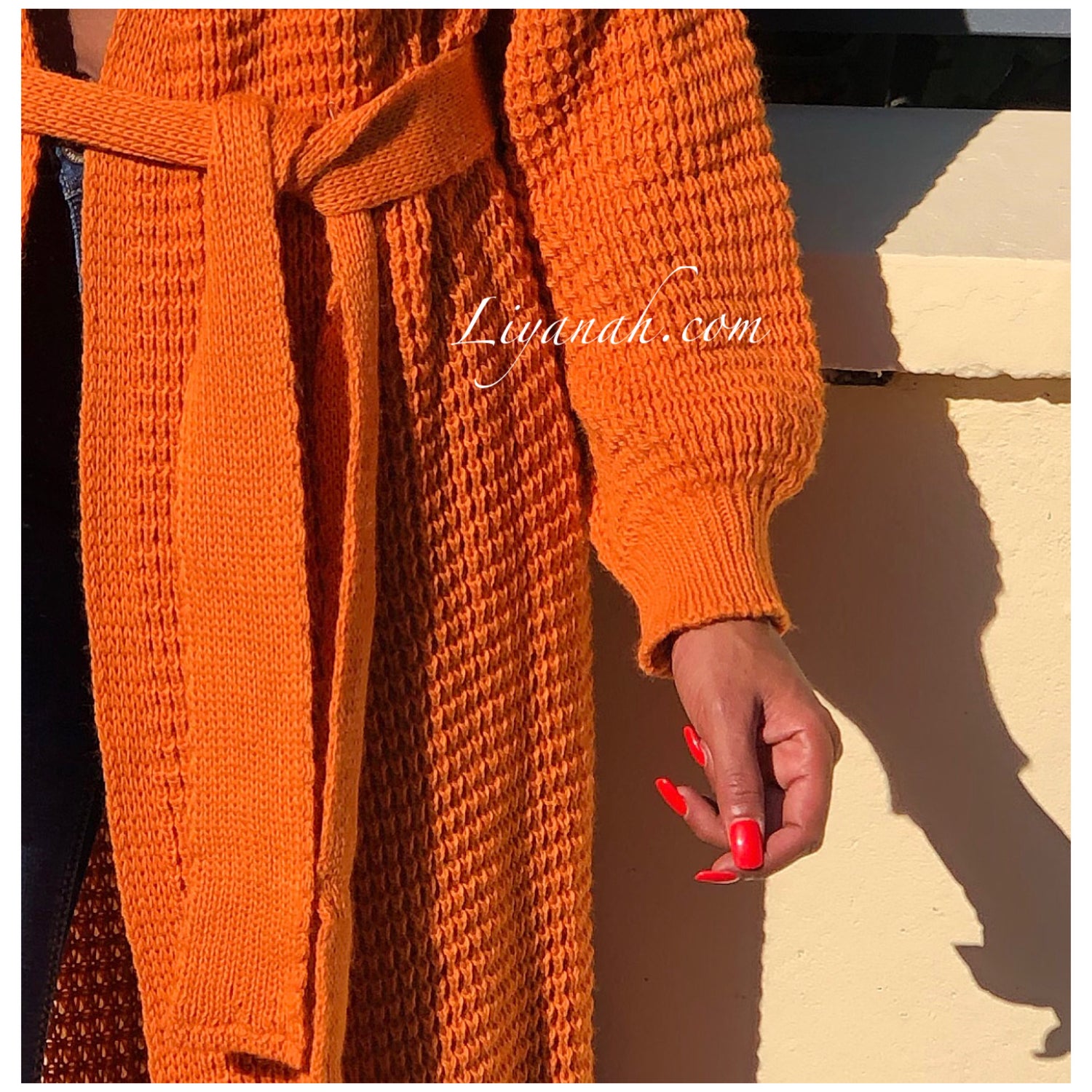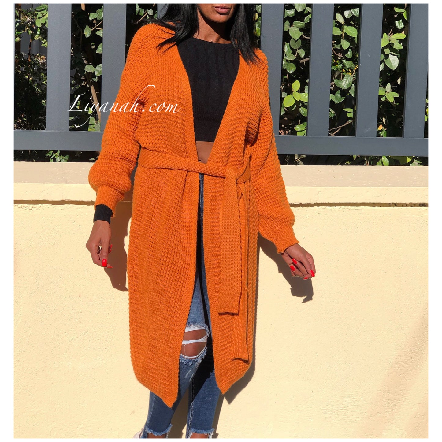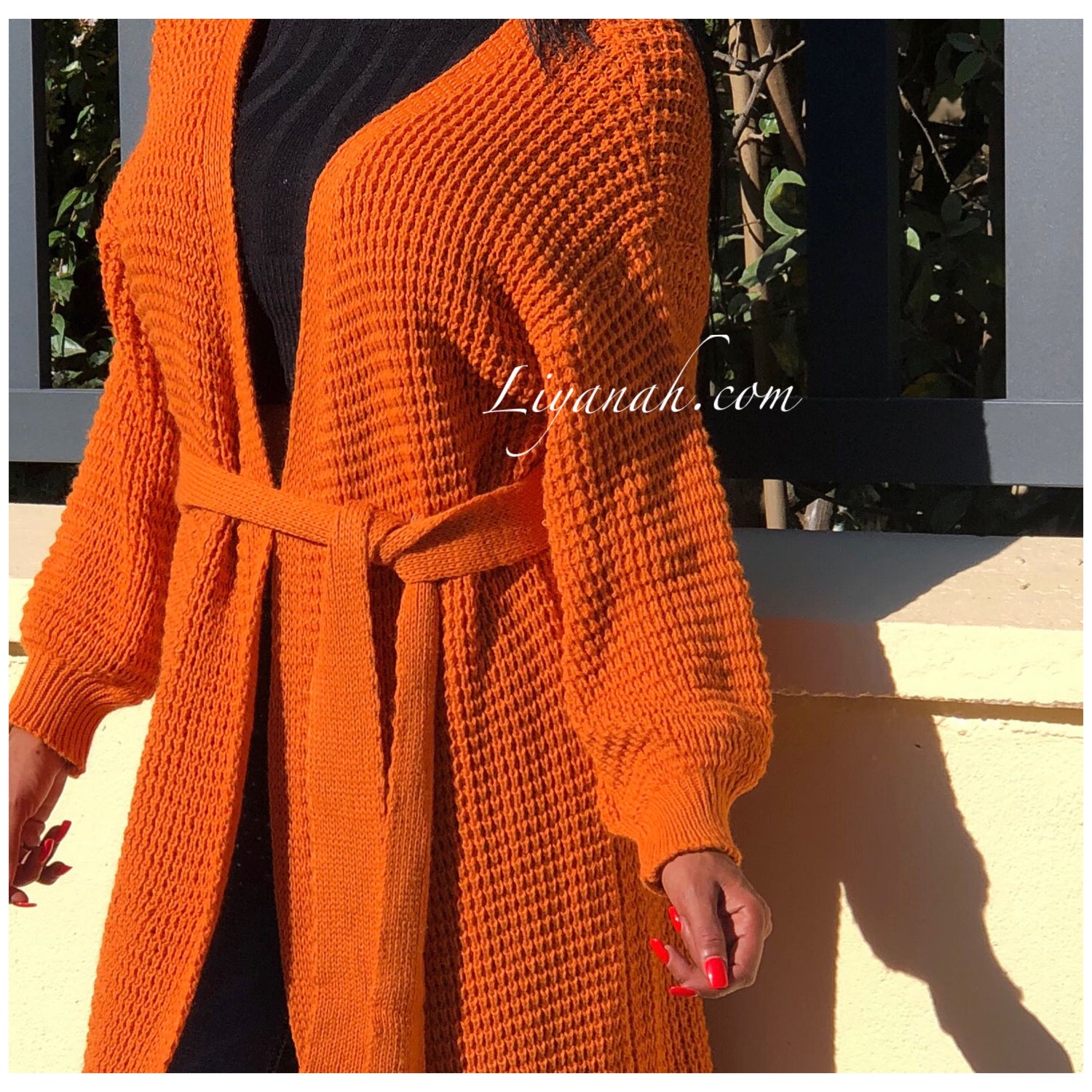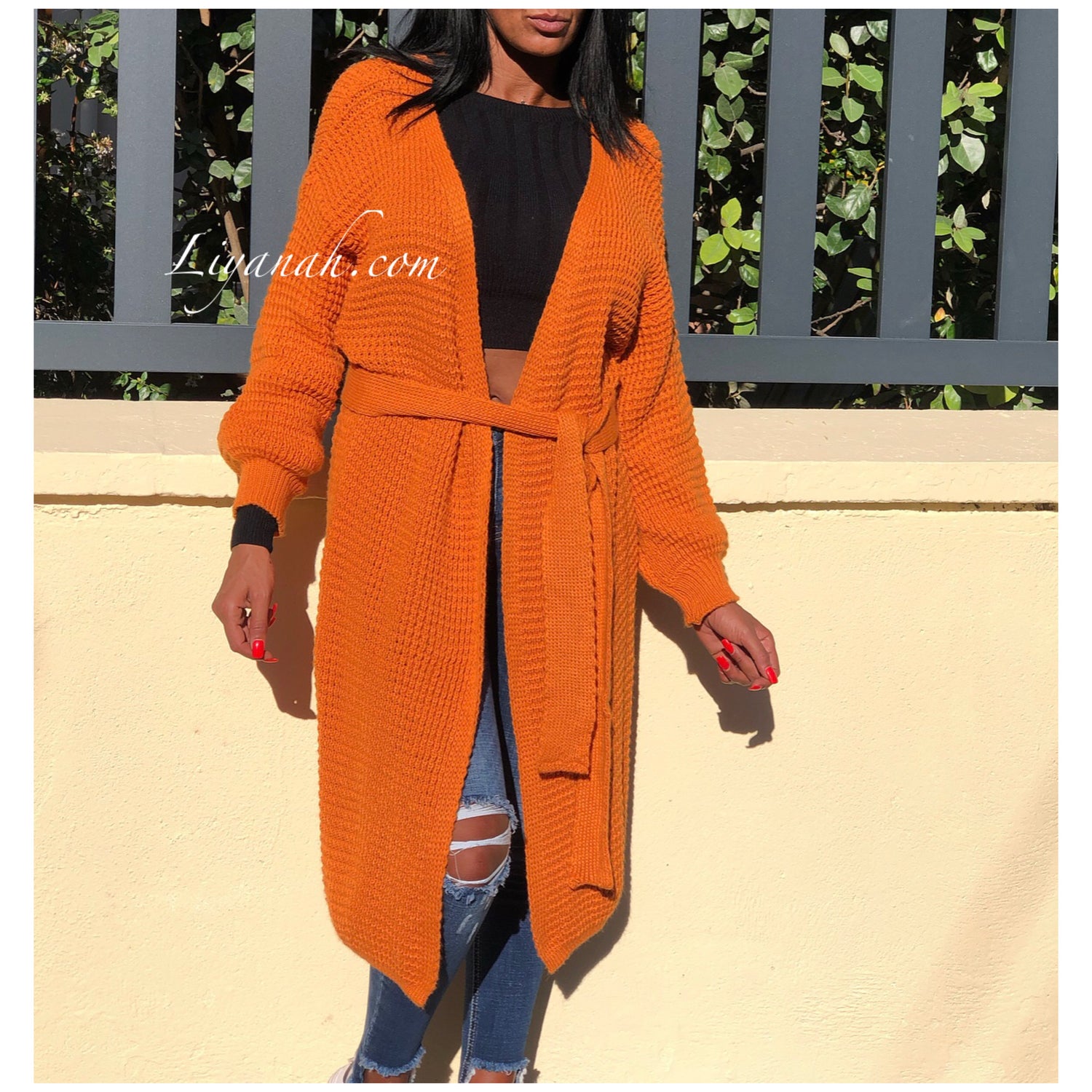 Gilet Modèle LAURA ORANGE - Gillet mi-long en maille épaisse, manches longues et noeud à nouer non fixe - 100% Acrylique - modèle Oversize (Taille Unique du 34 au 42)