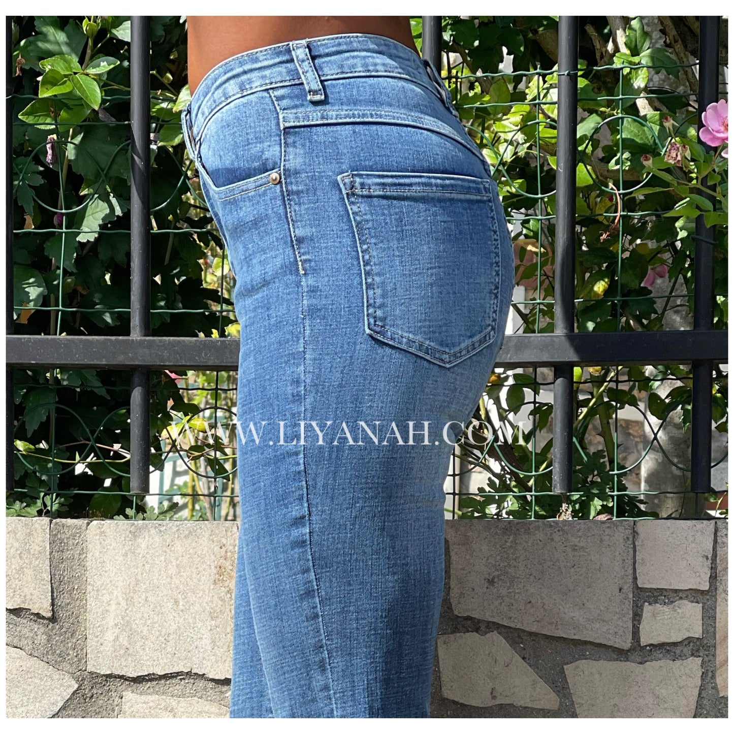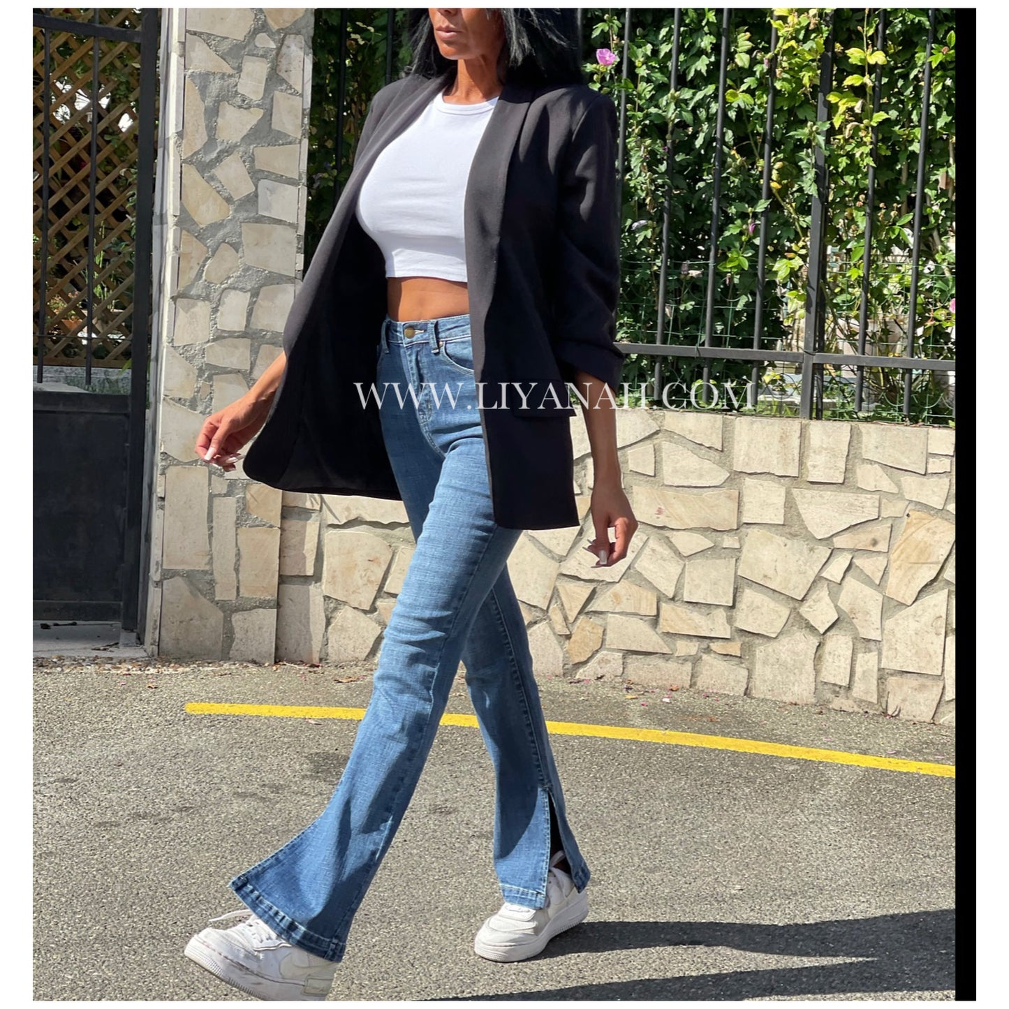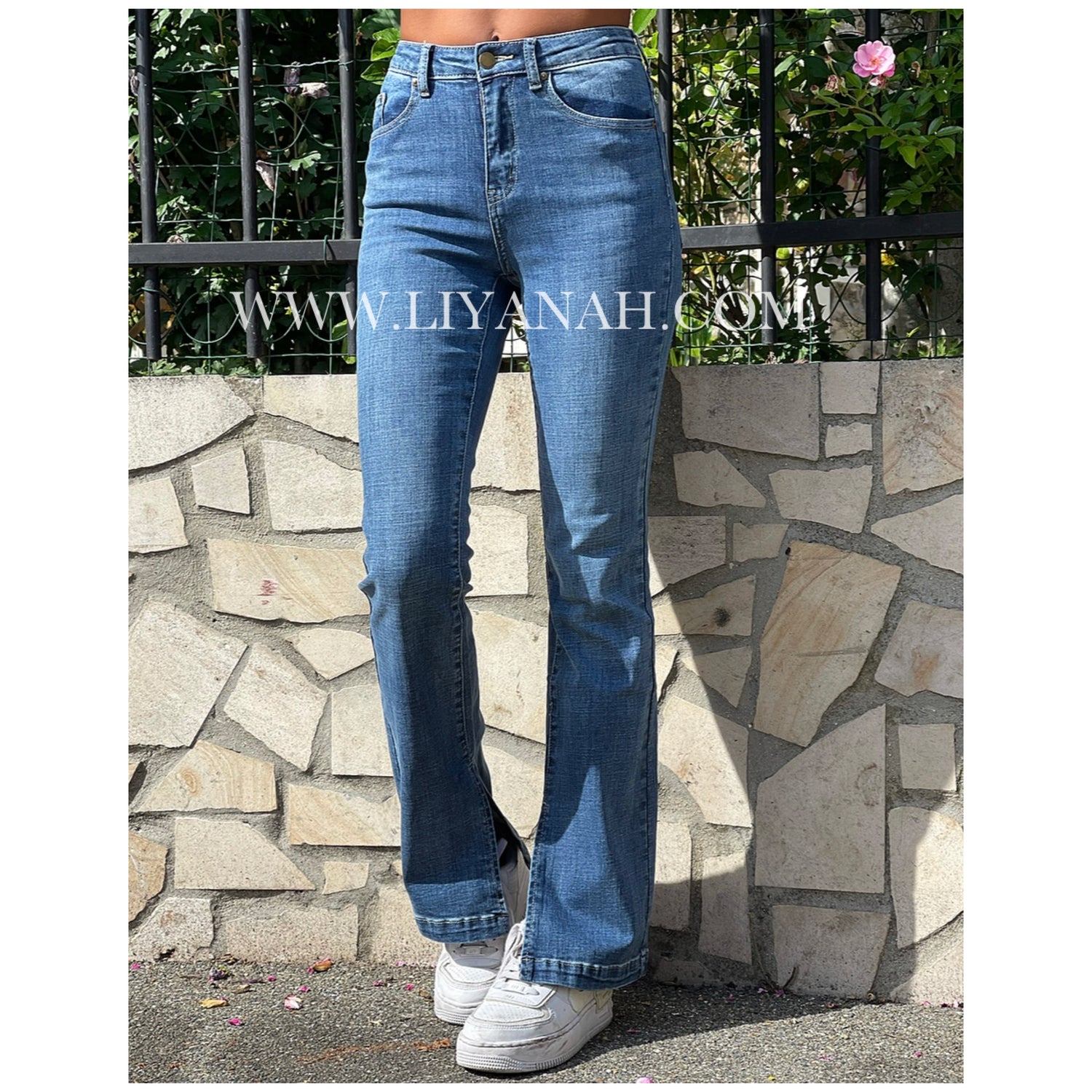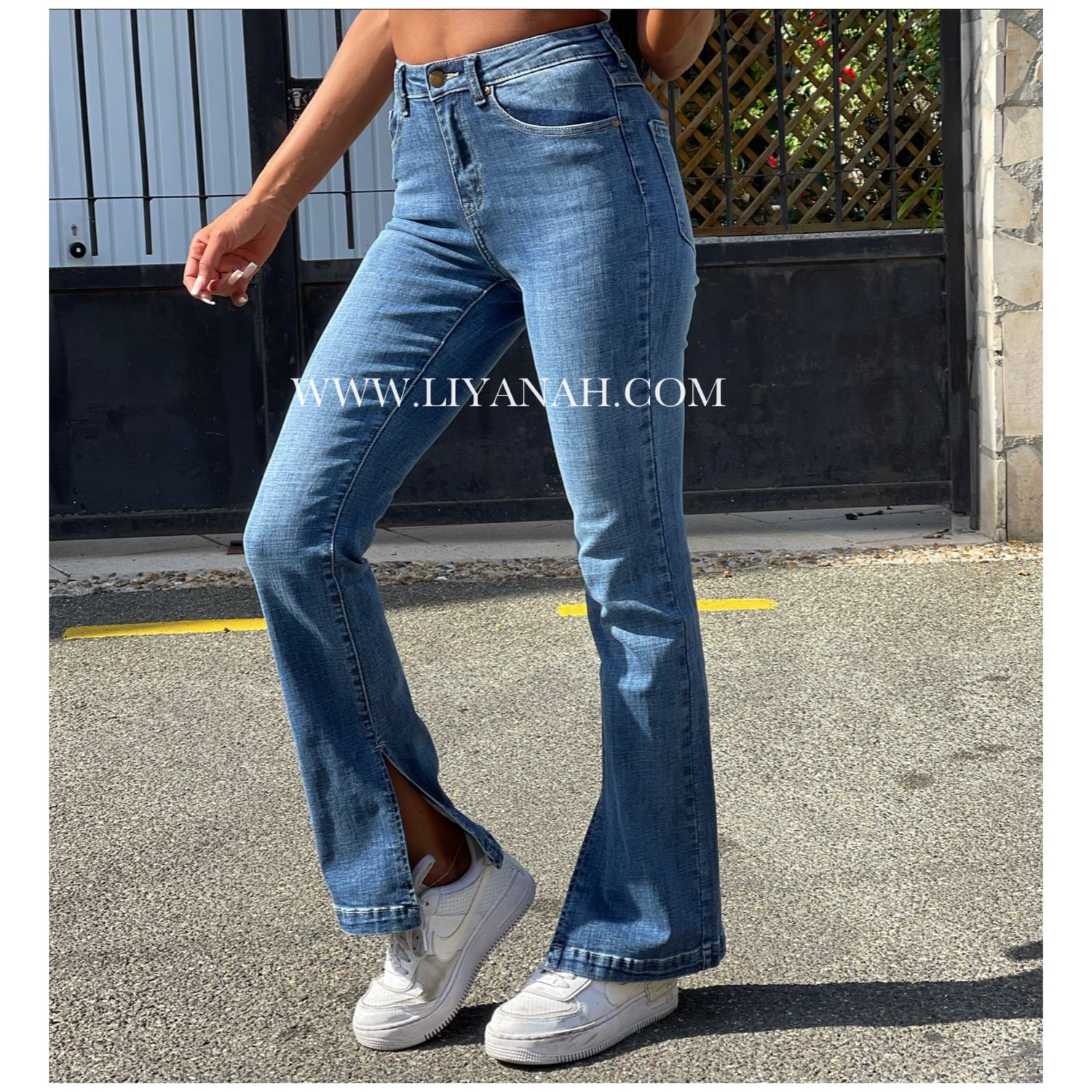 Jean coupe évasée et ourlet fendu , près du corps puis évasée cheville, fermeture bouton, couleur bleu - FLARE FIT SPLIT HEM - 95% Coton 2% Elasthanne 3% Polyester - Taille haute - Du XS au XL