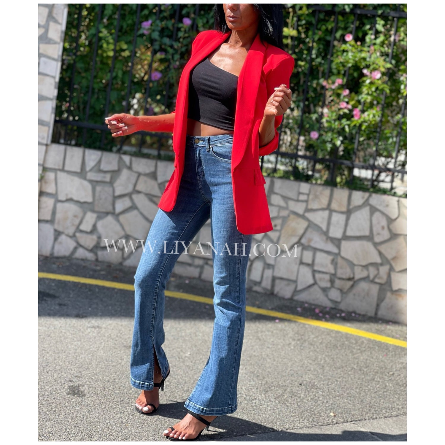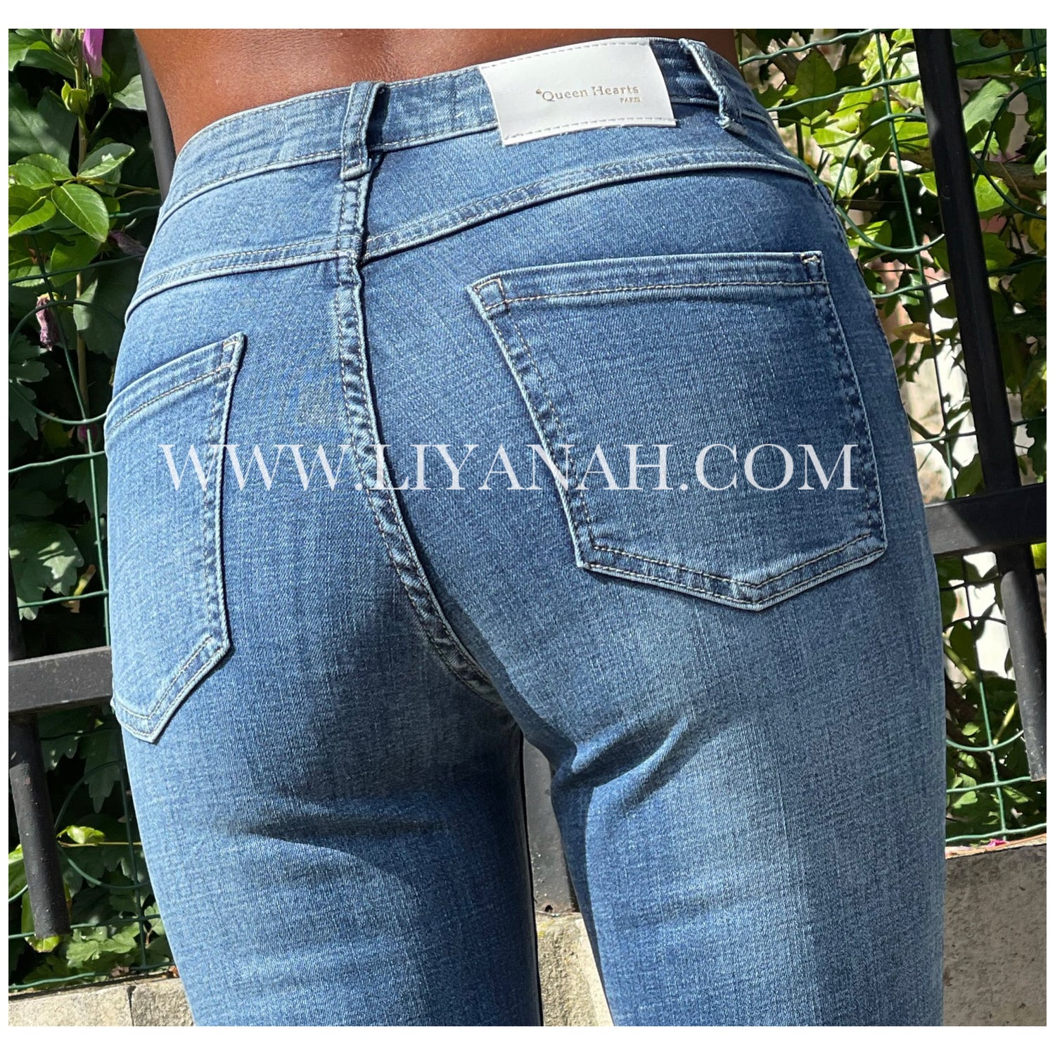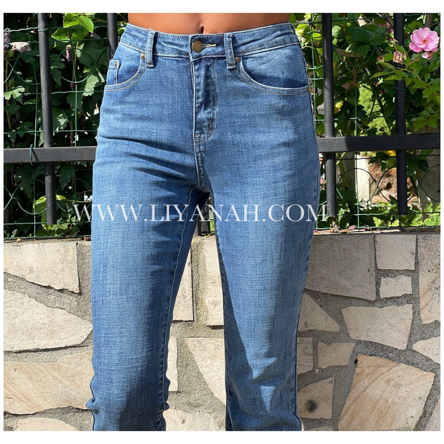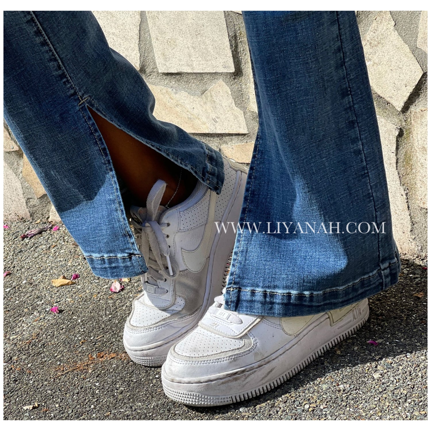 Jean coupe évasée et ourlet fendu , près du corps puis évasée cheville, fermeture bouton, couleur bleu - FLARE FIT SPLIT HEM - 95% Coton 2% Elasthanne 3% Polyester - Taille haute - Du XS au XL