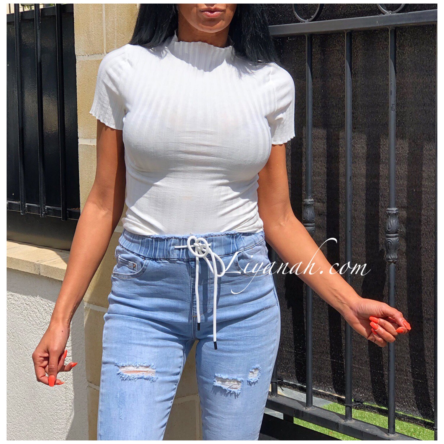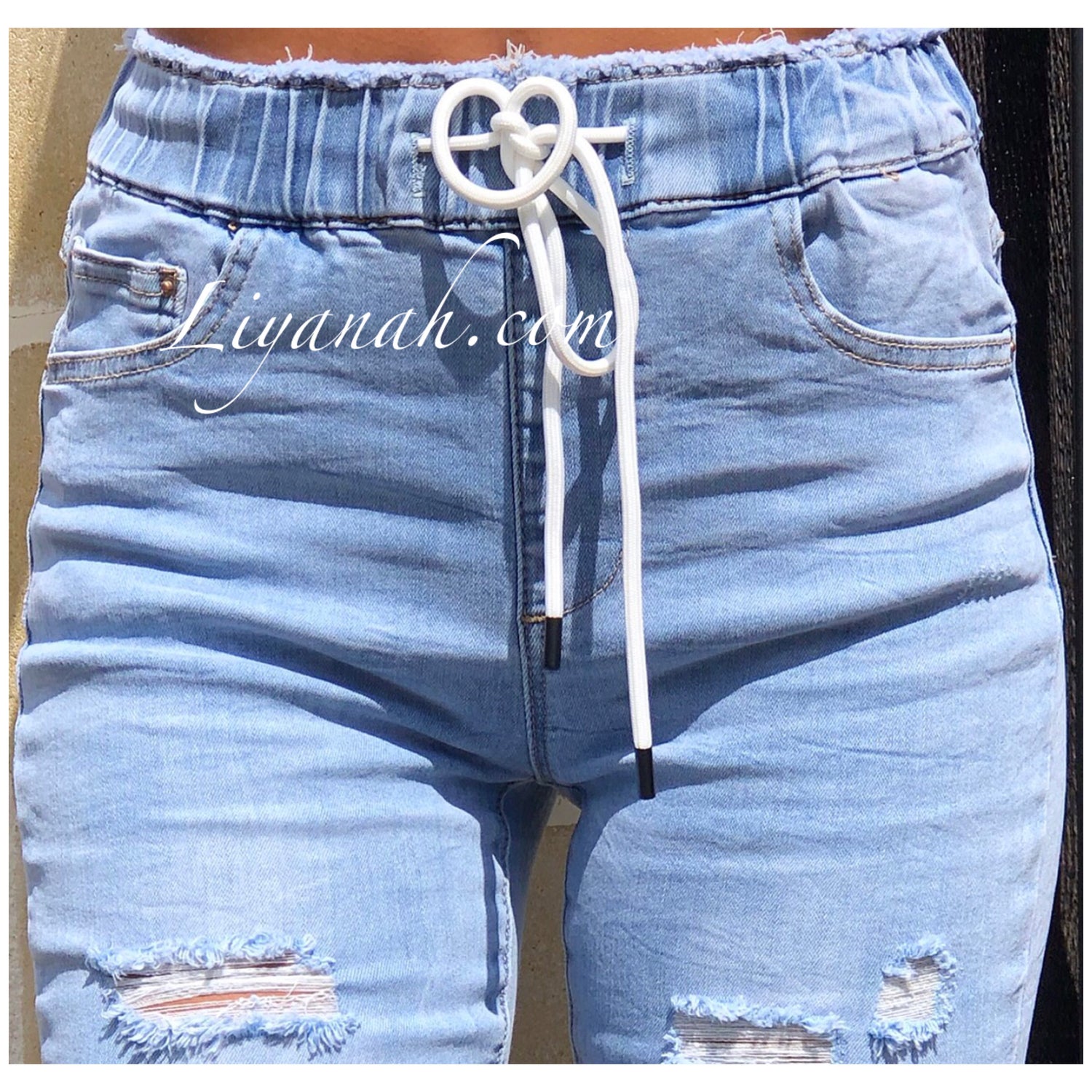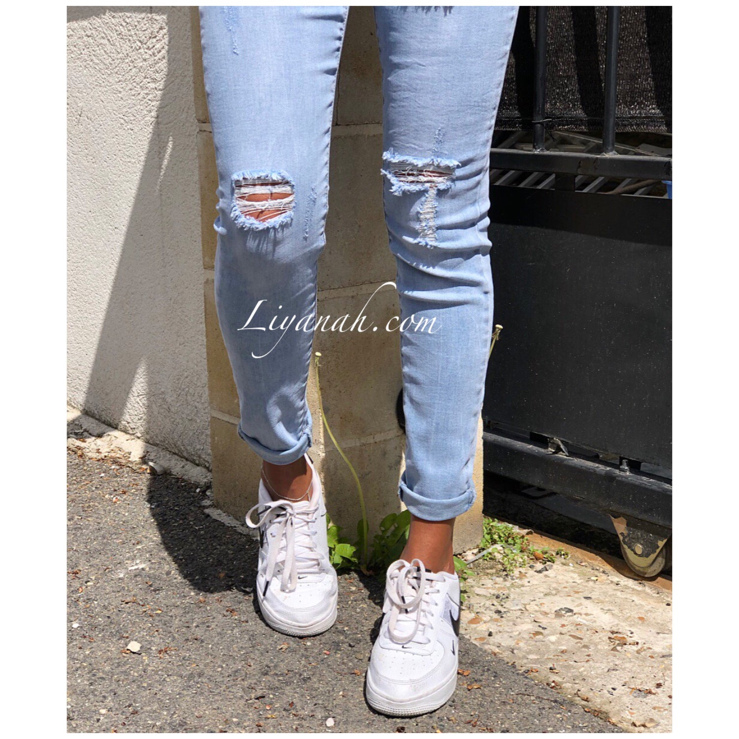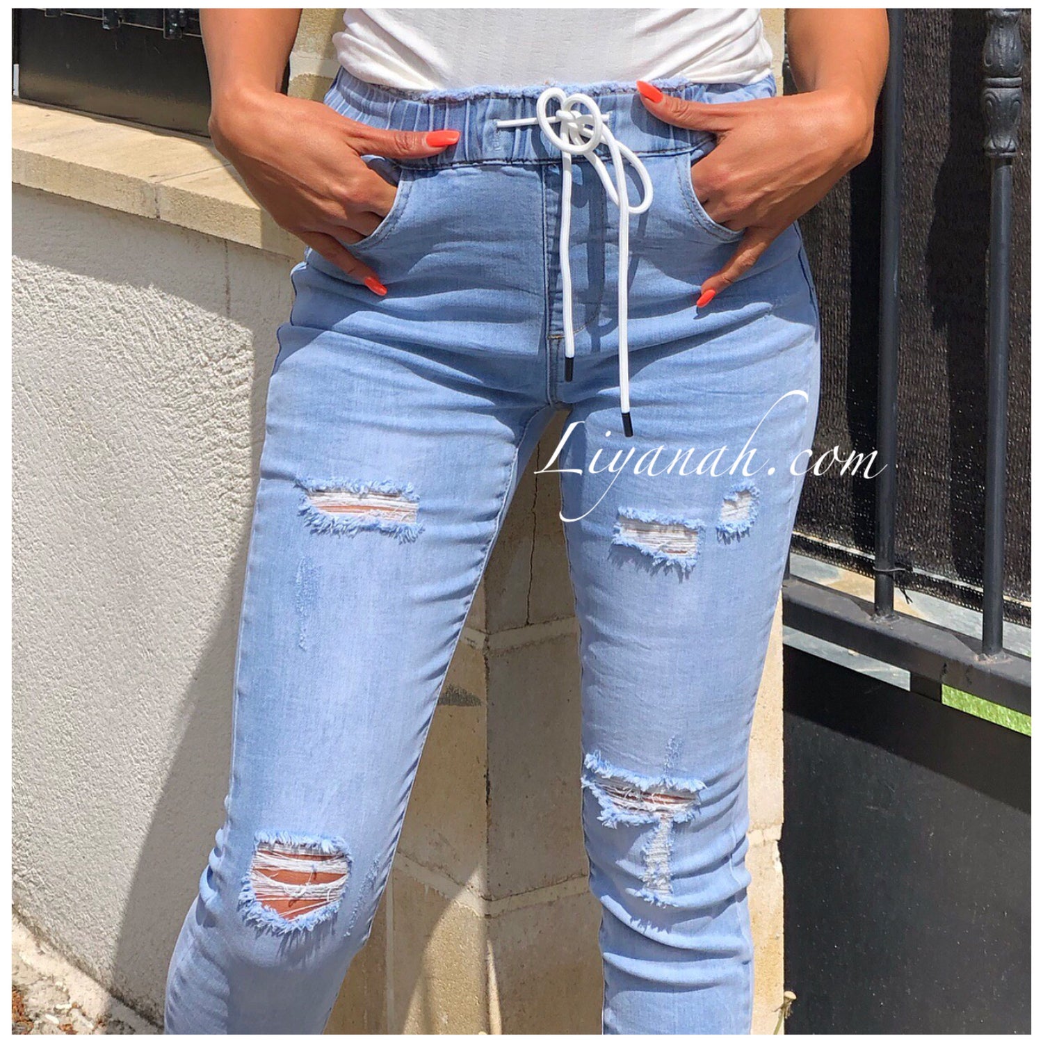 Jean / Jegging Skinny Modèle GAYA LIGHT BLUE Taille MI-HAUTE - Modèle à enfiler, élastique à la taille et cordon pour resserrer - Ce modèle entre le jean et le jegging (Matière jean mais légère comme un legging ou jogging) ce modèle est une TAILLE MI-HAUTE - COULEUR : BLEU TRÈS CLAIR - légèrement destroy et revers cheville - Il s'adapte agréablement et très facilement à votre silhouette (DU XS AU XL) 72% COTON 26% Polyester 2% Elasthanne
