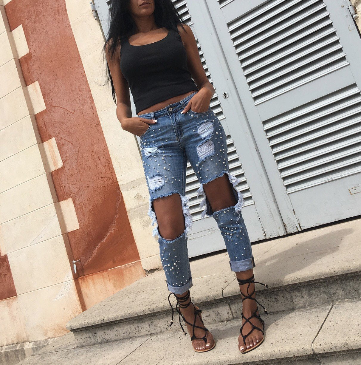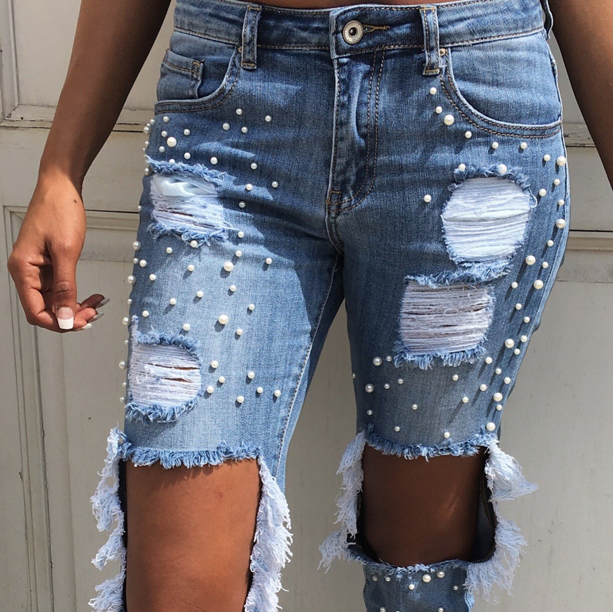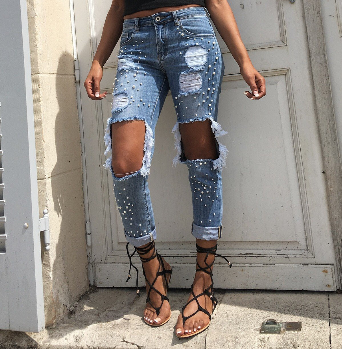 On est totalement dingue de ce jean destroy super chic avec ses détails perlés au top de la tendance !!!!