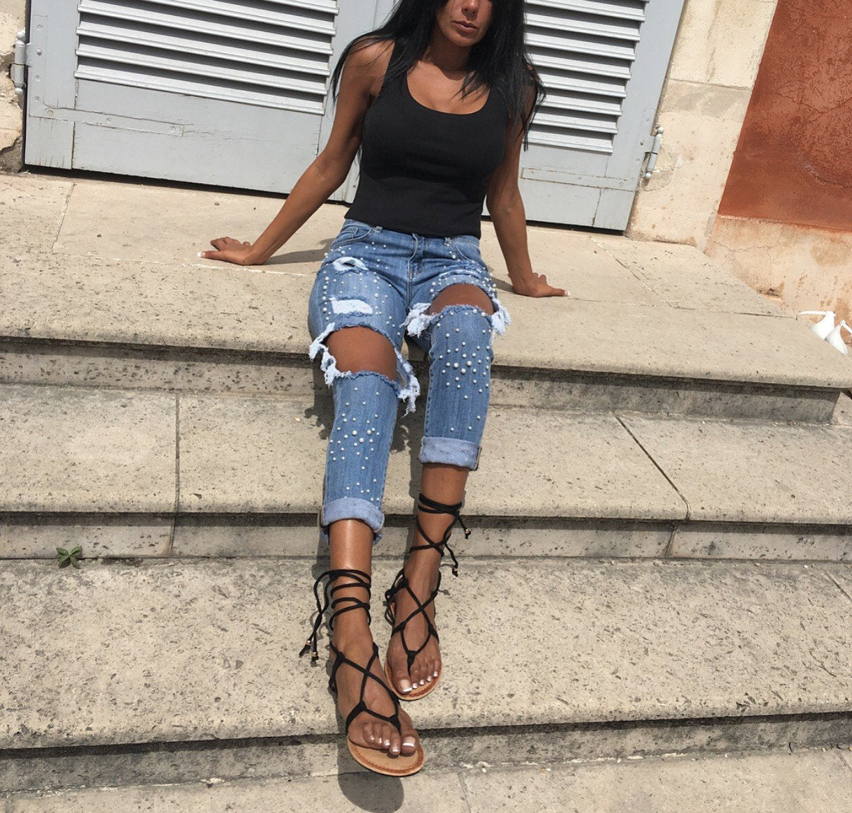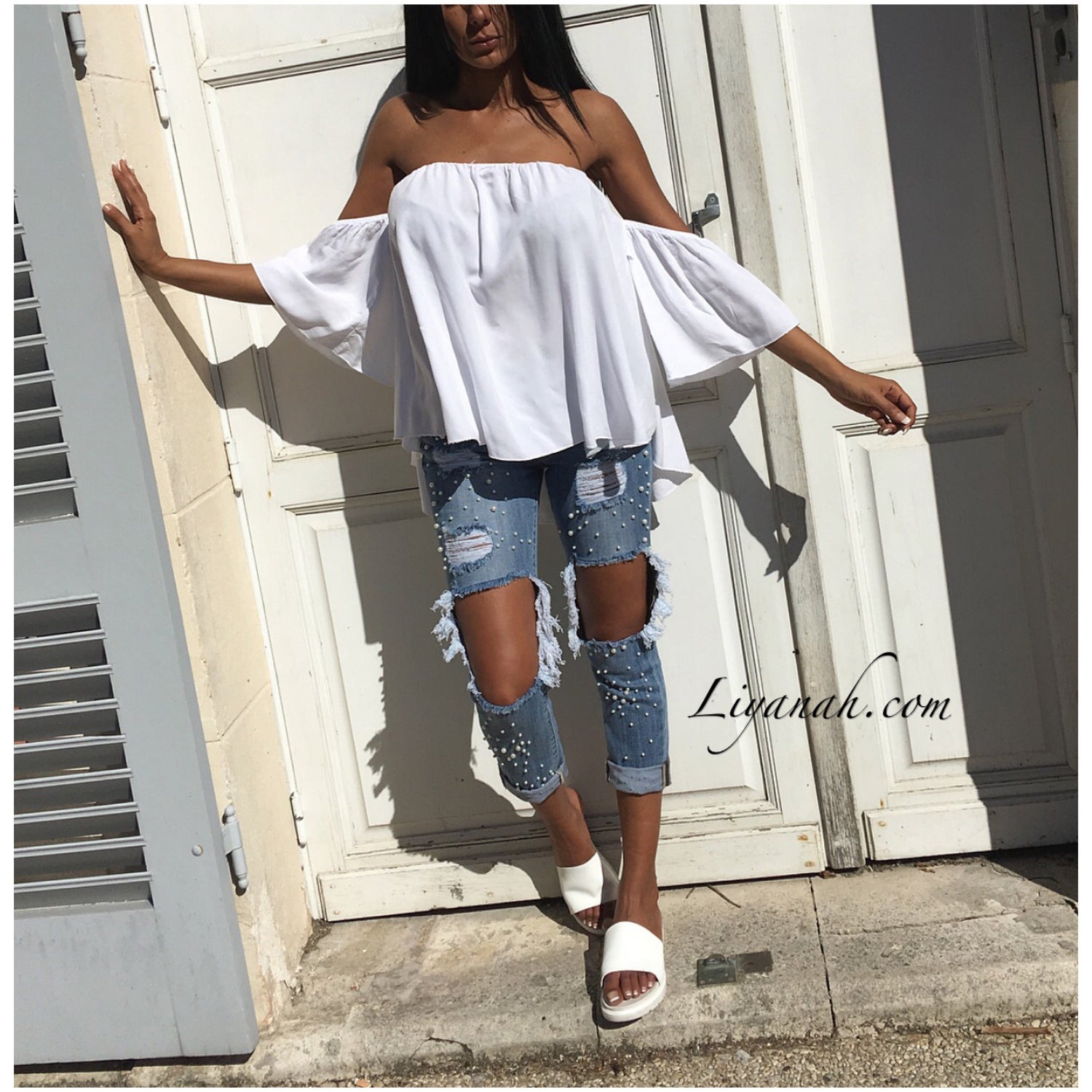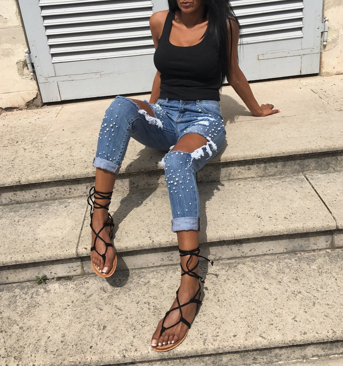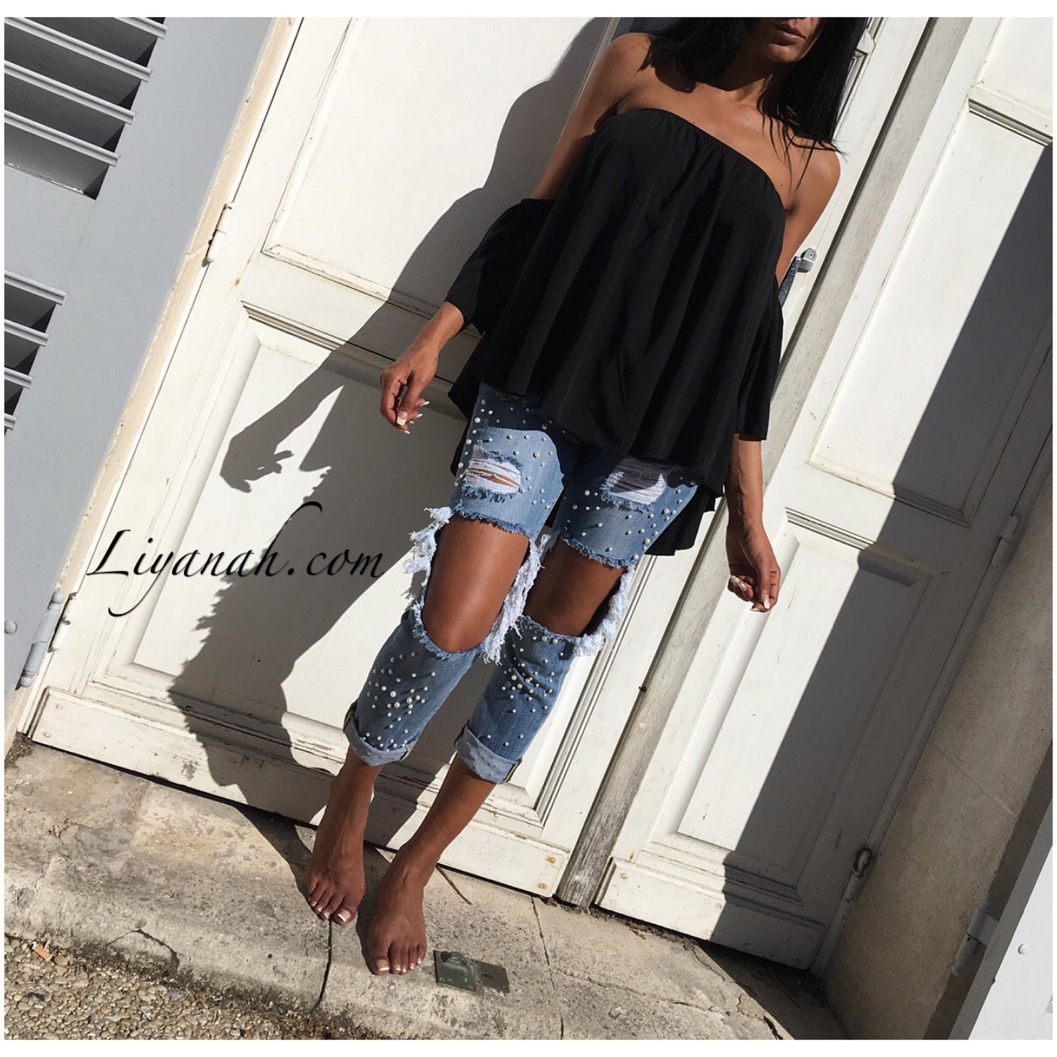 On est totalement dingue de ce jean destroy super chic avec ses détails perlés au top de la tendance !!!!