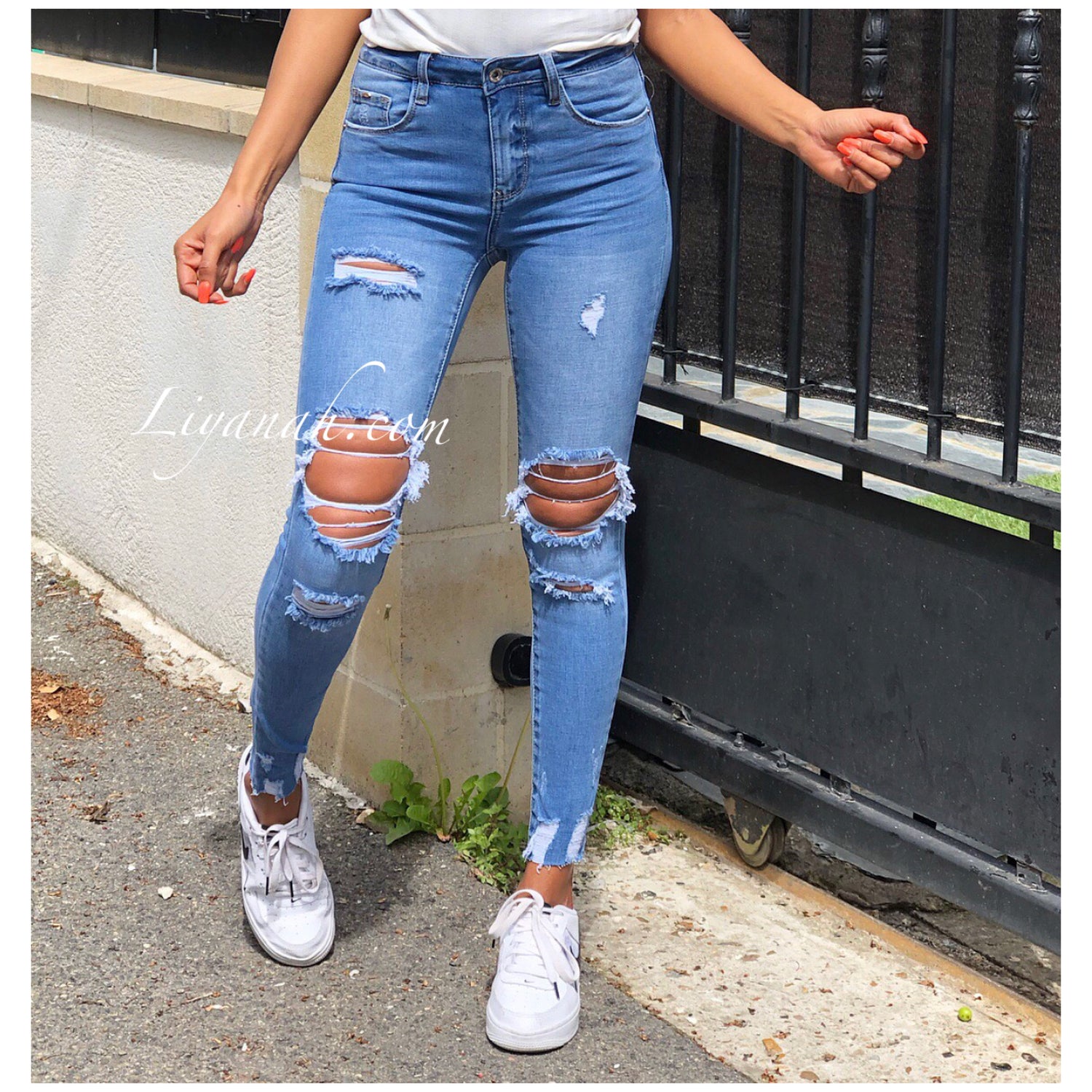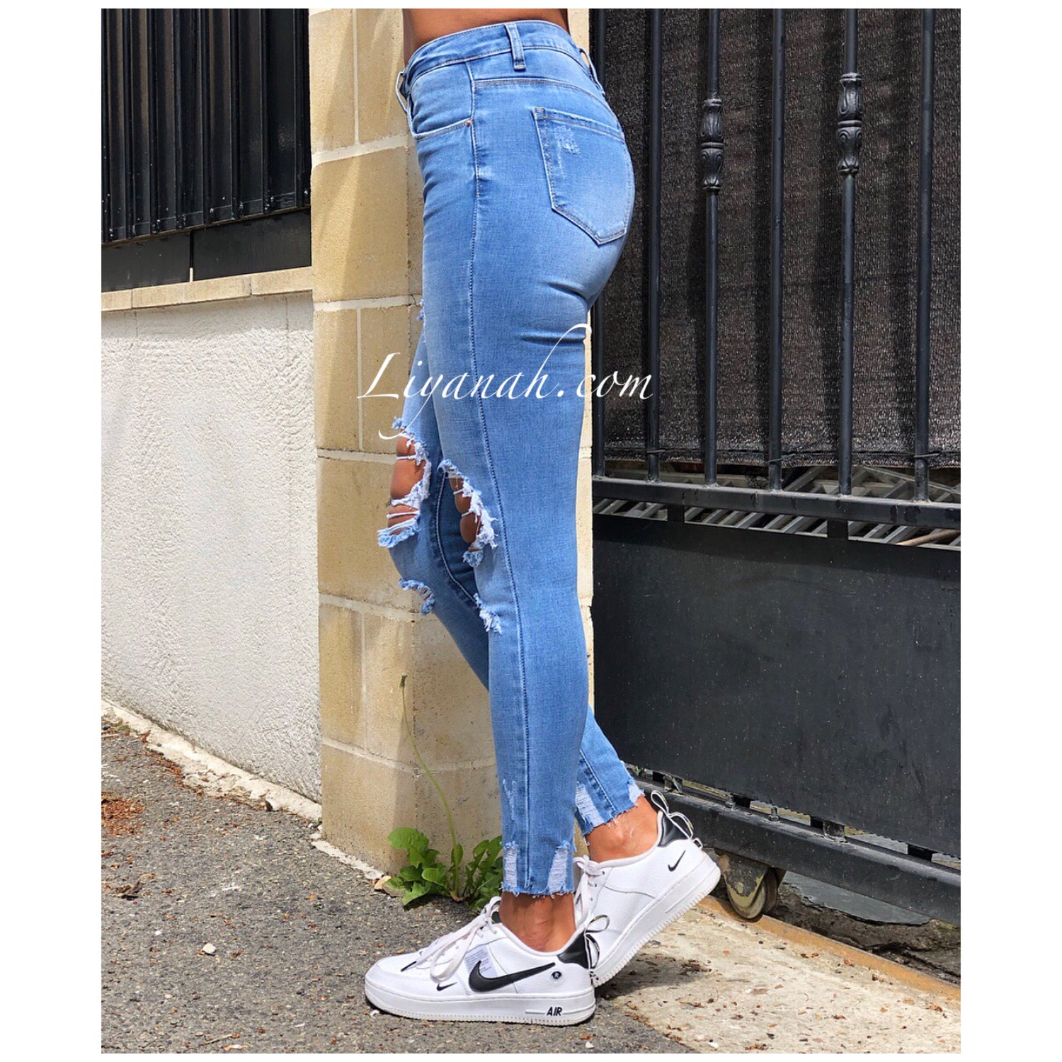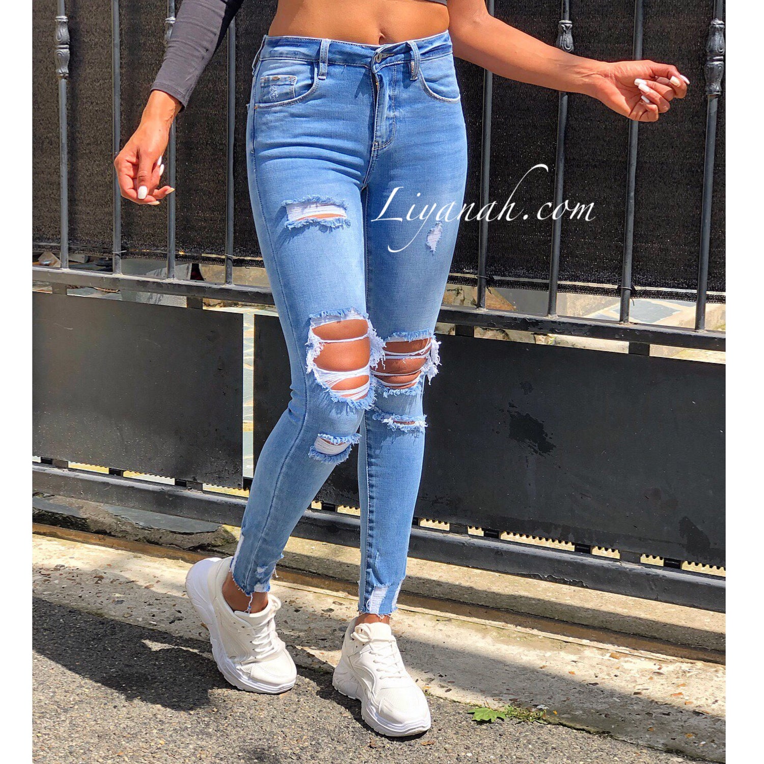 Jean Skinny DESTROY BLUE Modèle FOZARA Détails : Déchirures !!! Taille Normal sur le nombril - Women's Blue Jeans (Bleu) Coupe droite, Jean SKINNY - Coupe près du corps !!! 90% COTTON 8% Polyester 2% Elasthanne (Du XS au XL)