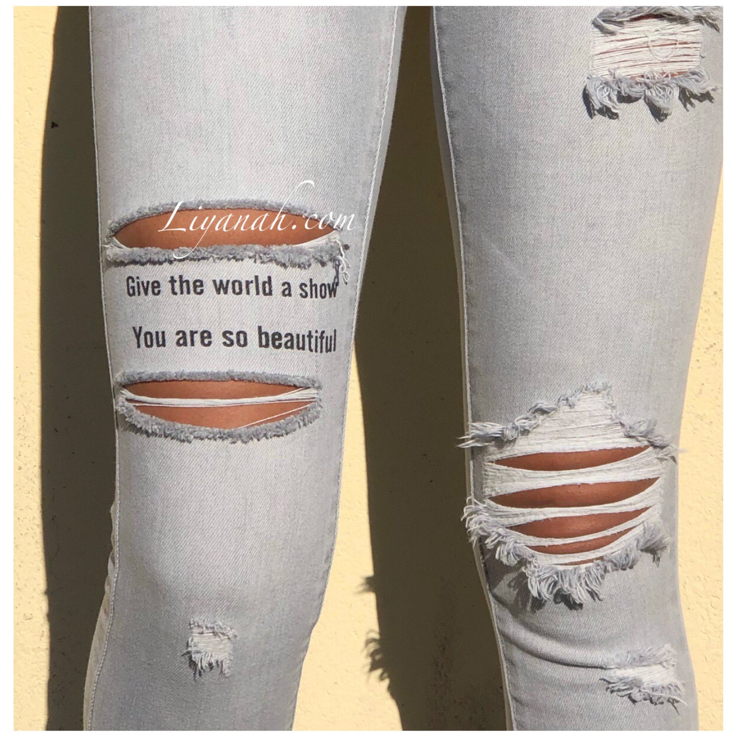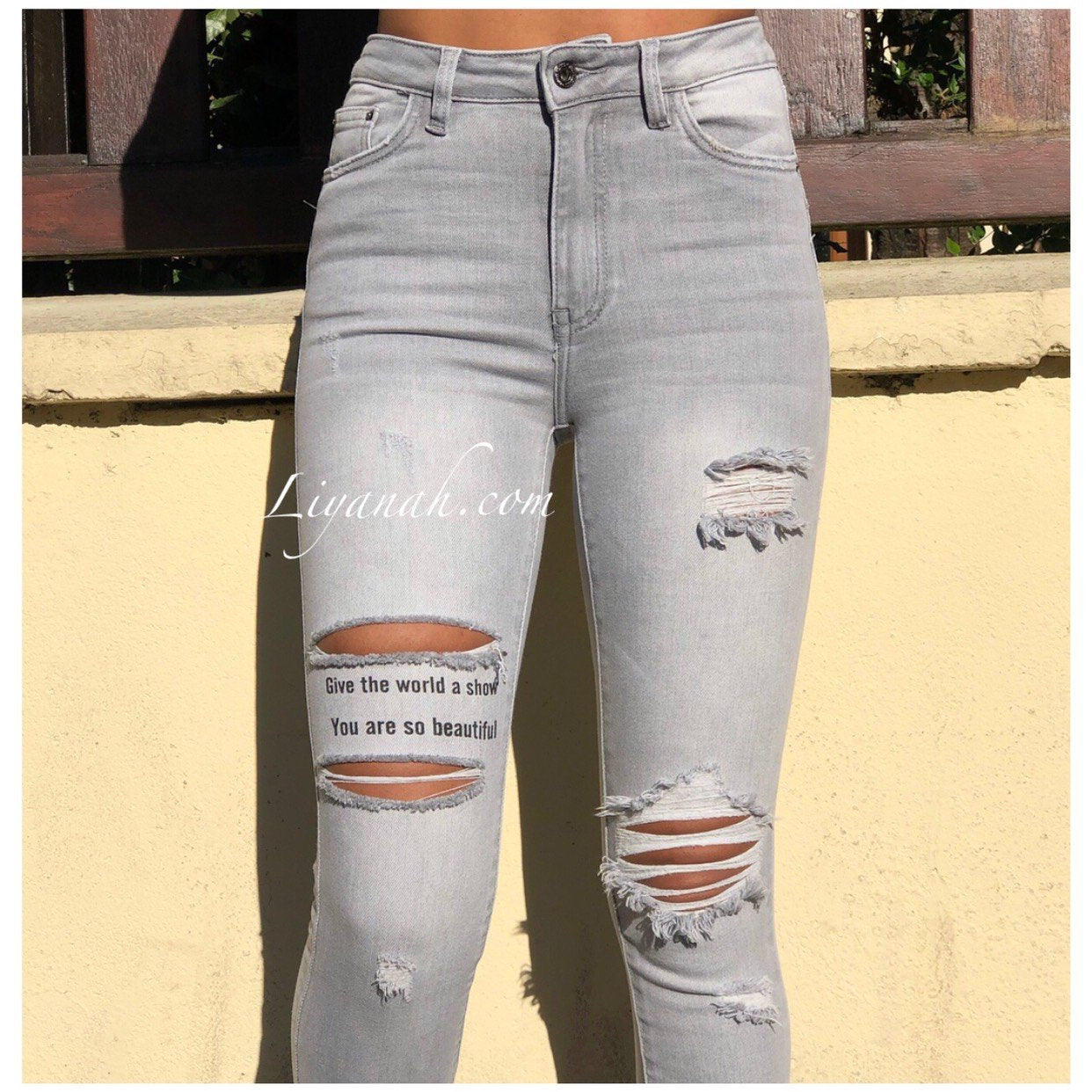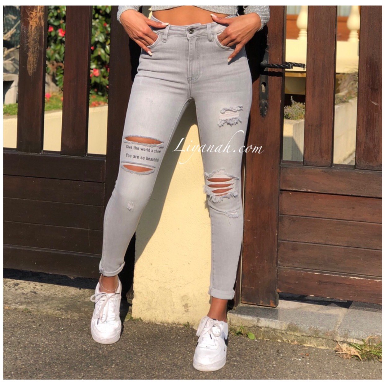 Jean Skinny DESTROY / GRIS CLAIR Modèle WAYA avec écritures - Détails : Déchirures et écritures «Give the World a Show ... You are Beautiful » GRIS TRÈS CLAIR - Coupe droite, Jean SKINNY Coupe près du corps !!! 93^ COTTON 5% LYCRA 2% Elasthanne (Du XS au XL)