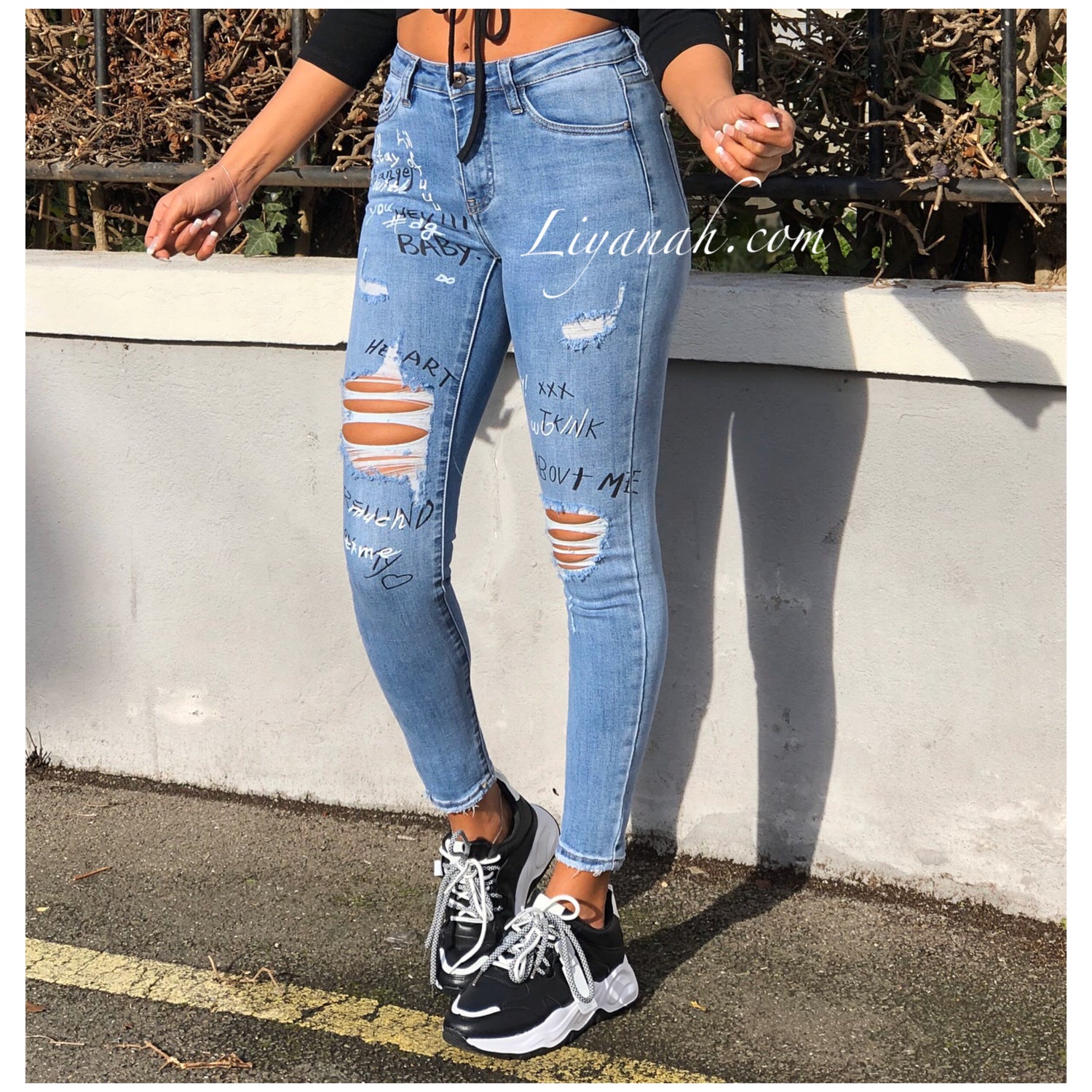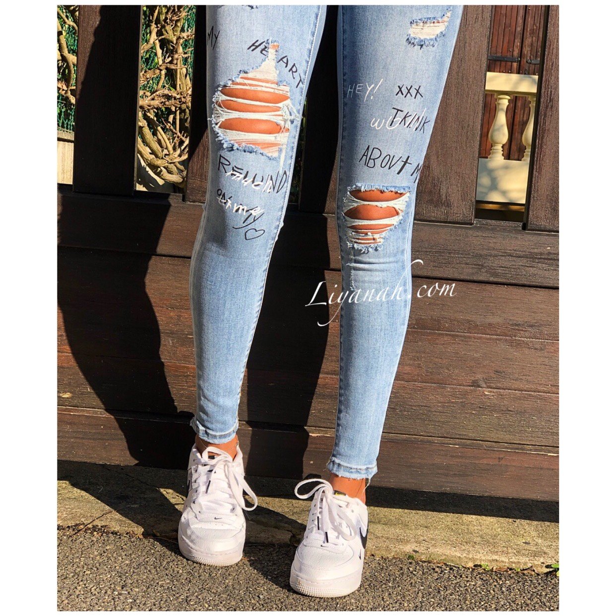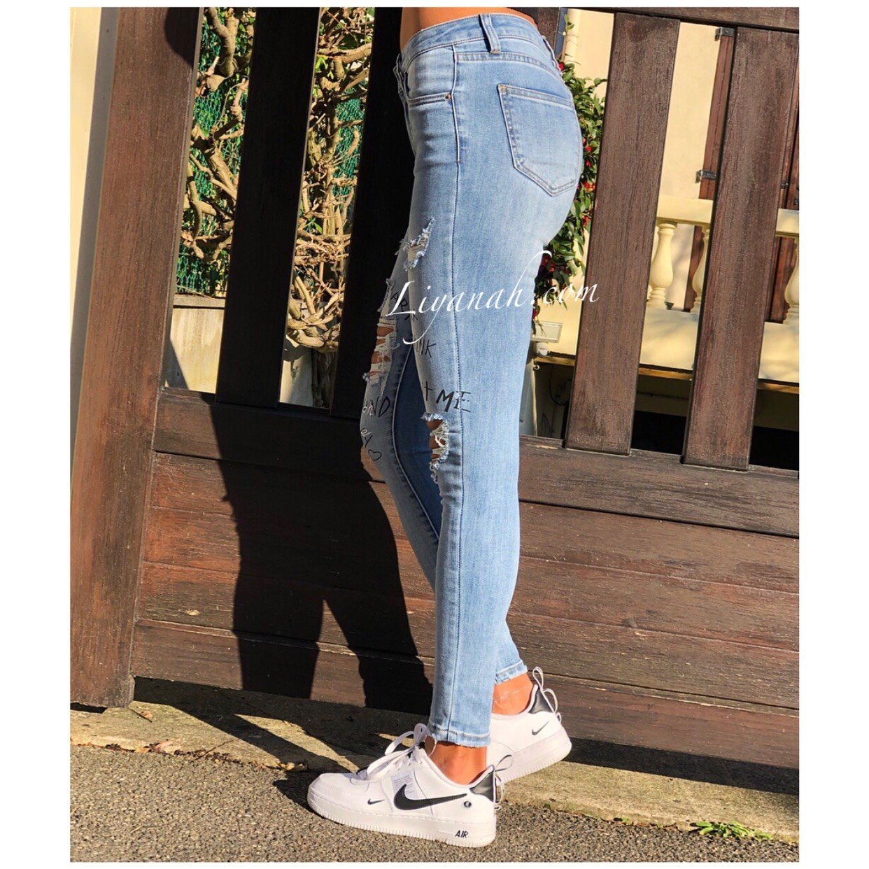 Jean Skinny DESTROY / LIGHT BLUE Modèle KIYA avec écritures Noir/Blanc - Détails : Déchirures et écritures « I will stay with You .. Baby ... » - Women's LIGHT BLUE Jeans 💙 BLEU CLAIR - Coupe droite, Jean SKINNY Coupe près du corps !!! 72% COTTON 26% Polyester 2% Elasthanne (Du XS au XL)