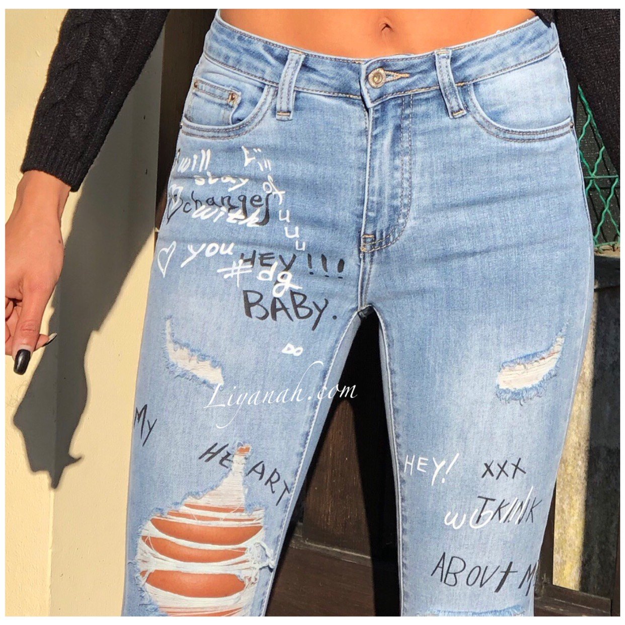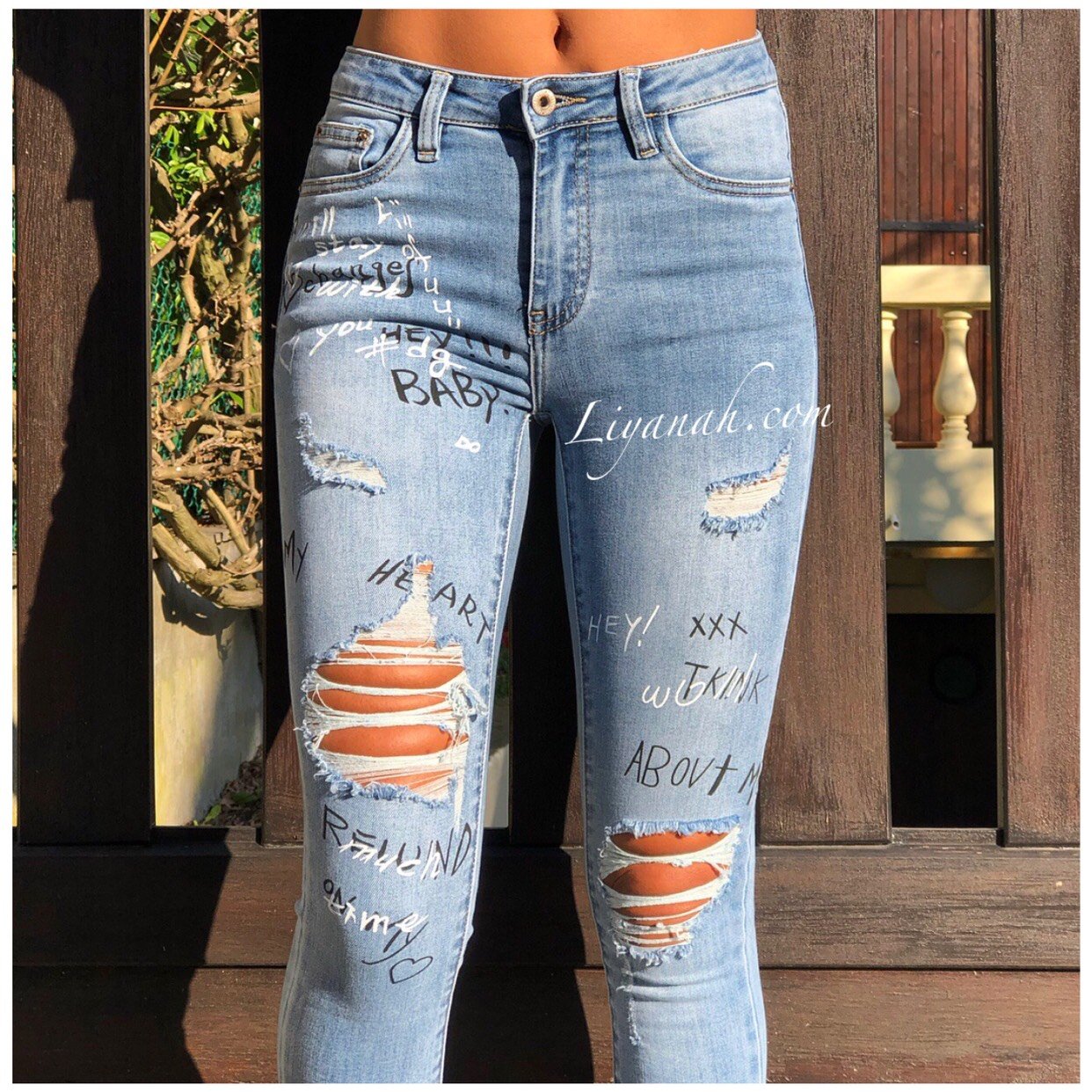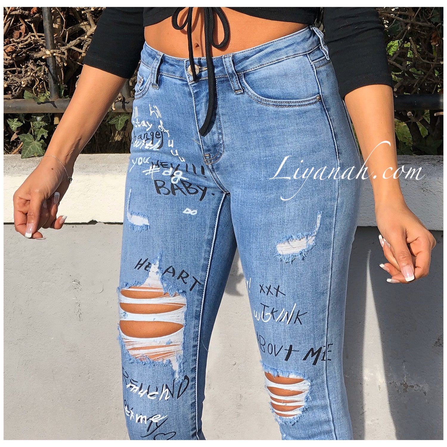 Jean Skinny DESTROY / LIGHT BLUE Modèle KIYA avec écritures Noir/Blanc - Détails : Déchirures et écritures « I will stay with You .. Baby ... » - Women's LIGHT BLUE Jeans 💙 BLEU CLAIR - Coupe droite, Jean SKINNY Coupe près du corps !!! 72% COTTON 26% Polyester 2% Elasthanne (Du XS au XL)