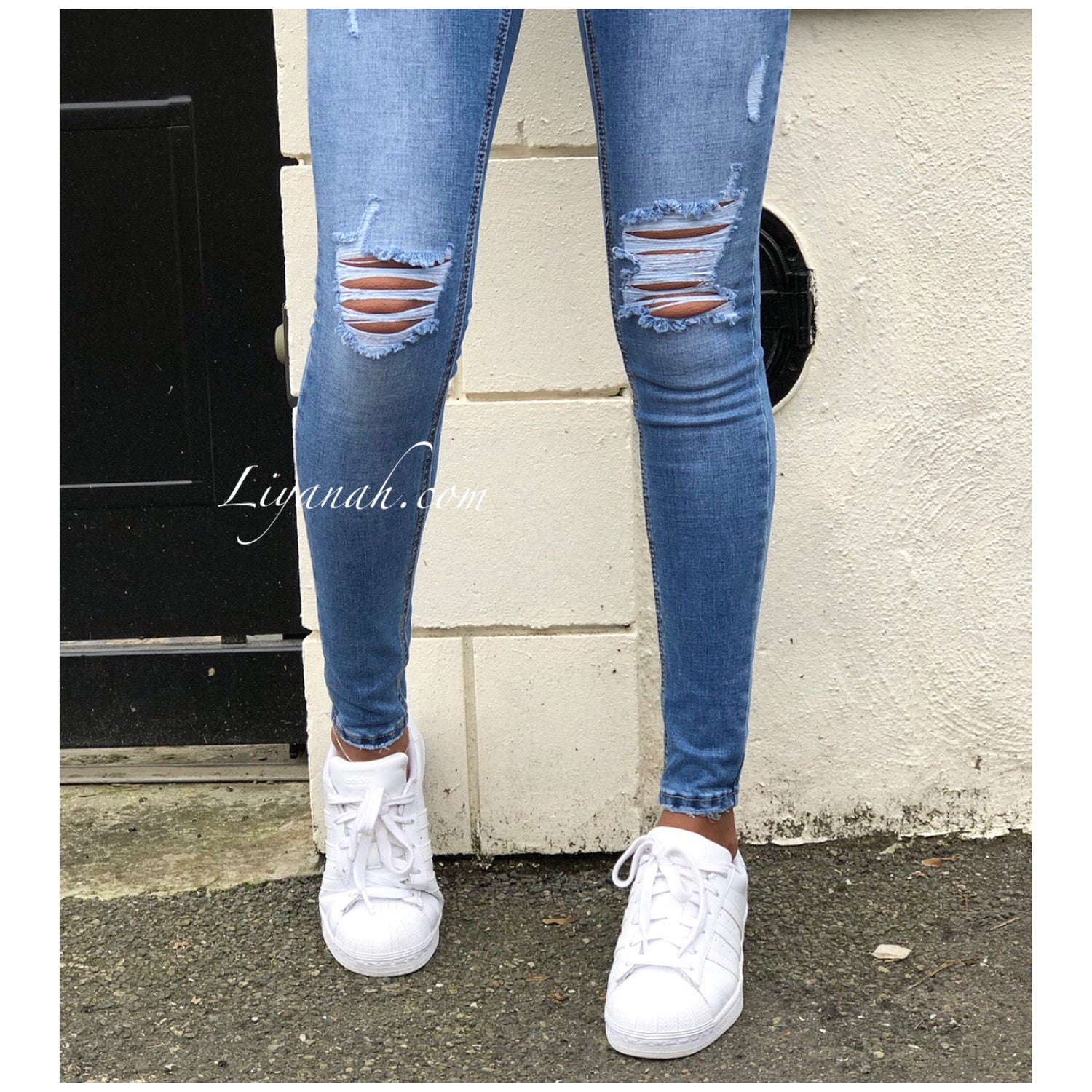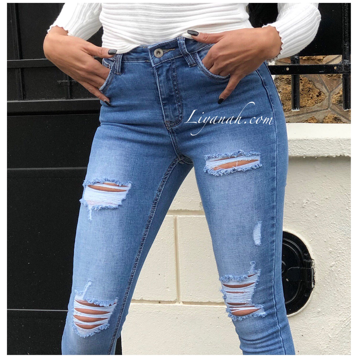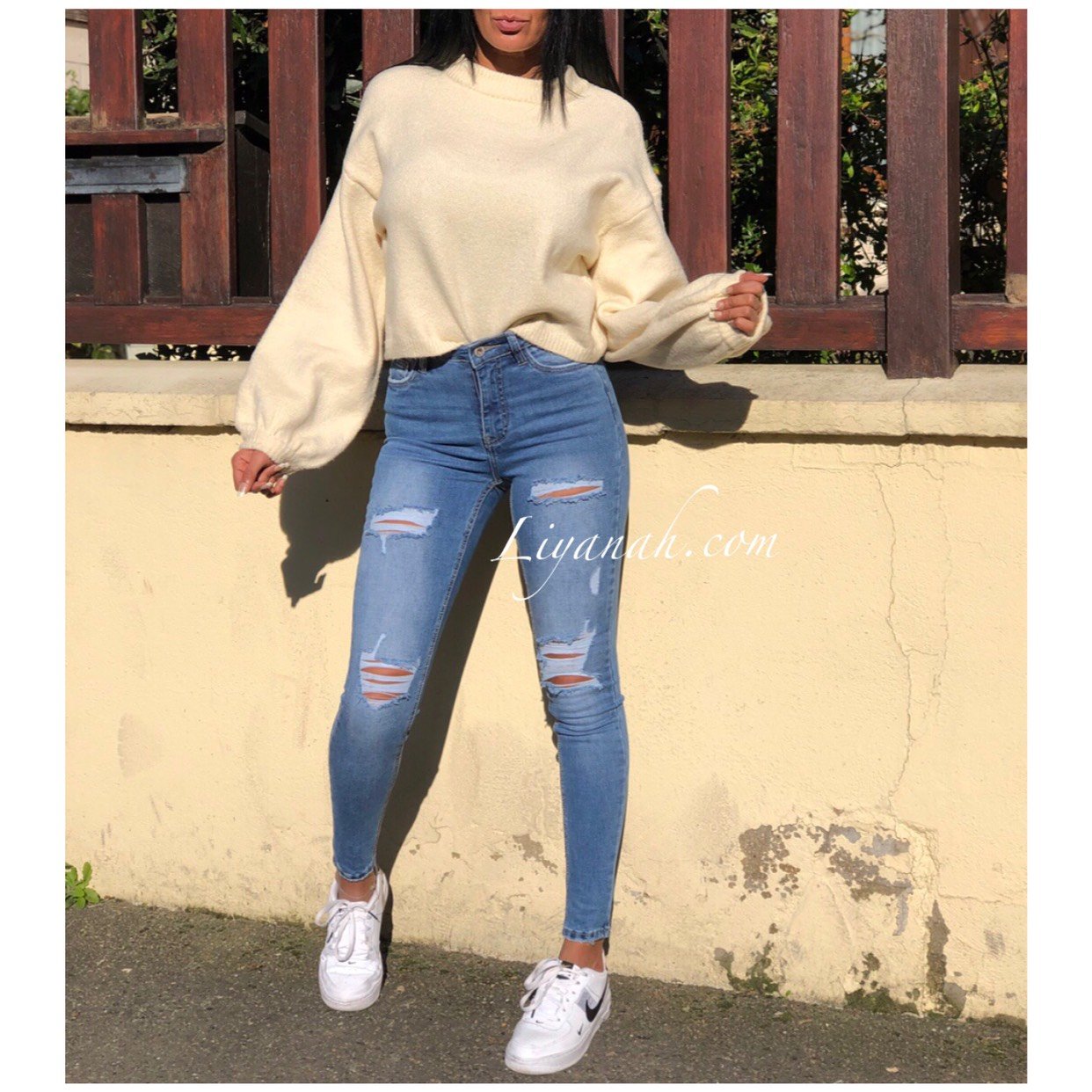 Jean Skinny LIGHT BLUE DESTROY TAILLE MI-HAUTE Modèle PRAYA 💙On est totalement dingue de ce jean destroy avec ses déchirures aux genoux aux cuisses ✖️Women's light Blue Jeans - Coupe près du corps !!! 90% COTTON 8% Polyester 2% Elasthanne !!! Taille XS AU XL