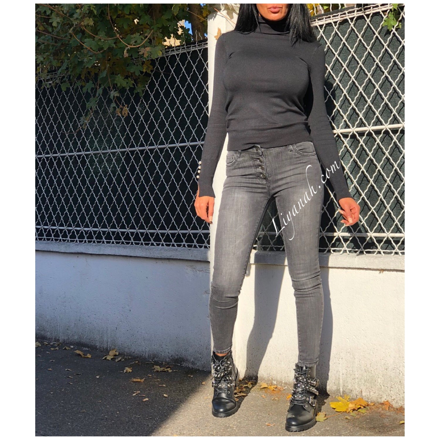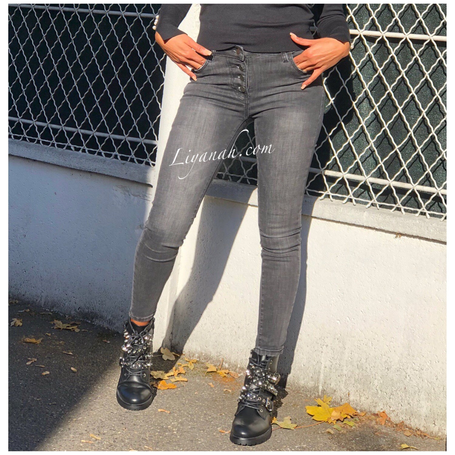 Jean Skinny Modèle AYLARA GRIS On est totalement dingue de ce jean Gris Clair !!! Super chic et atypique avec fermeture par boutons 🖤 Coupe près du corps !!! 90% COTTON 8% Polyester 2% Elasthanne (Taille XS au XL)