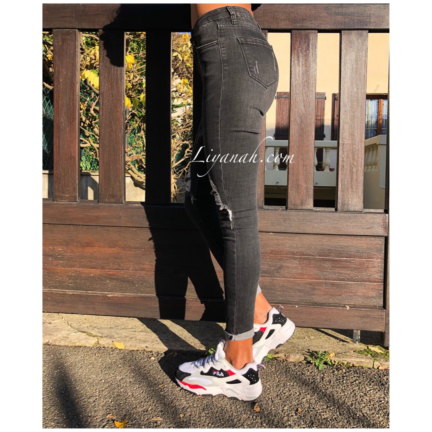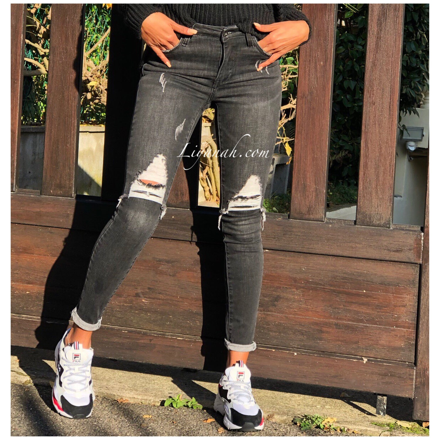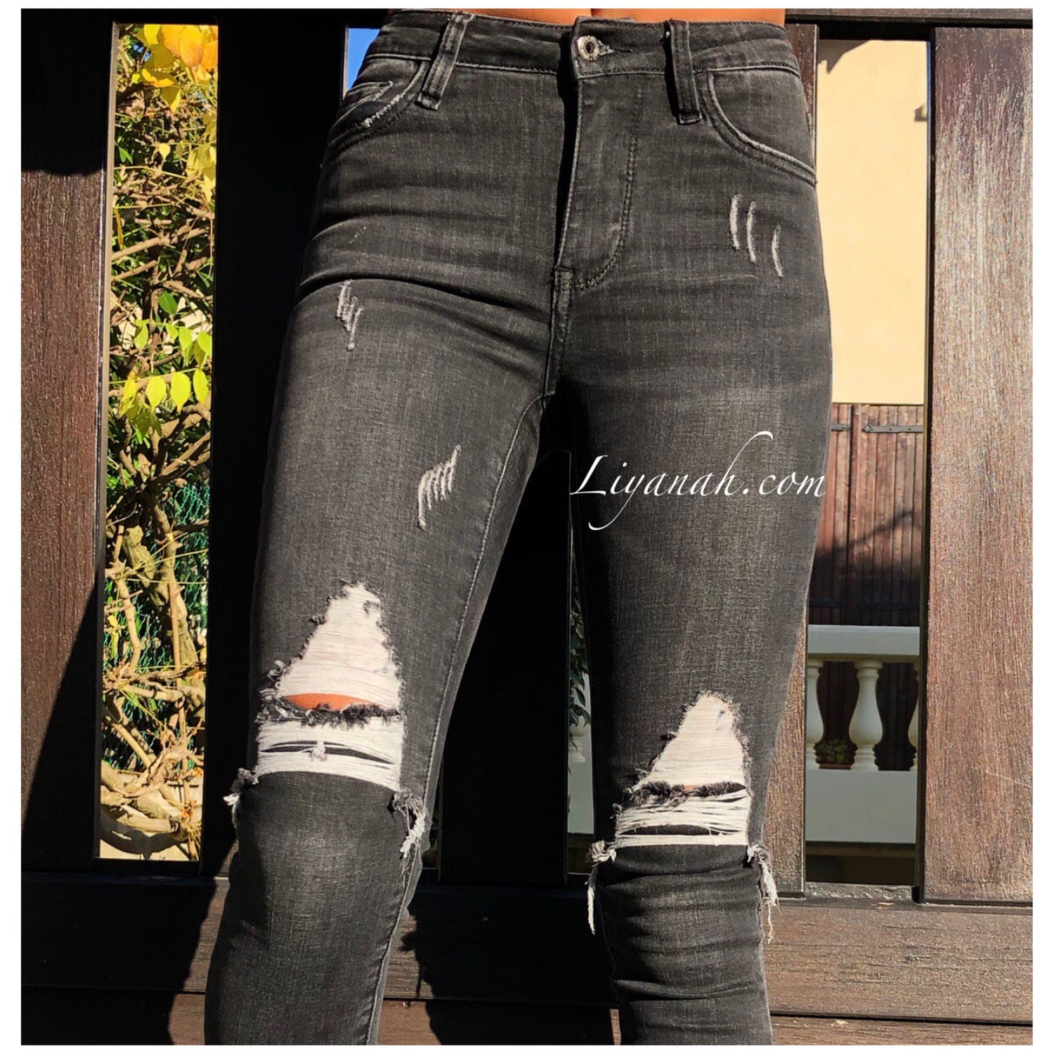 Jean Skinny Modèle YEBARA GREY/BLACK DESTROY - Couleurs : Gris/Noir, Coupe près du corps 🖤 DÉCHIRURES À L’AVANT GENOUX !!! Il s'adapte très facilement à votre silhouette - Taille XS à XL - 90% Coton 8% Polyester 2% Elasthanne