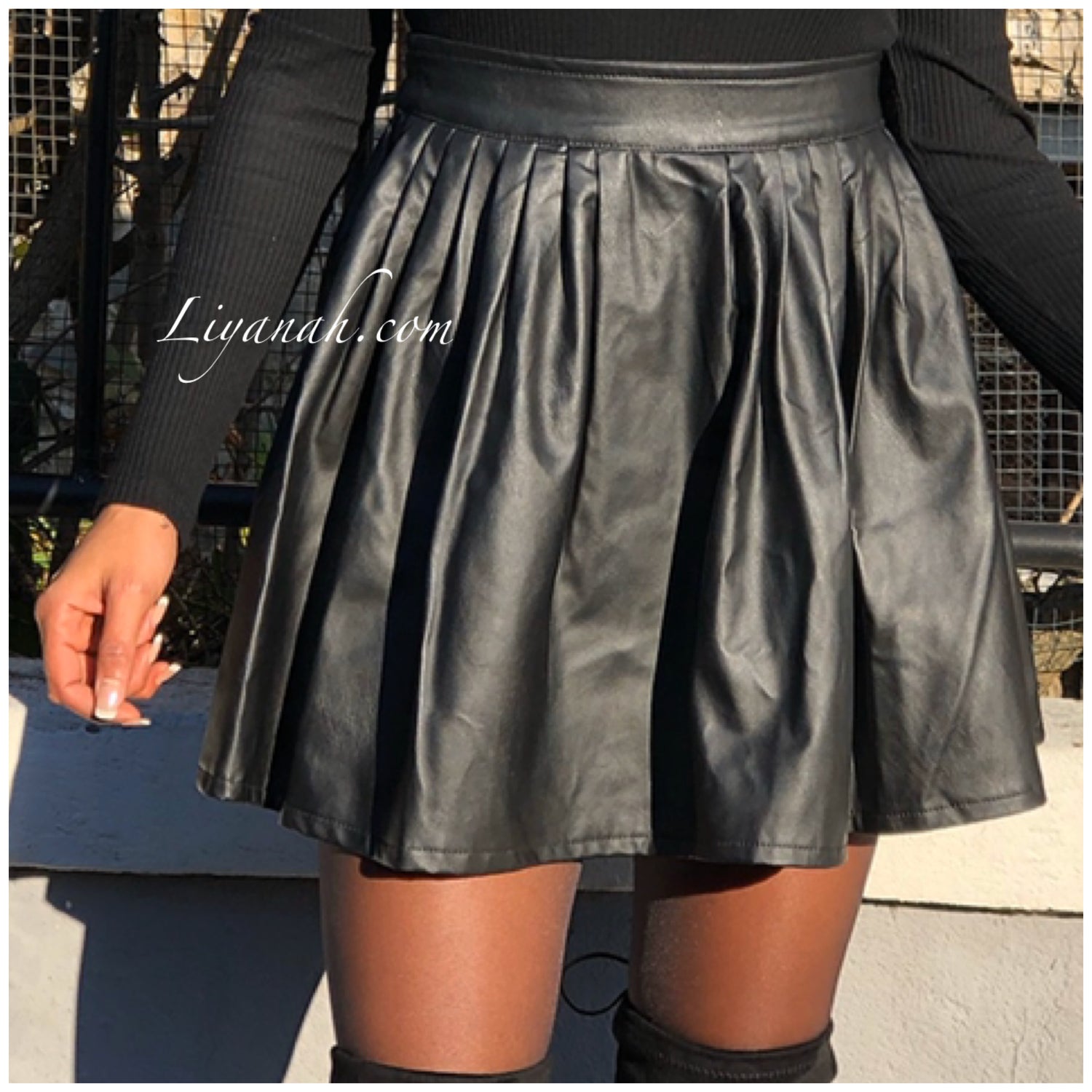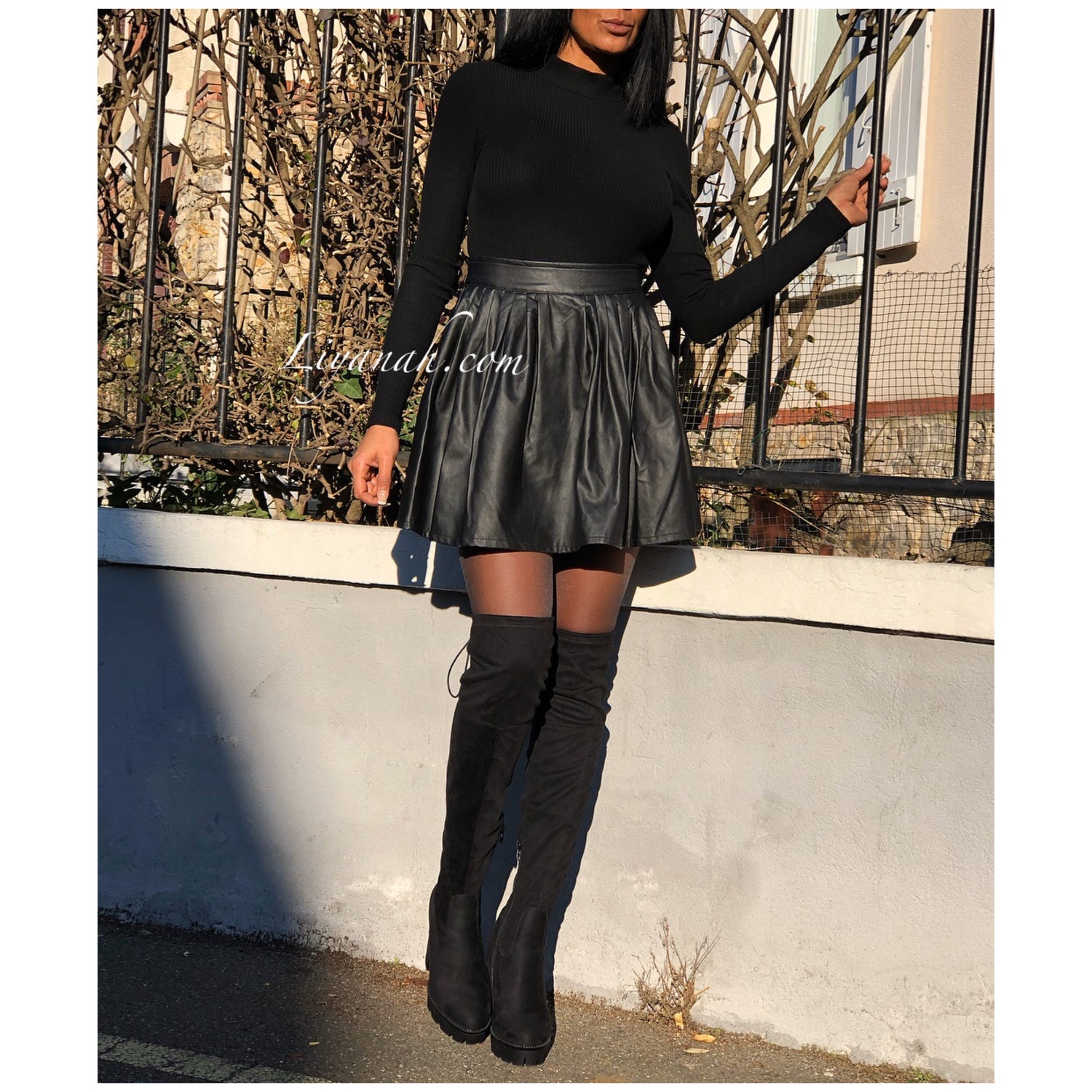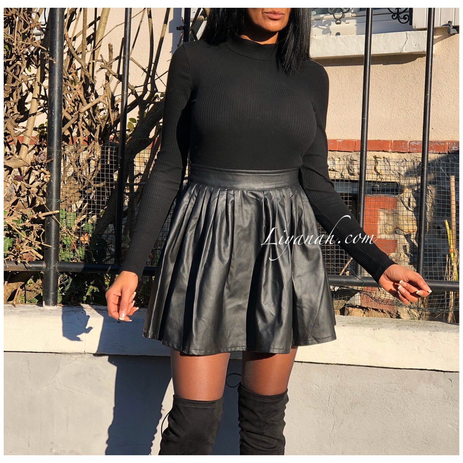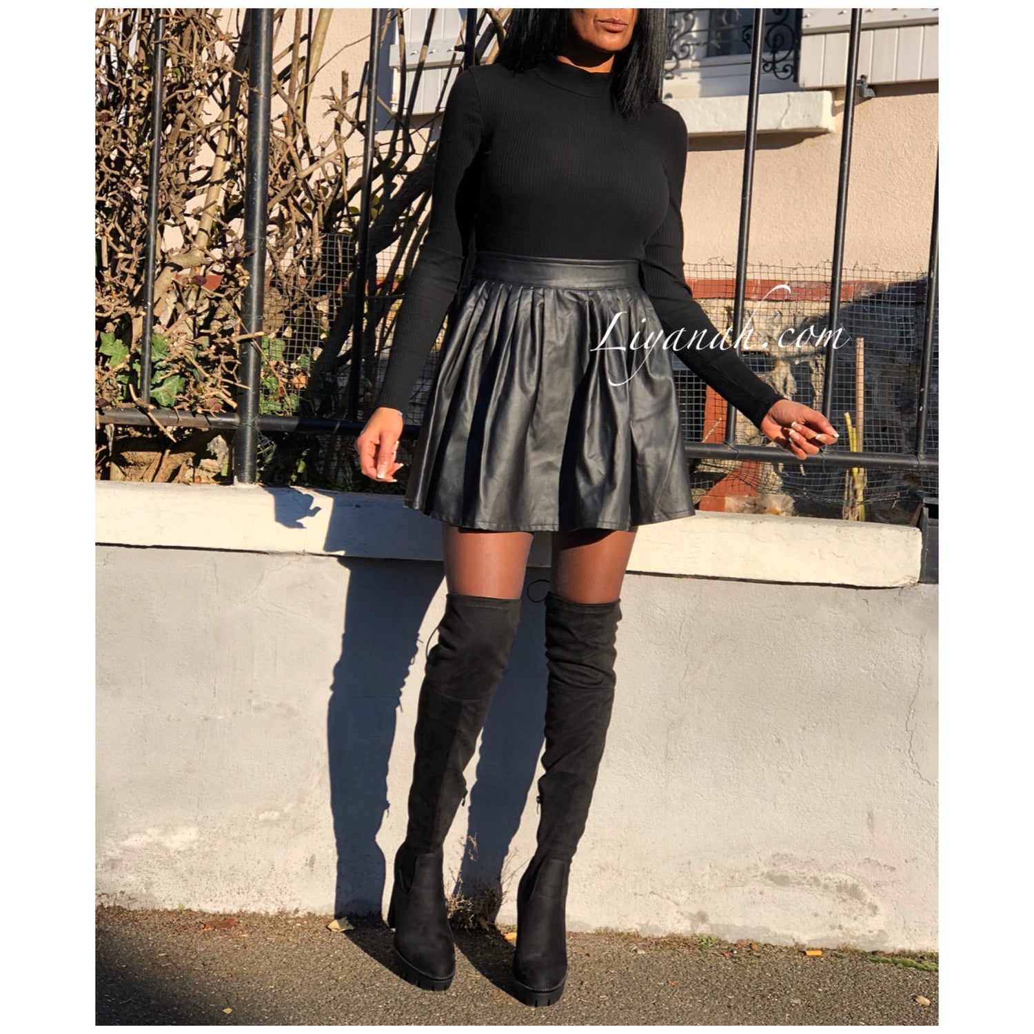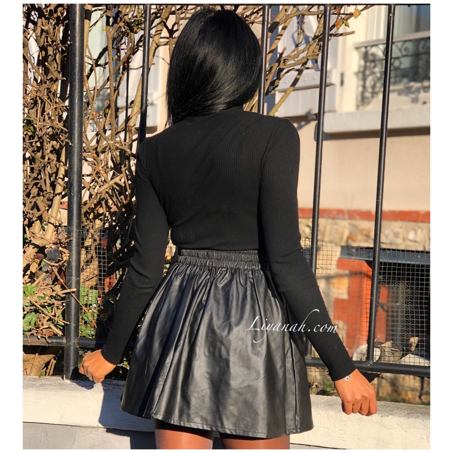 Jupe Courte Aspect Cuir KANYRA Noir - Jupe courte et modèle évasé avec élastique à la taille, aspect cuir (Simili) se porte en taille normal ou mi-haute - Longueur : 40 cm Taille S au L - 95% Polyester 5% Elasthanne