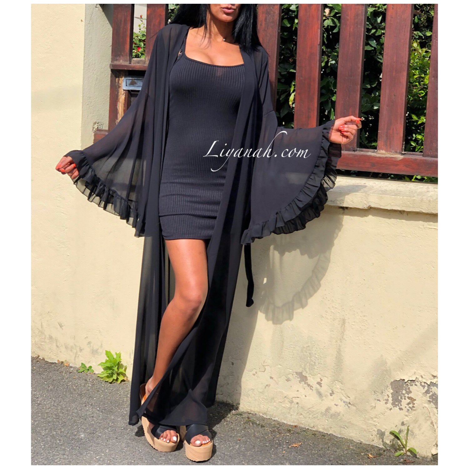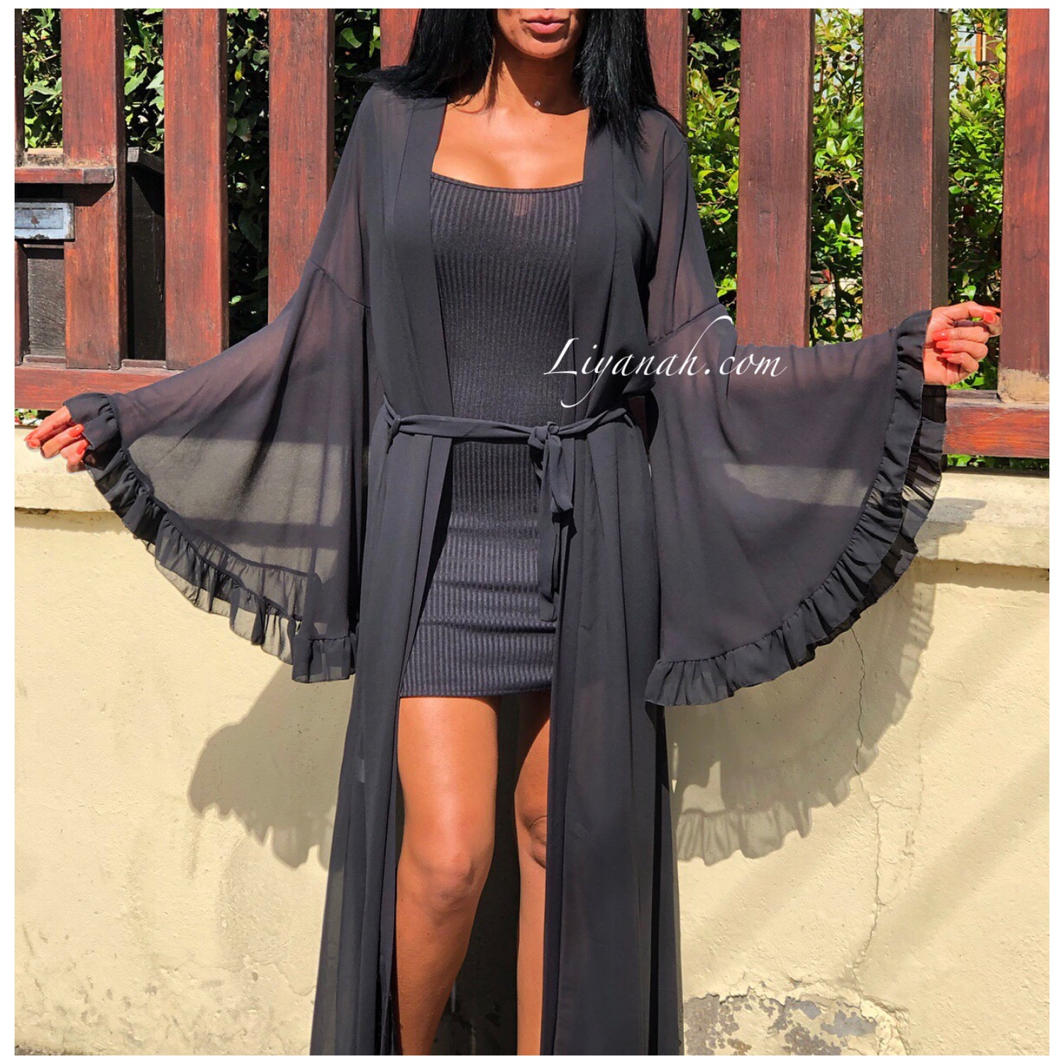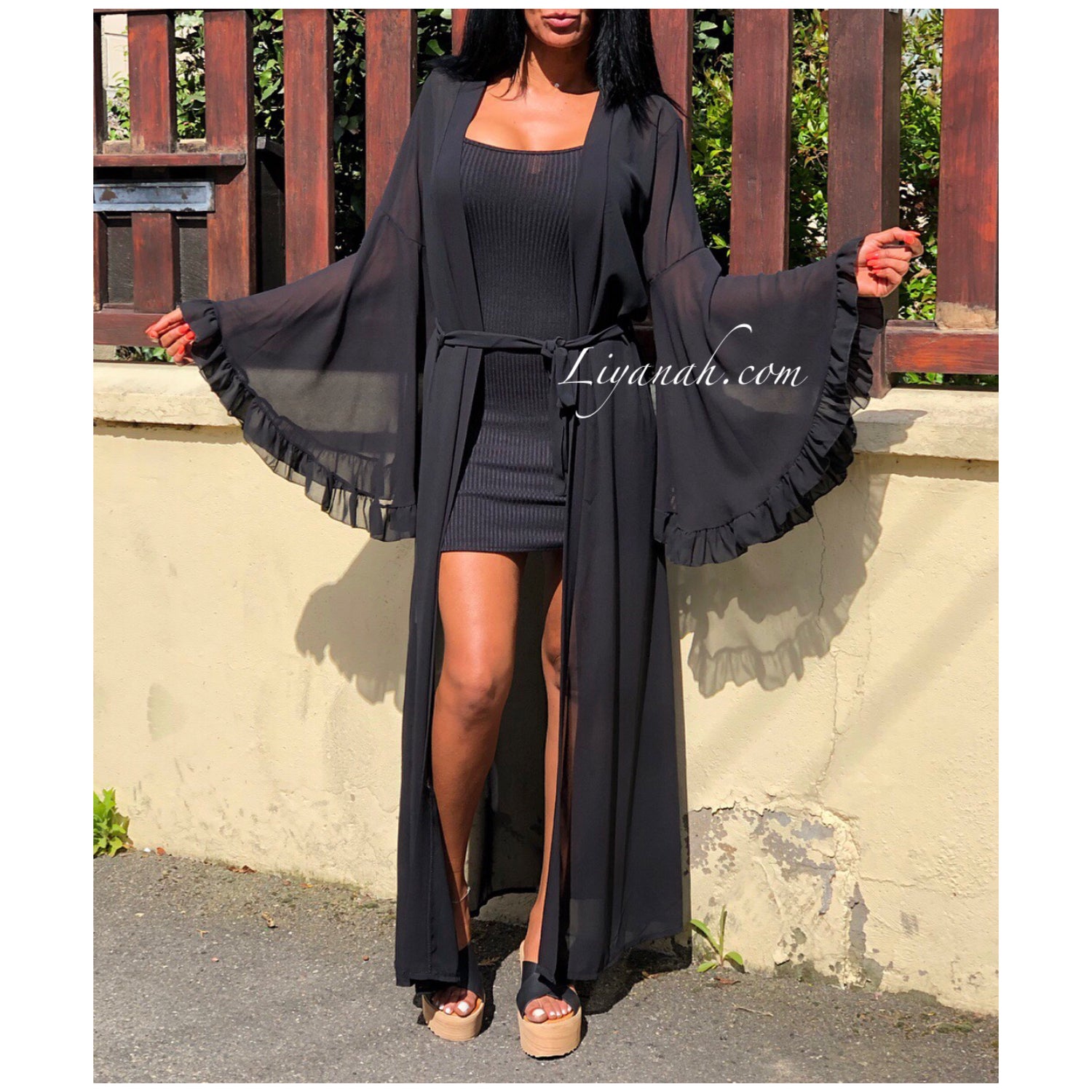 Kimono Long Modèle ETHNA Noir - Kimono totalement transparent et fluide, Manches Pagodes et noeud à la taille - Totalement chic, il rehaussera toutes vos tenues aussi bien à la ville qu’à la plage. Portez le également Cet été au dessus d'un maillot de bain - Taille Unique du 34 au 40 - 95% Polyester 5% Elasthanne !!! Longueur : 144 cm