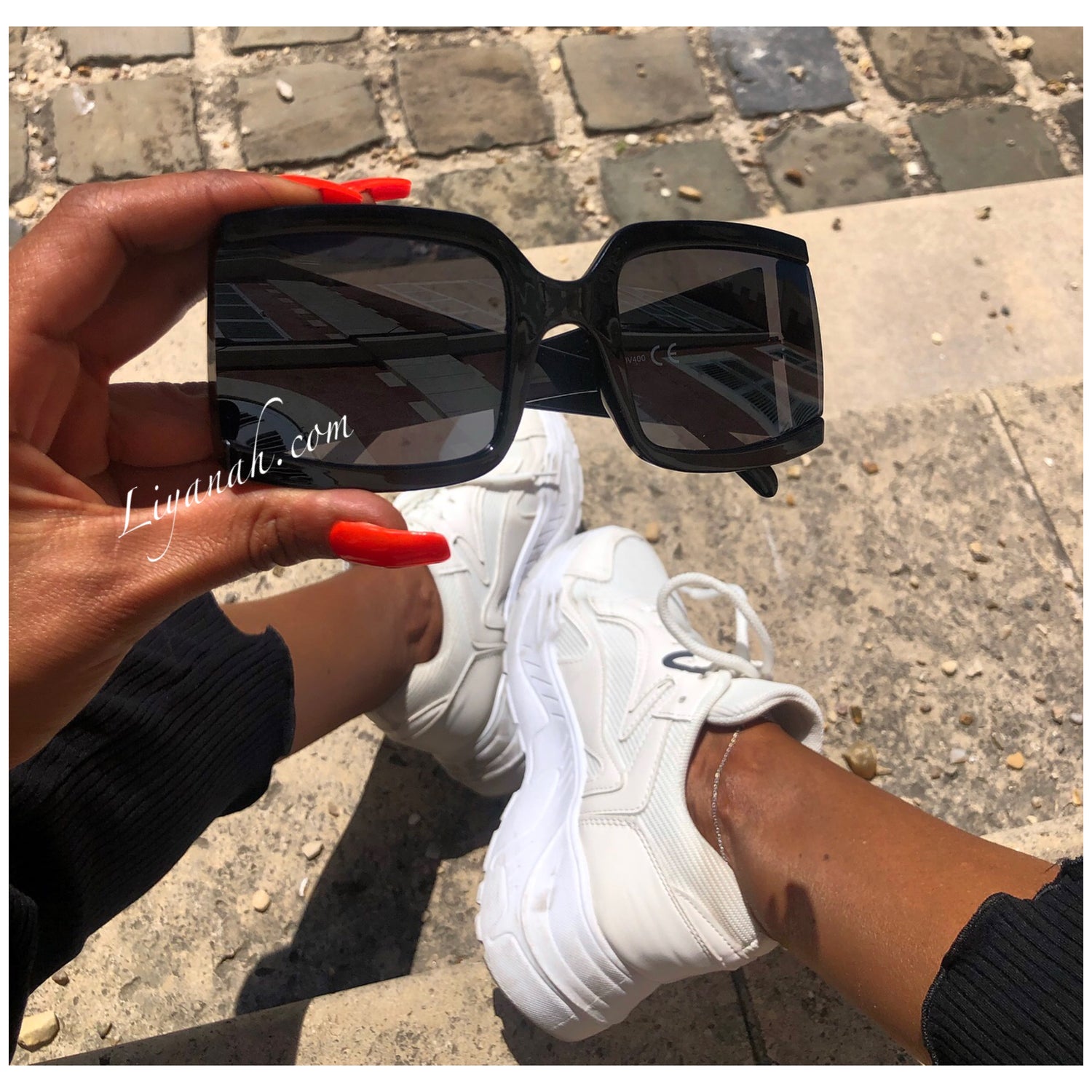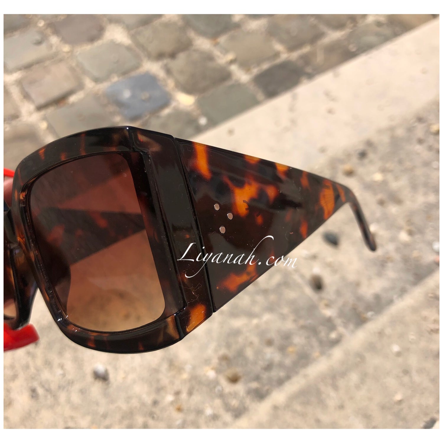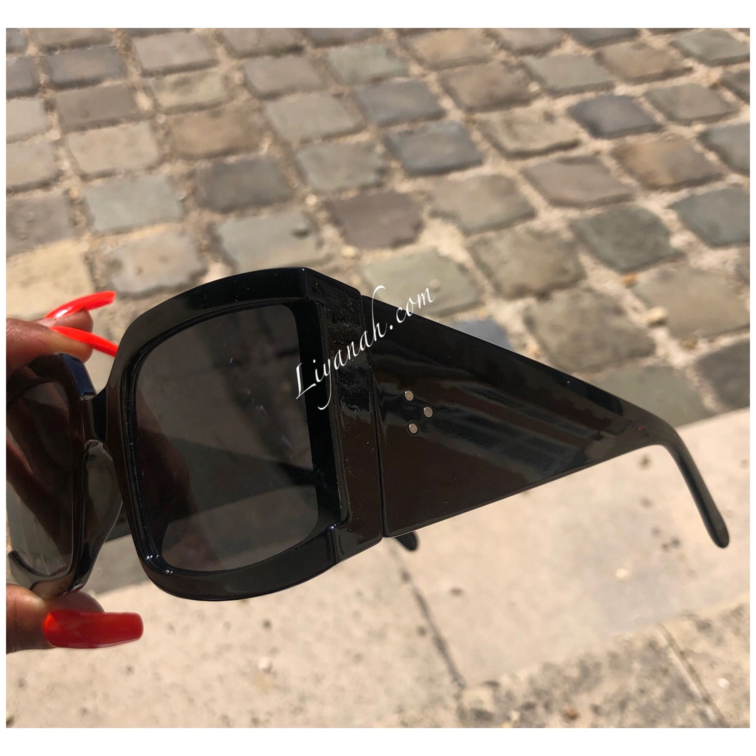 LUNETTES DE SOLEIL À MONTURE CARRÉE ET BORD SUPÉRIEUR Arrondie. Détails vice visible sur les côtes - GROSSE LUNETTE !!! Protection UV Longueur des branches : 15 cm Largeur des verres : 6,5 cm Longueur du Front : 14 cm - VENDUE AVEC UN ÉTUI Noir SOUPLE ET FLUIDE À NOEUDS *Ni repris ni échangé