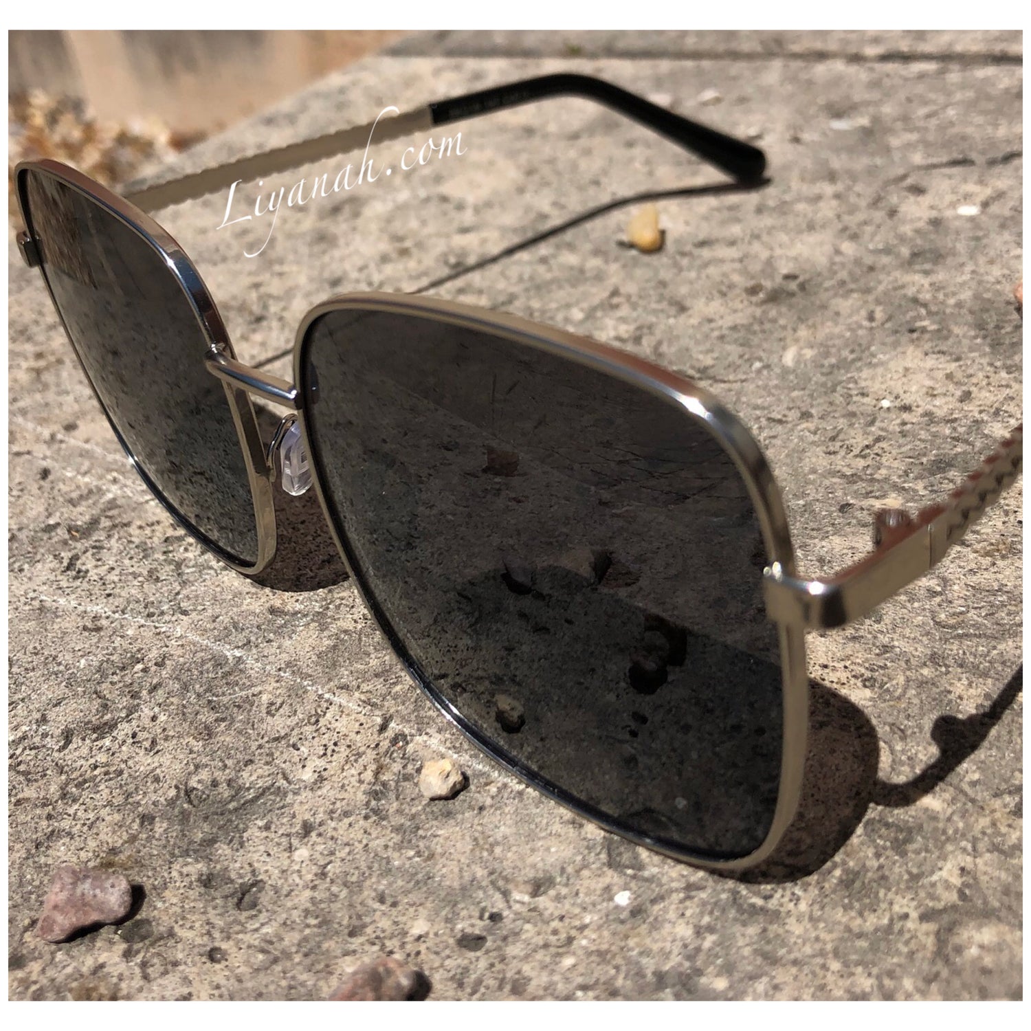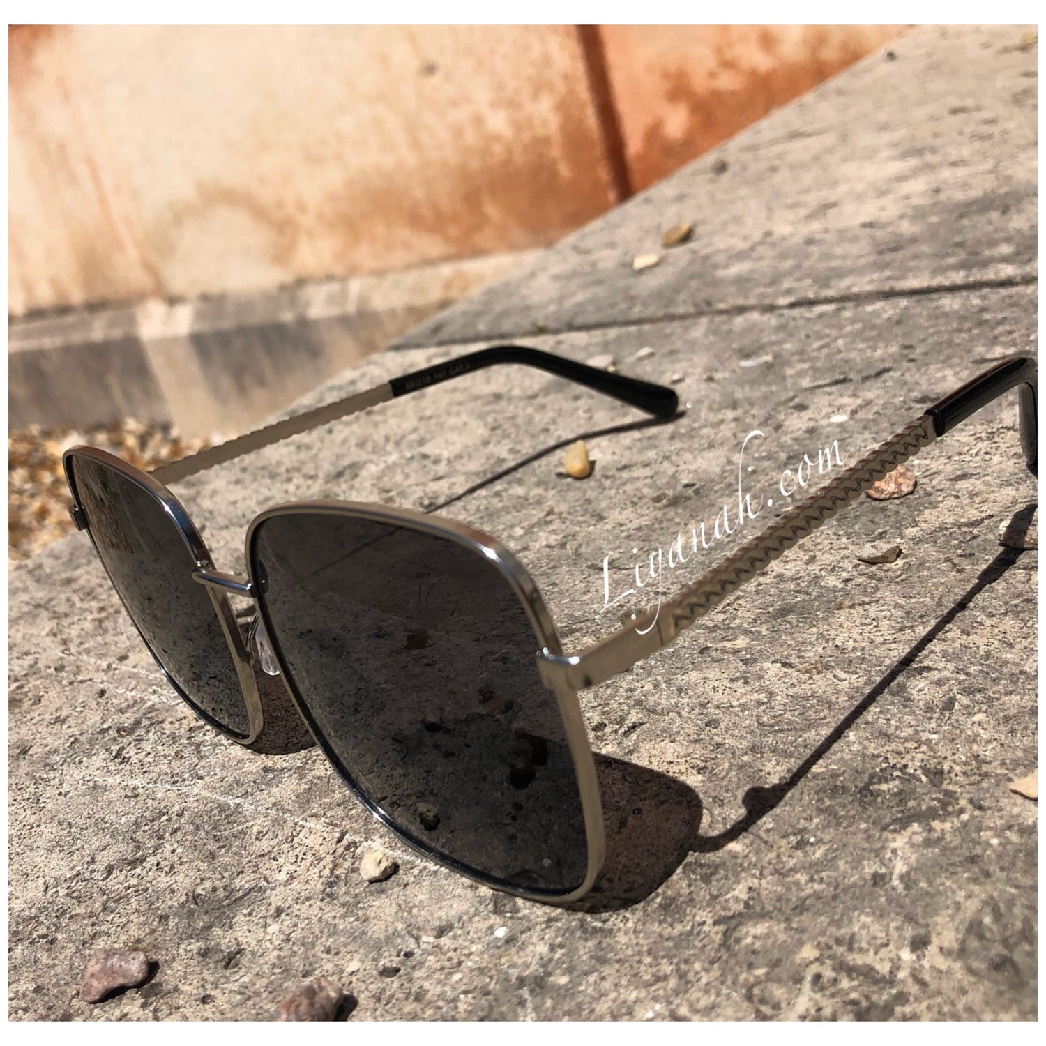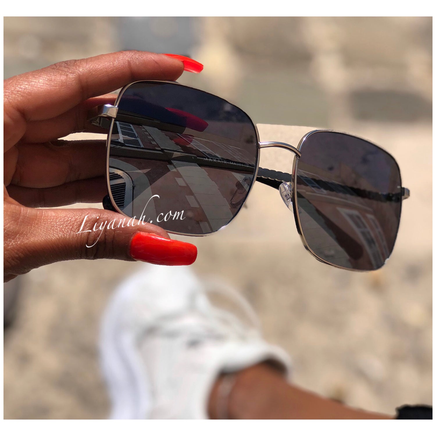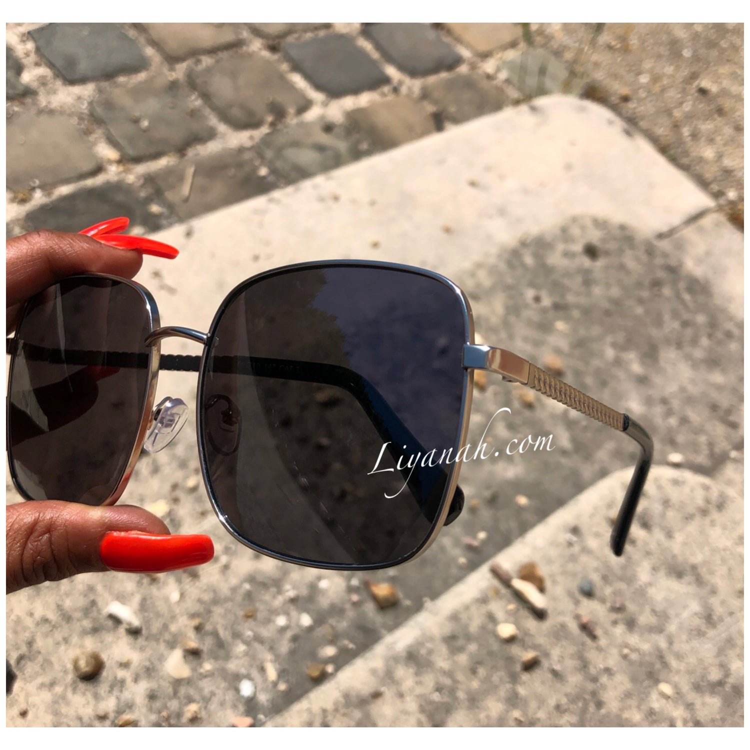 LUNETTES DE SOLEIL ARGENT À MONTURE CARRÉE ARRONDIE, contour acier, branche acier et noir - Protection UV Longueur des branches : 15 cm Largeur des verres : 6,5 cm Longueur du Front : 13 cm - VENDUE AVEC UN ÉTUI Noir SOUPLE ET FLUIDE À NOEUDS *Ni repris ni échangé