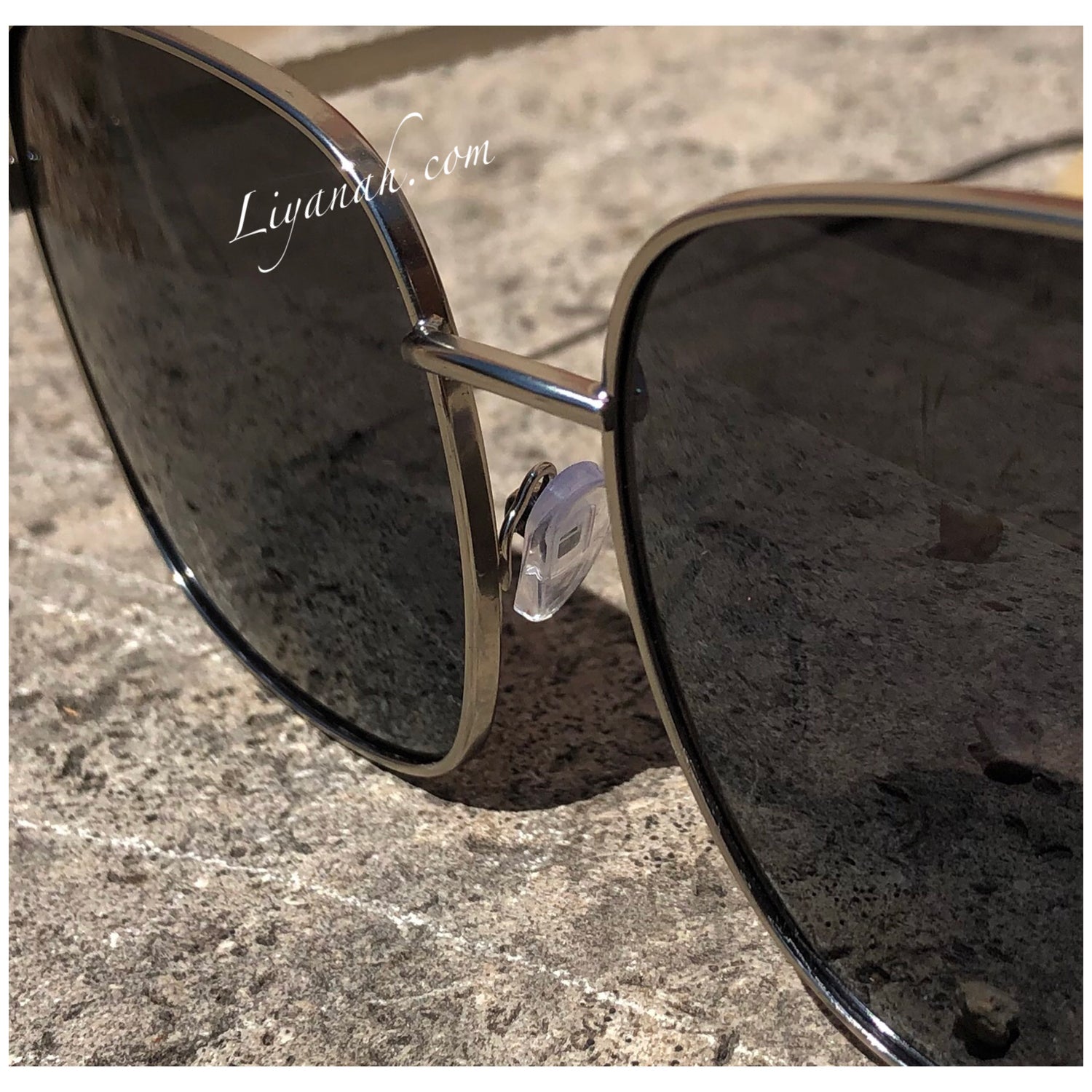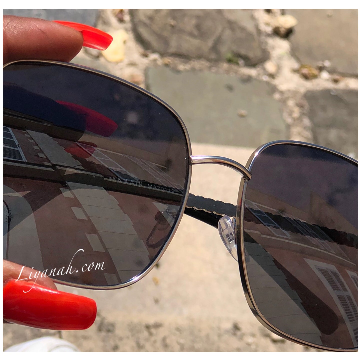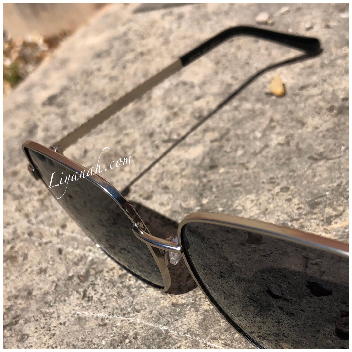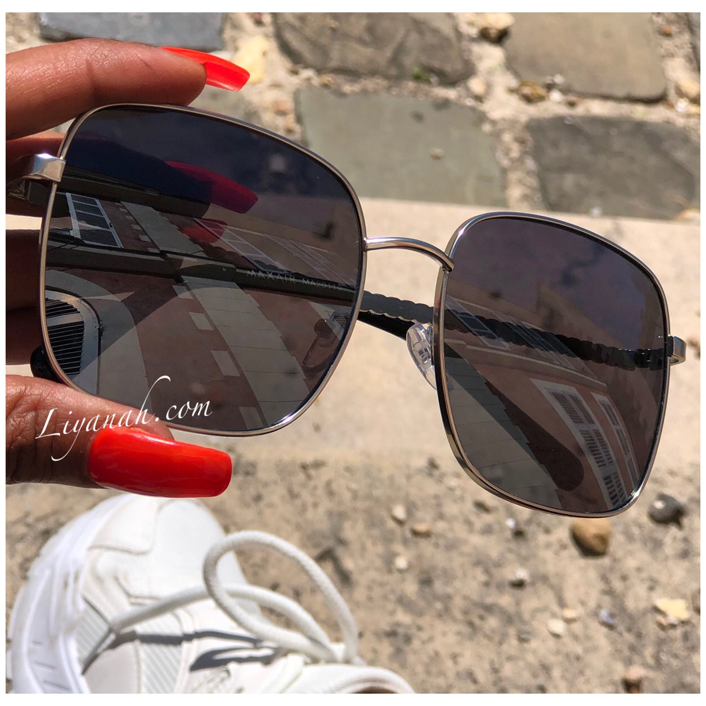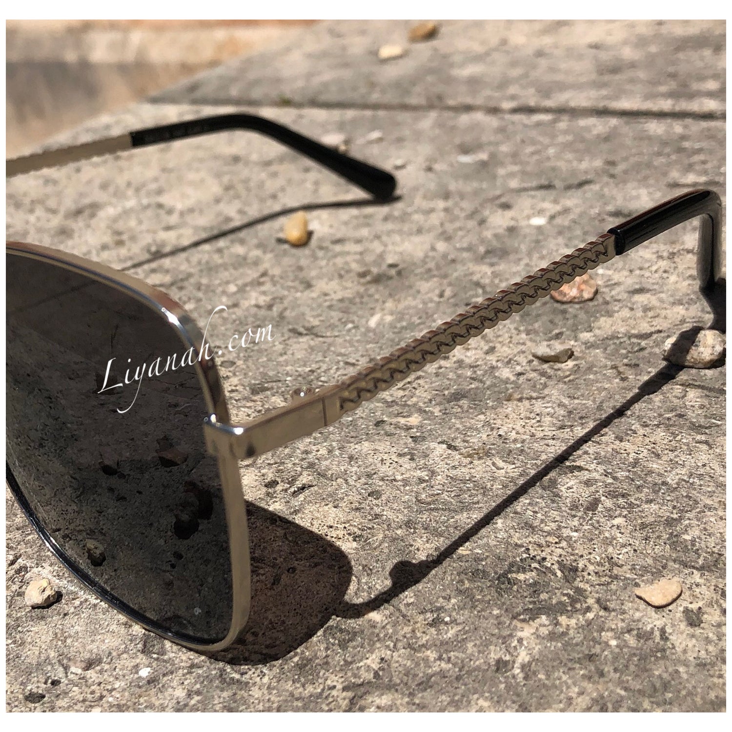 LUNETTES DE SOLEIL ARGENT À MONTURE CARRÉE ARRONDIE, contour acier, branche acier et noir - Protection UV Longueur des branches : 15 cm Largeur des verres : 6,5 cm Longueur du Front : 13 cm - VENDUE AVEC UN ÉTUI Noir SOUPLE ET FLUIDE À NOEUDS *Ni repris ni échangé
