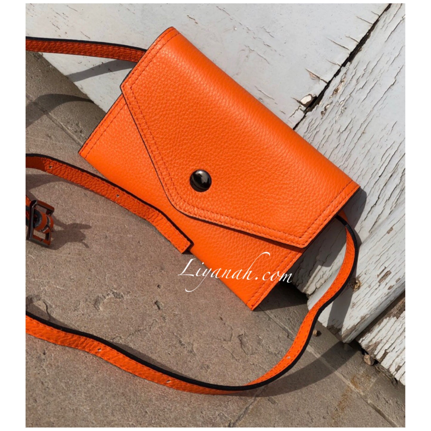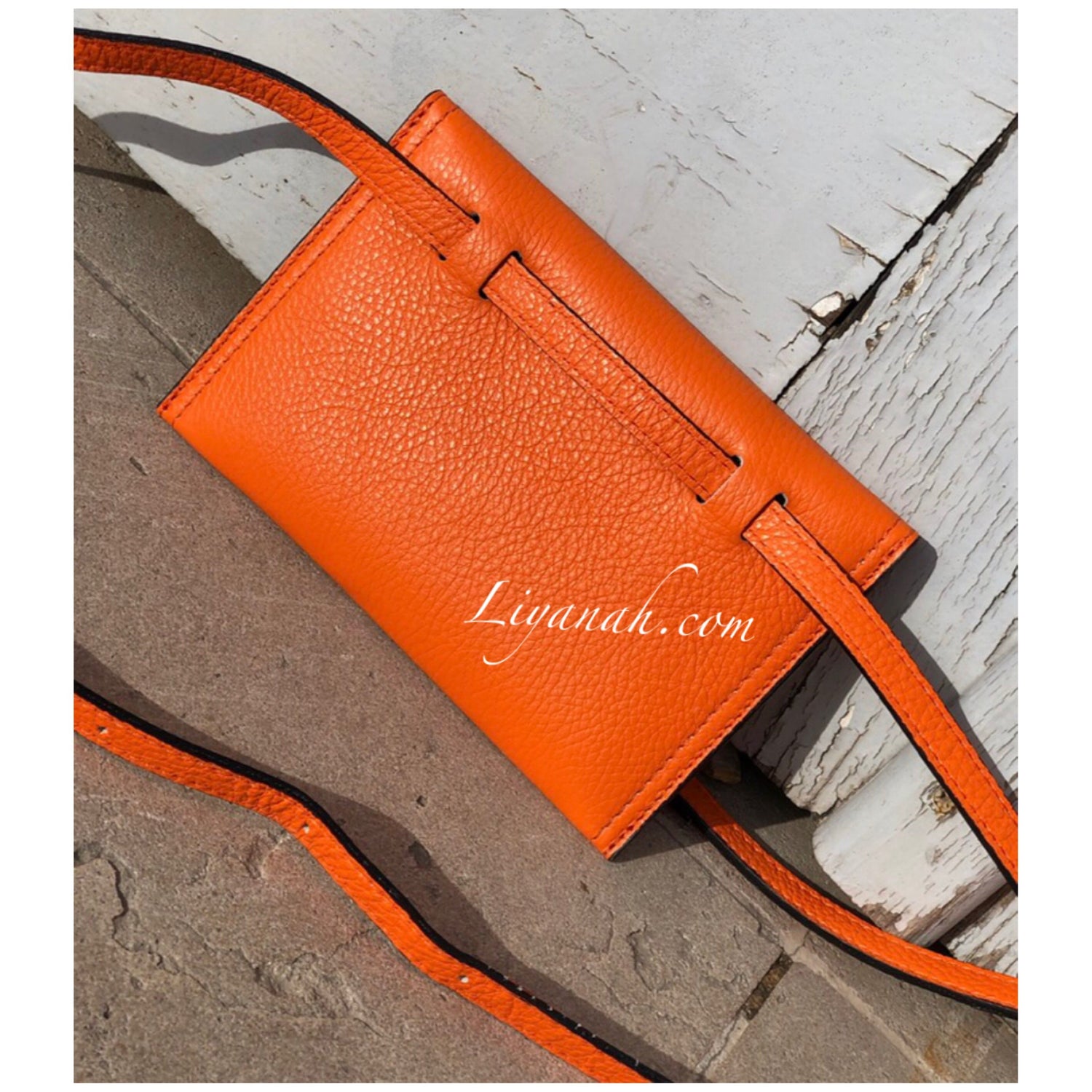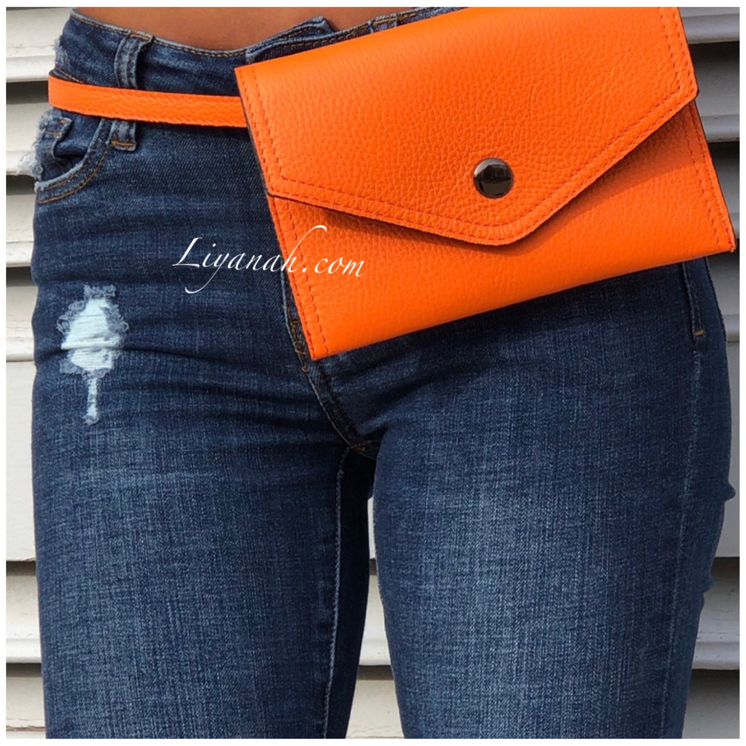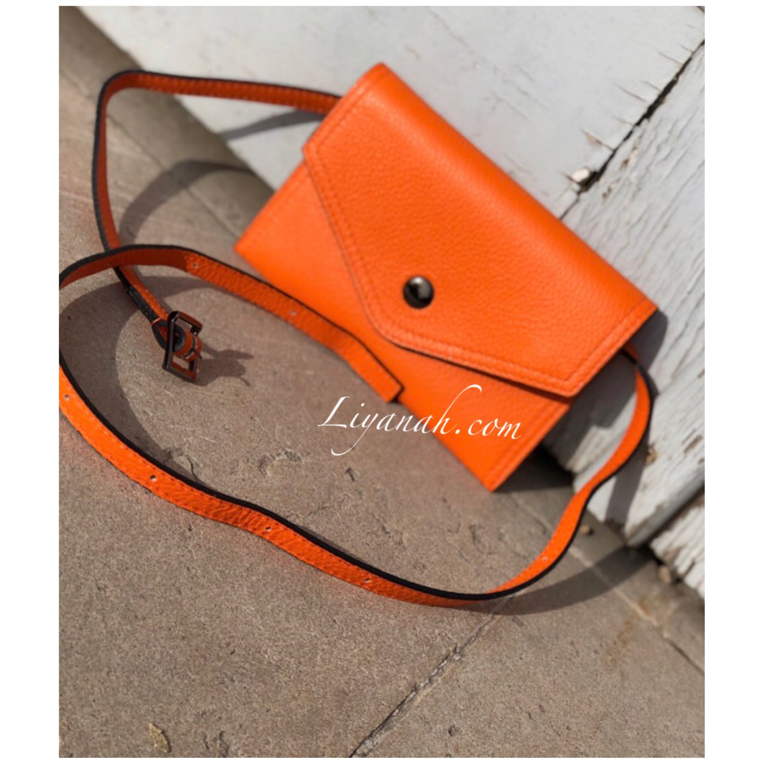 Pochette Ceinture en Cuir Petit Modèle TALYA ORANGE - Forme pochette à fermeture bouton, pochette petite et fine avec intérieur petite poche fermeture zip, ceinture réglable non fixe !! 100% CUIR 🌸 Disponible en Noir, Rouge ou Orange !! Petit modèle - Dimension : 20 cm * 13 cm - Longueur ceinture : 121 cm ✖️ Les sacs vendus sur notre site ne sont ni repris ni échangé