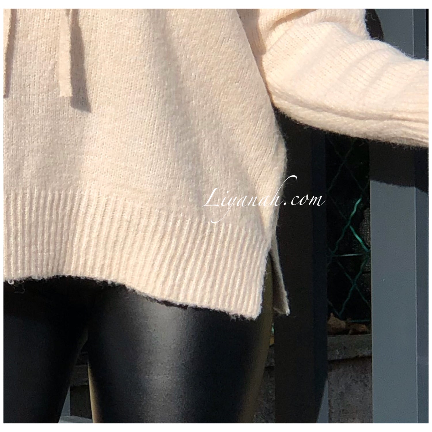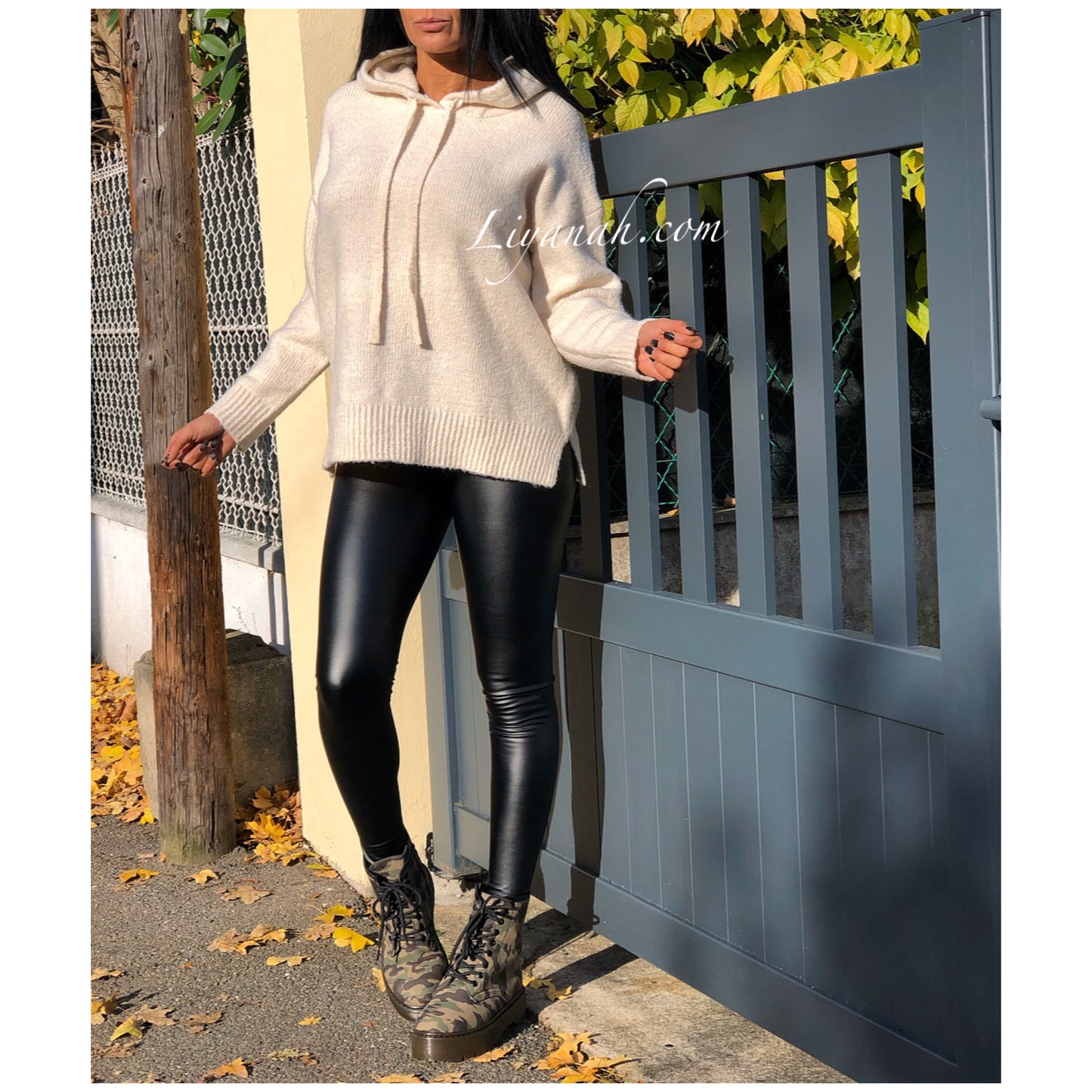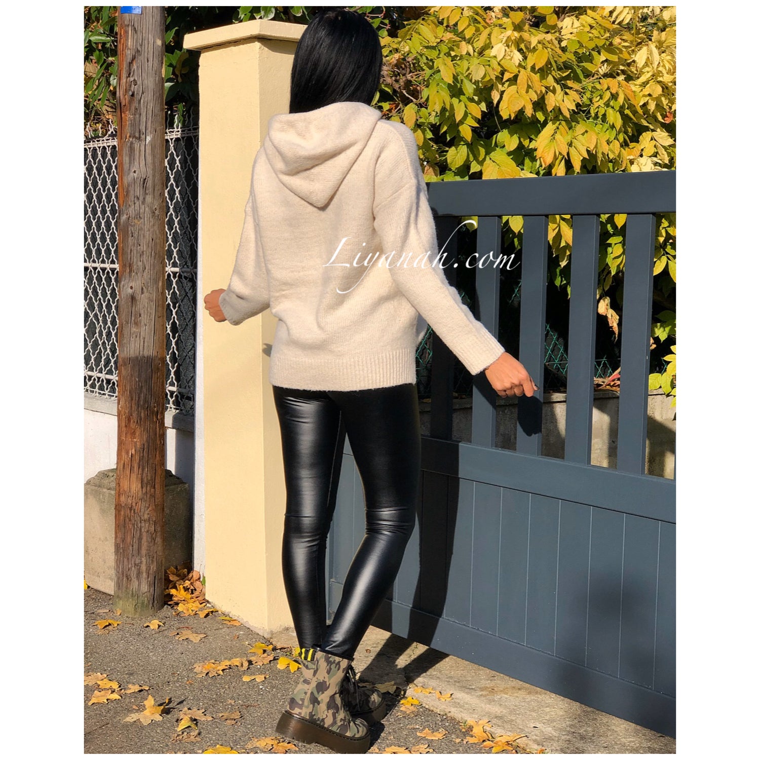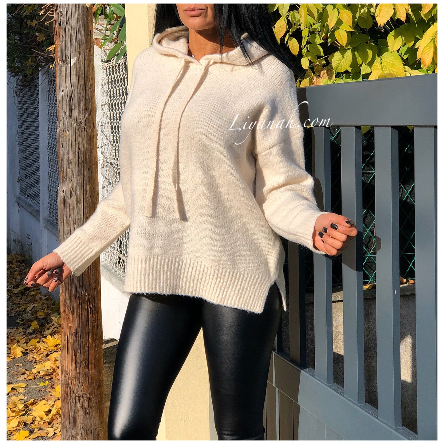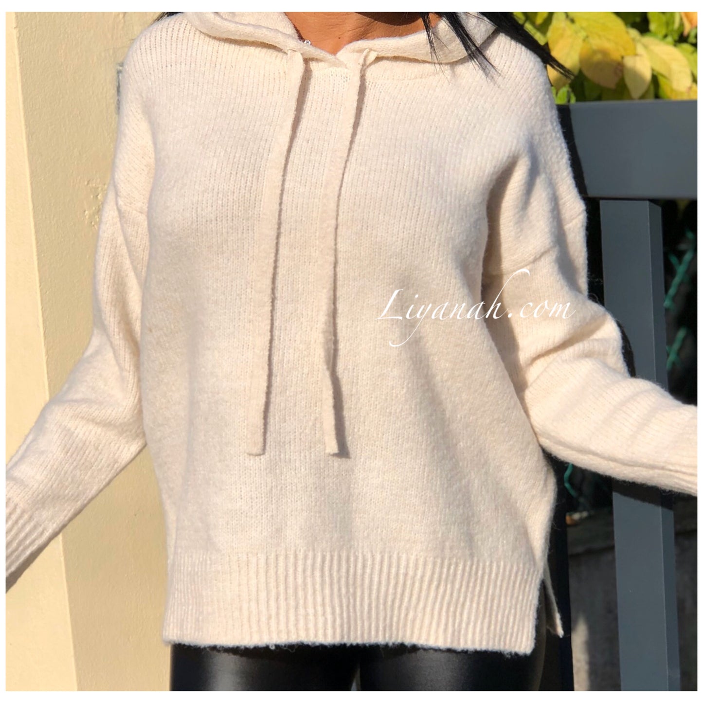 PULL À CAPUCHE Modèle MADOA ÉCRU  - Pull légèrement épais Avec une capuche avec laçage, Style légèrement Oversize et Manches Longues !!! Taille Unique du 34 au 40 - 65% Acrylique 25% Polyamide 10% Laine