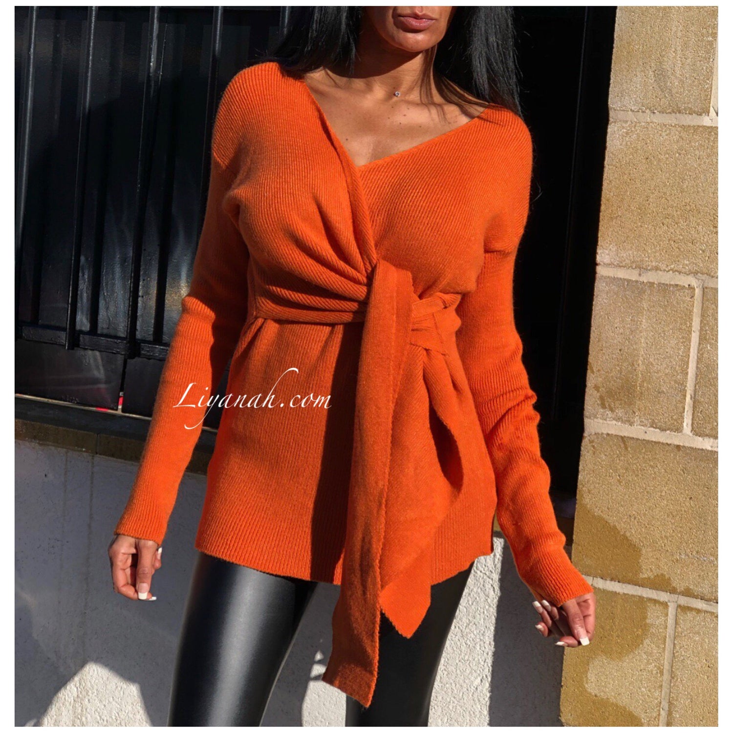 Pull Cache-Coeur Modèle KYRYA ROUILLE - Pull Tout doux, tout chaud et agréable à porter, cache cœur avec noeud épais à nouer à l’avant !! Taille Unique du 34 au 40 - 52% Viscose 26% Polyester 22% Polyamide 🖤Empreint d'élégance, il épouse les formes et sublime votre silhouette. Disponible en Noir, Taupe et Rouille