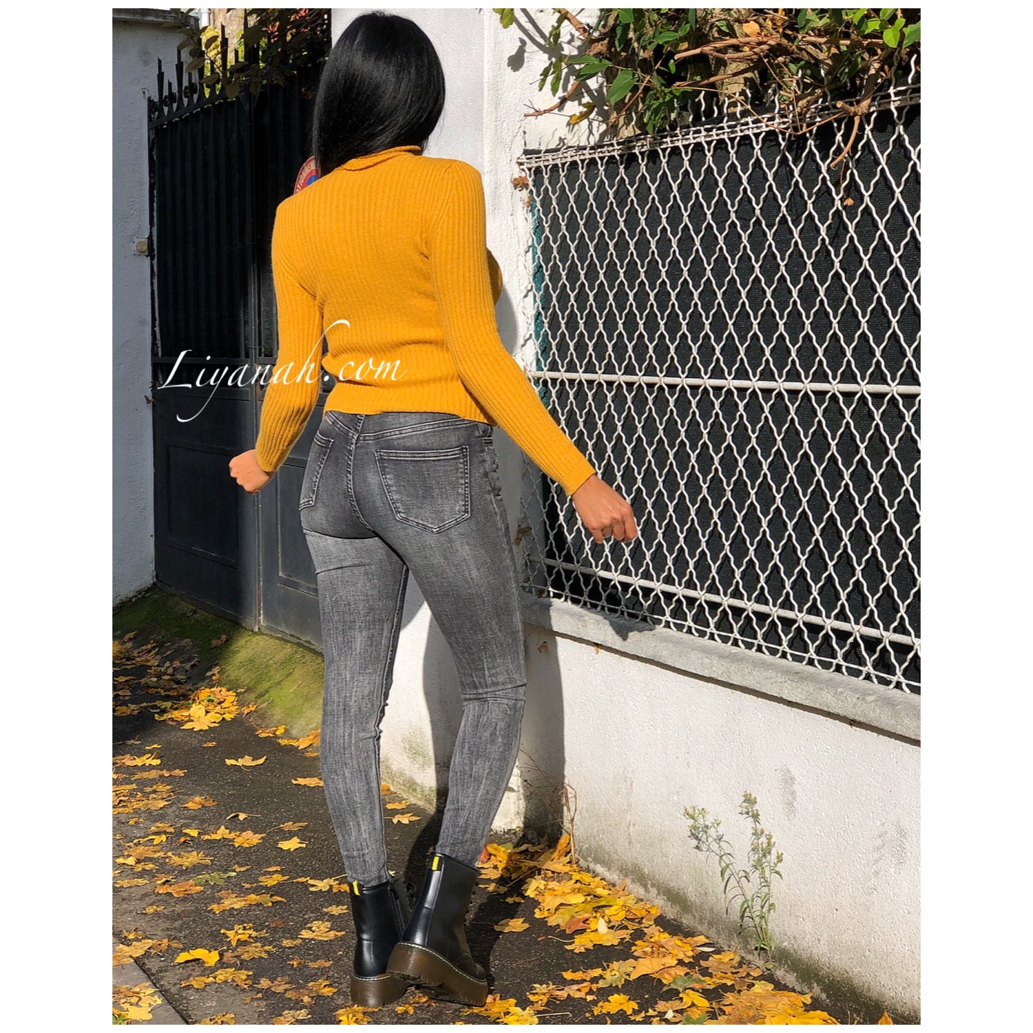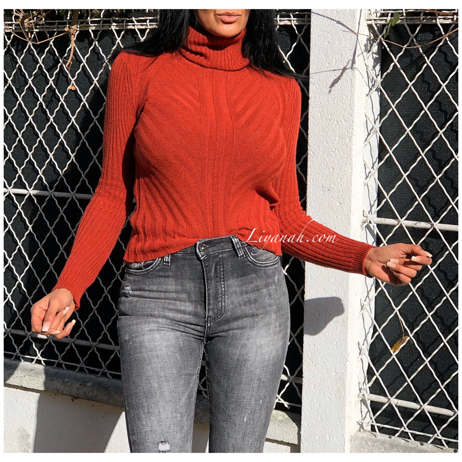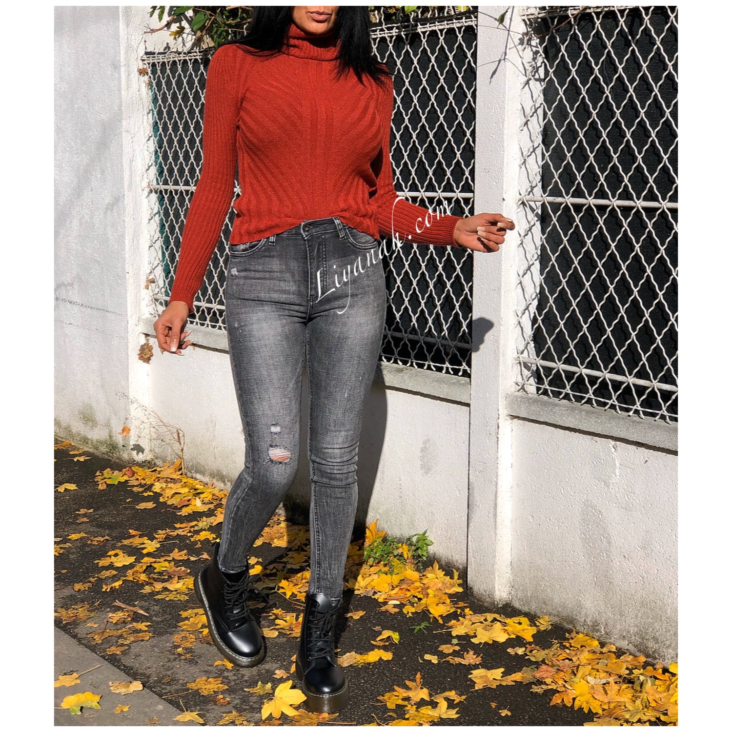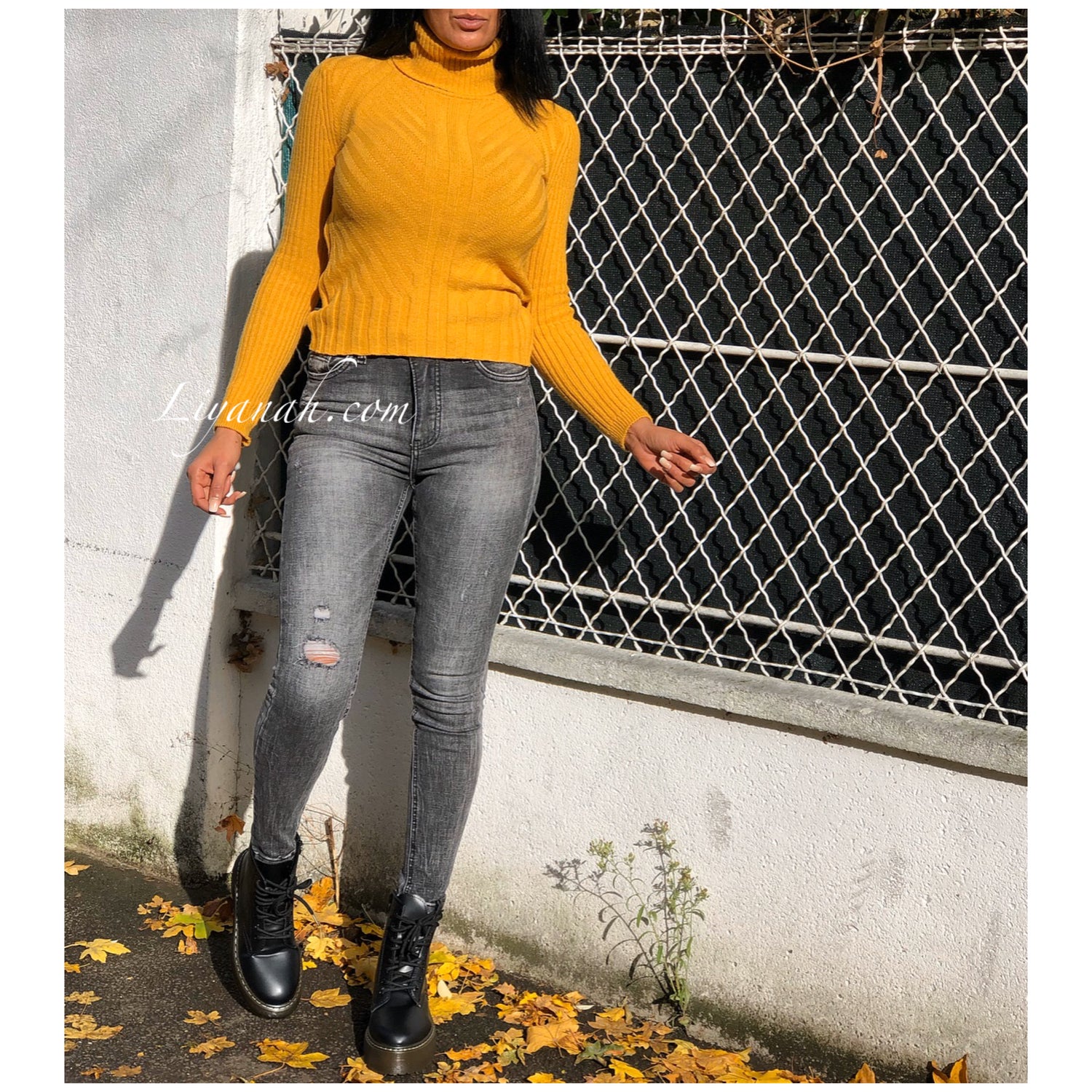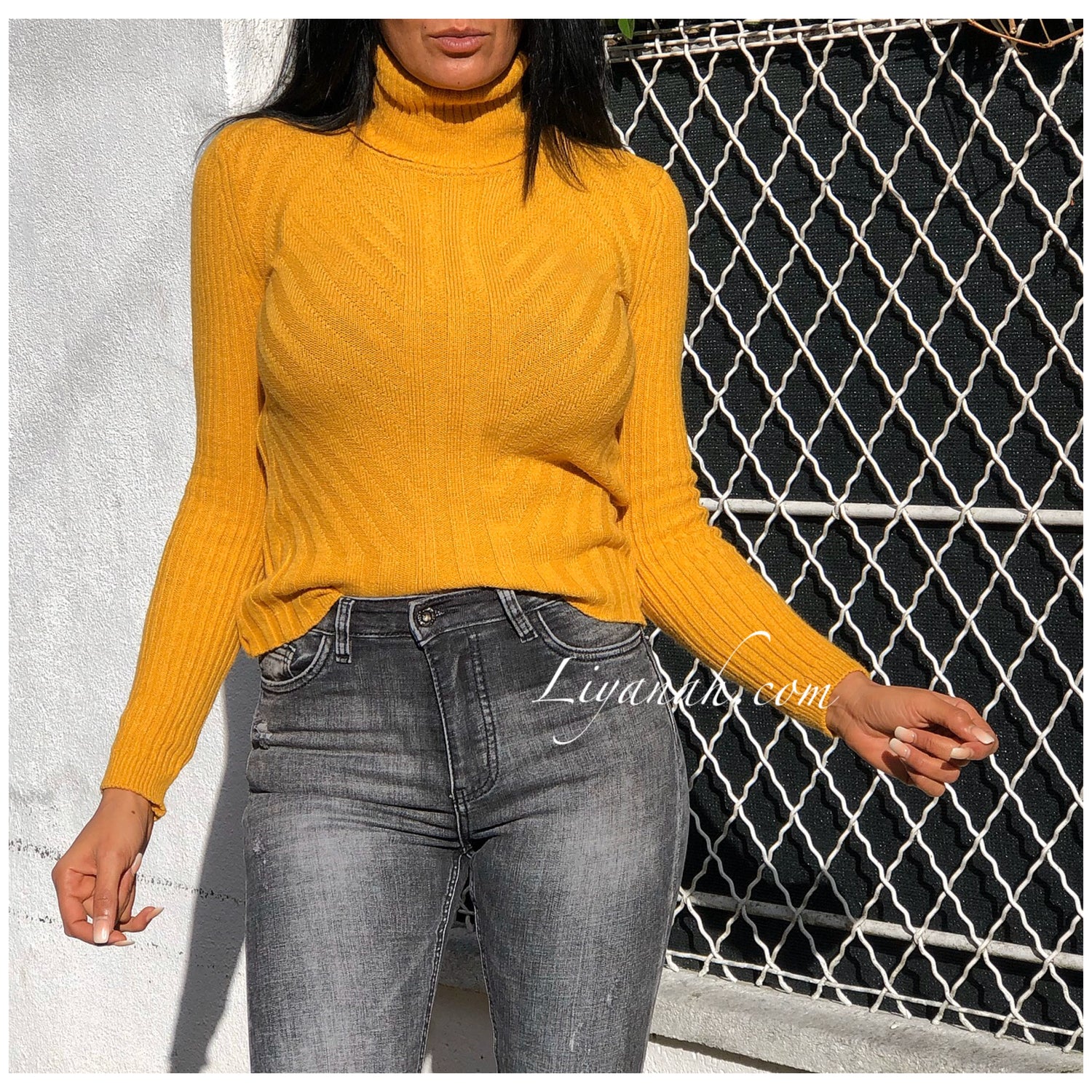 Pull Modèle EYA ROUILLE ou MOUTARDE - Pull col roulé fin et près du corps, détails côtelé - Taille unique du 34 au 38 - 52% Viscose 21% Polyamide 26% PBT