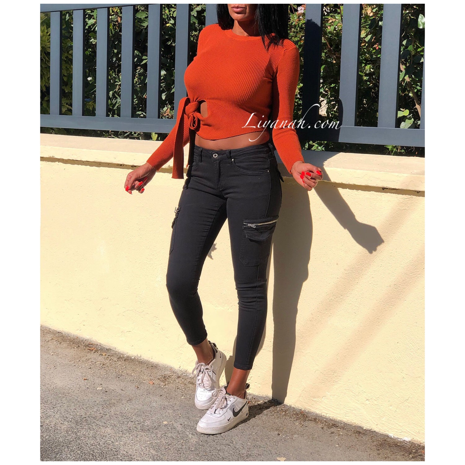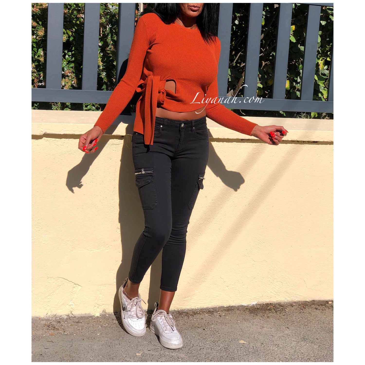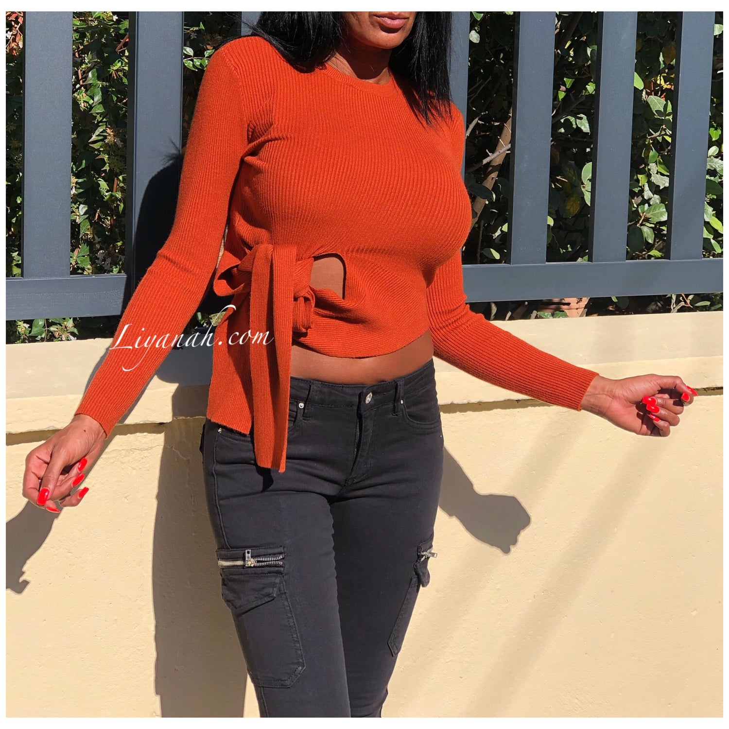 Pull Modèle LIBBY ROUILLE - Pull légèrement court avec noeud fixe à nouer sur le côté, manches longues, col rond et coupe près du corps - 70% Coton 25% Polyester 5% Elasthanne (Taille Unique du 34 au 38)