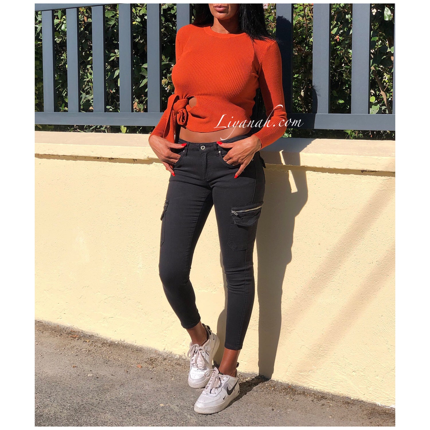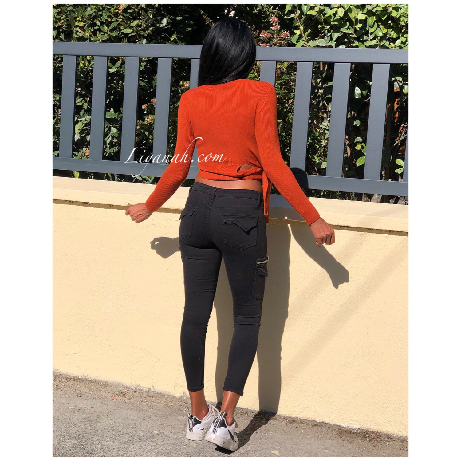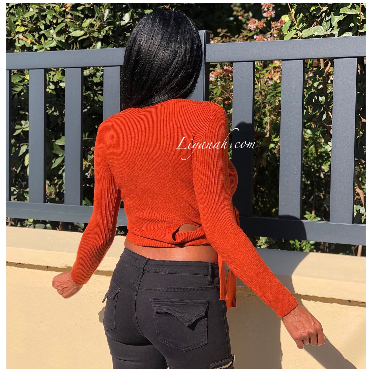 Pull Modèle LIBBY ROUILLE - Pull légèrement court avec noeud fixe à nouer sur le côté, manches longues, col rond et coupe près du corps - 70% Coton 25% Polyester 5% Elasthanne (Taille Unique du 34 au 38)