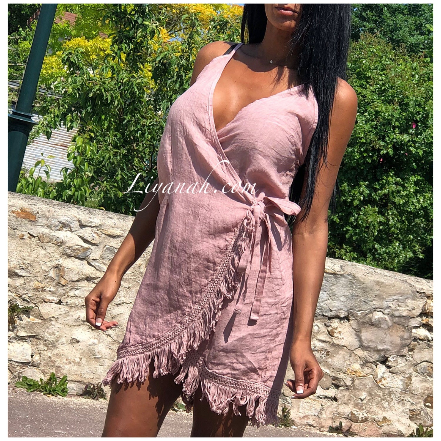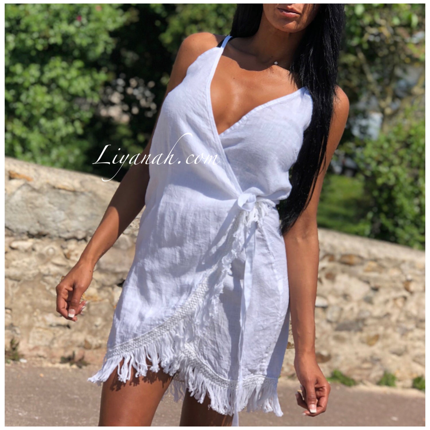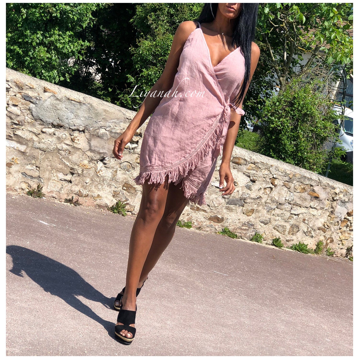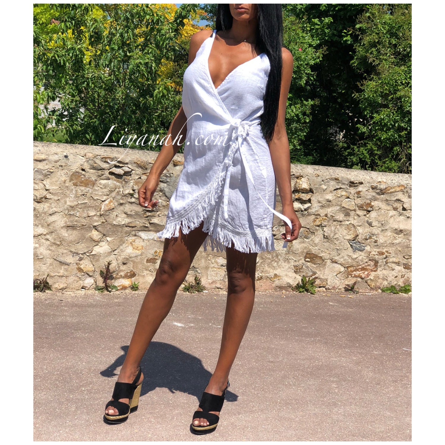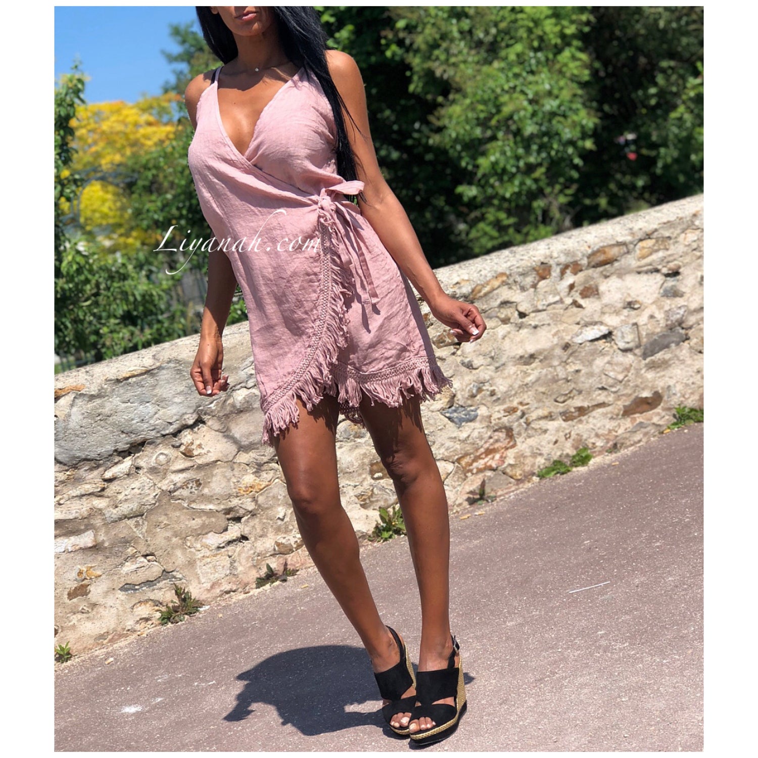 Robe Cache cœur Courte Modèle FAHYMA Écru, Blanc ou Rose Elle est totalement décontractée - On craque sur le modèle Cache cœur !!! 100% LIN ... 🌸 Détails sur le contour de la robe 🌸 Taille unique De La taille 34 à 38 - Longueur environ 86 cm