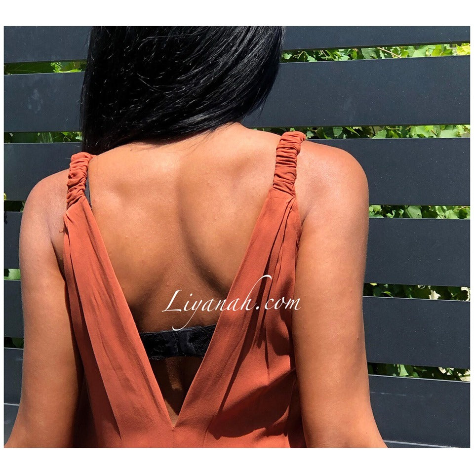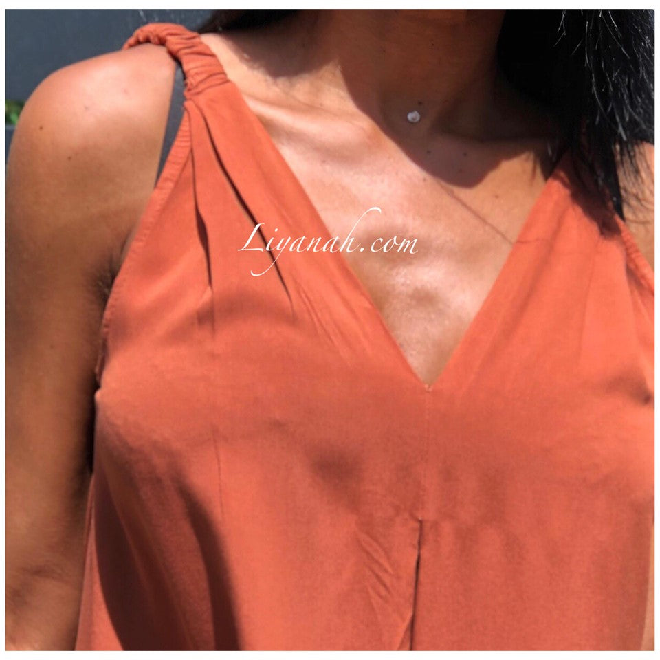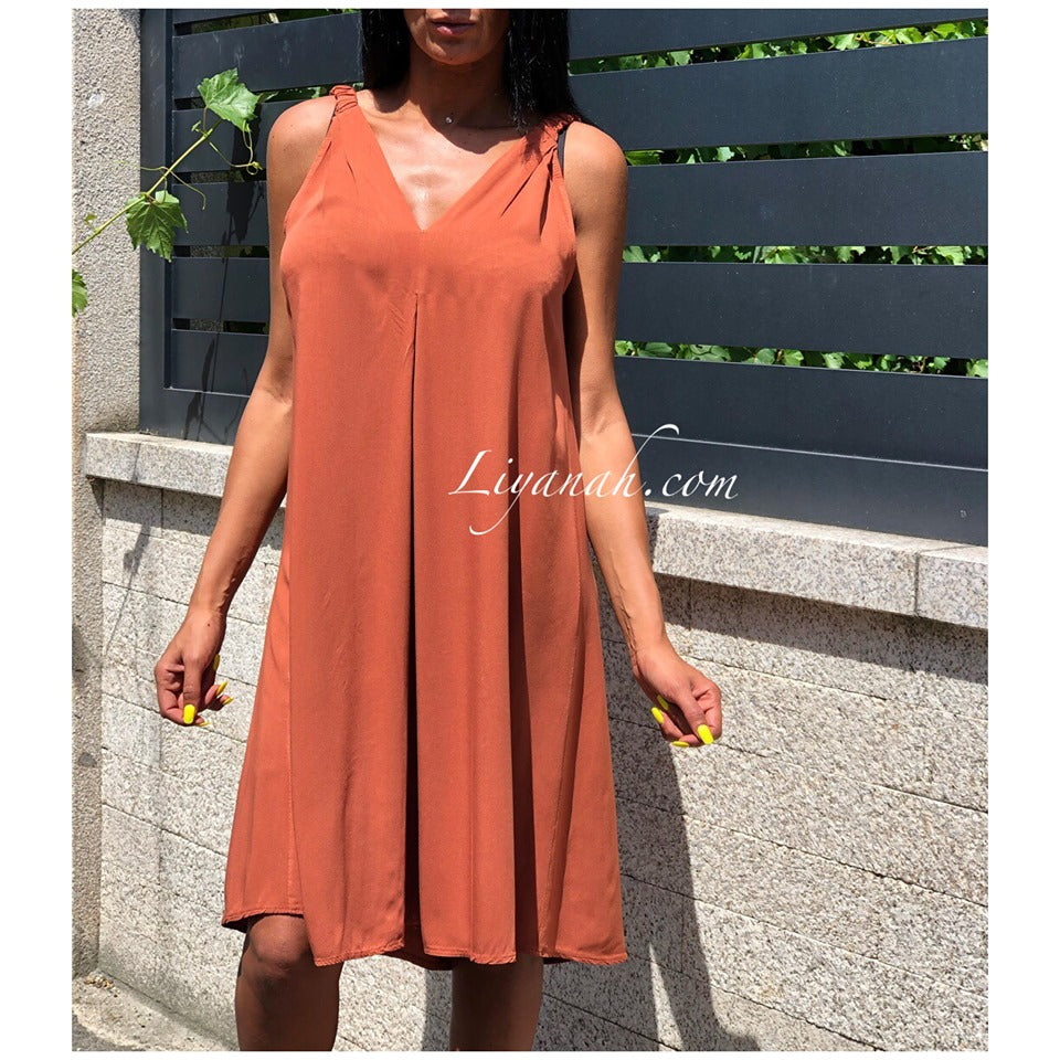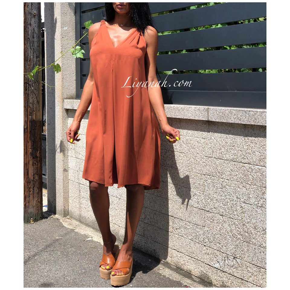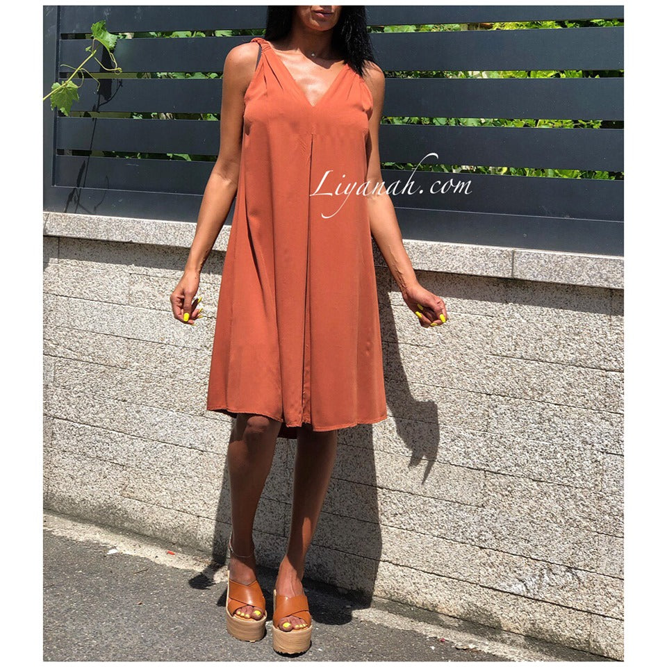 Robe Courte Modèle JOCYA ROUILLE - Robe à enfiler à bretelles élastiques non réglables - Coupe large - Décolleté avant et arrière - Confort et Style, modèle évasé et fluide - Tout en simplicité ❤️50% TENCEL 50% VISCOSE - Taille Unique du 34 au 42