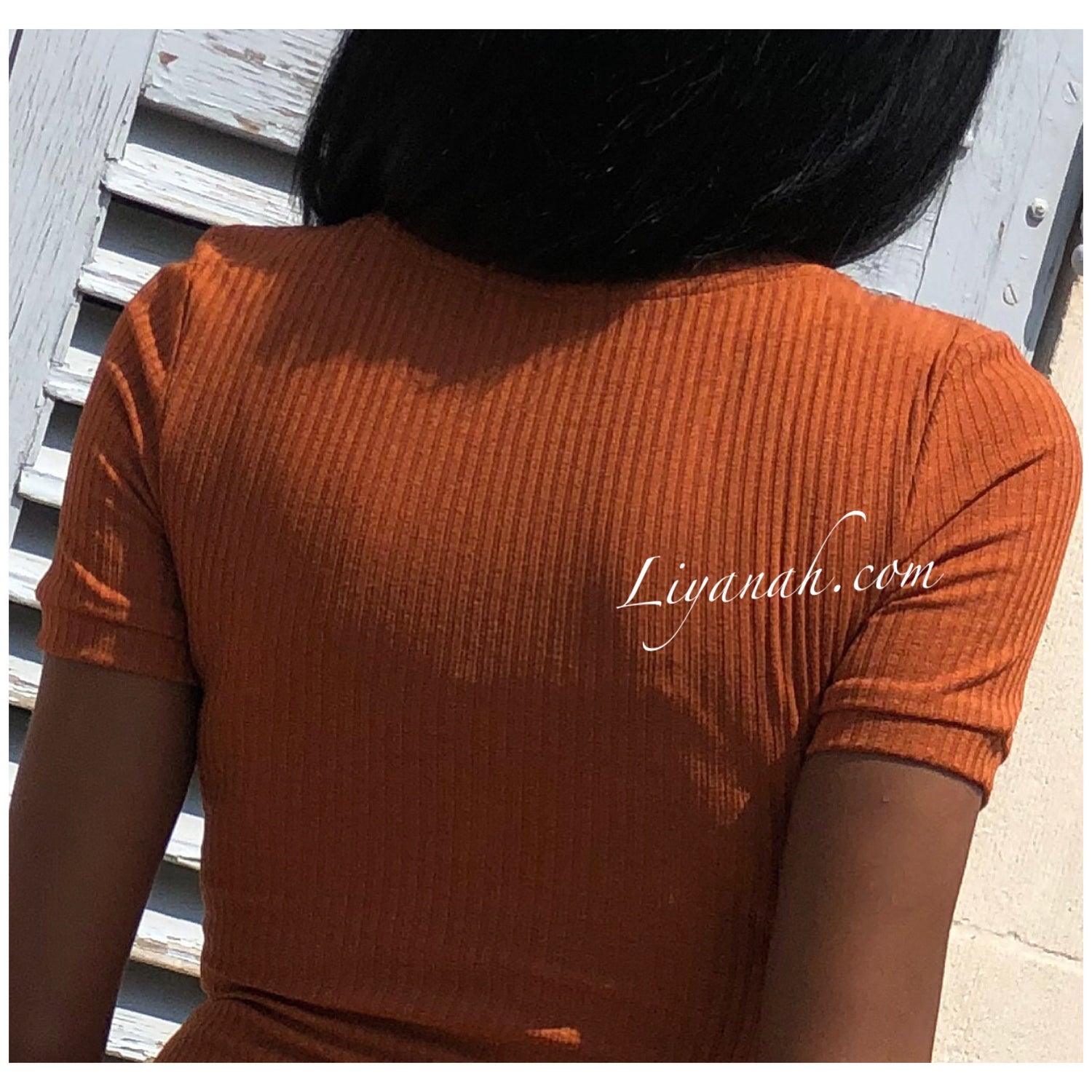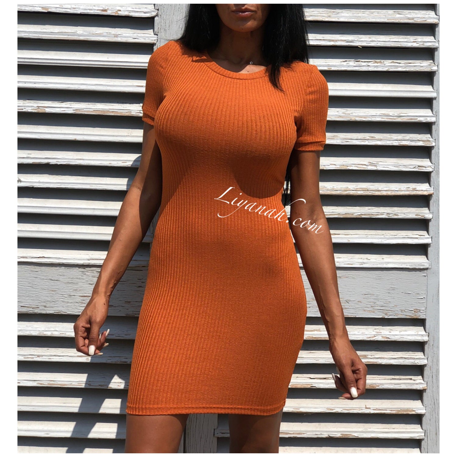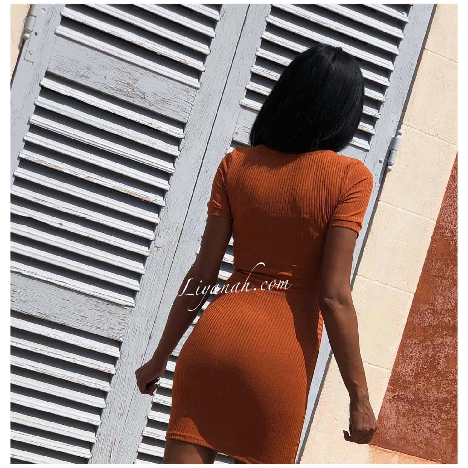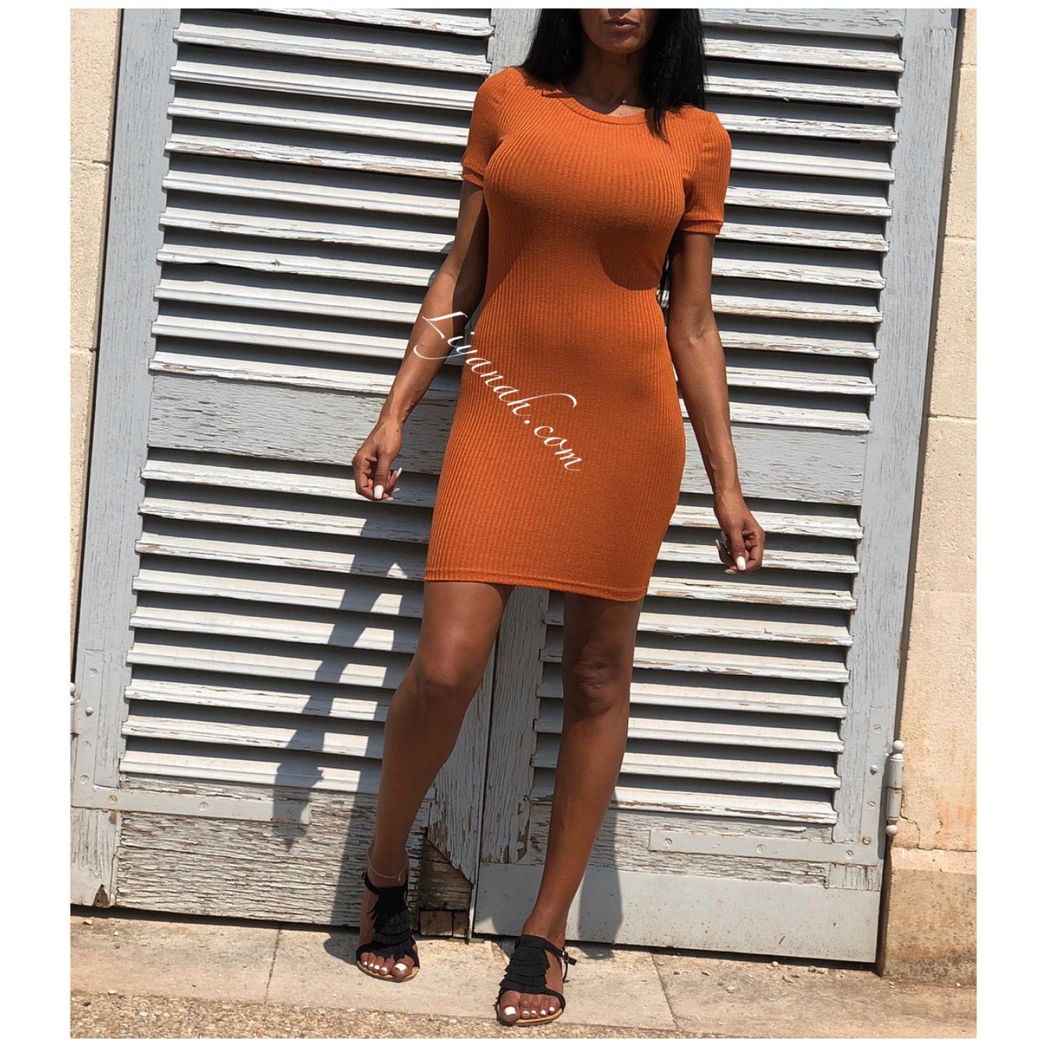 Robe Courte Modèle LENYRA ROUILLE - Coupe près du corps et se porte courte - Col Rond - Tissus côtelé ✖️Matière agréable à porter tout doux 🌸 90% Polyester 10% Elasthanne - Taille XS à L - Notre modèle porte une taille XS, fait une taille 34 et mesure 1m70 ✖️ Disponible en Noir, Rouille et Jaune