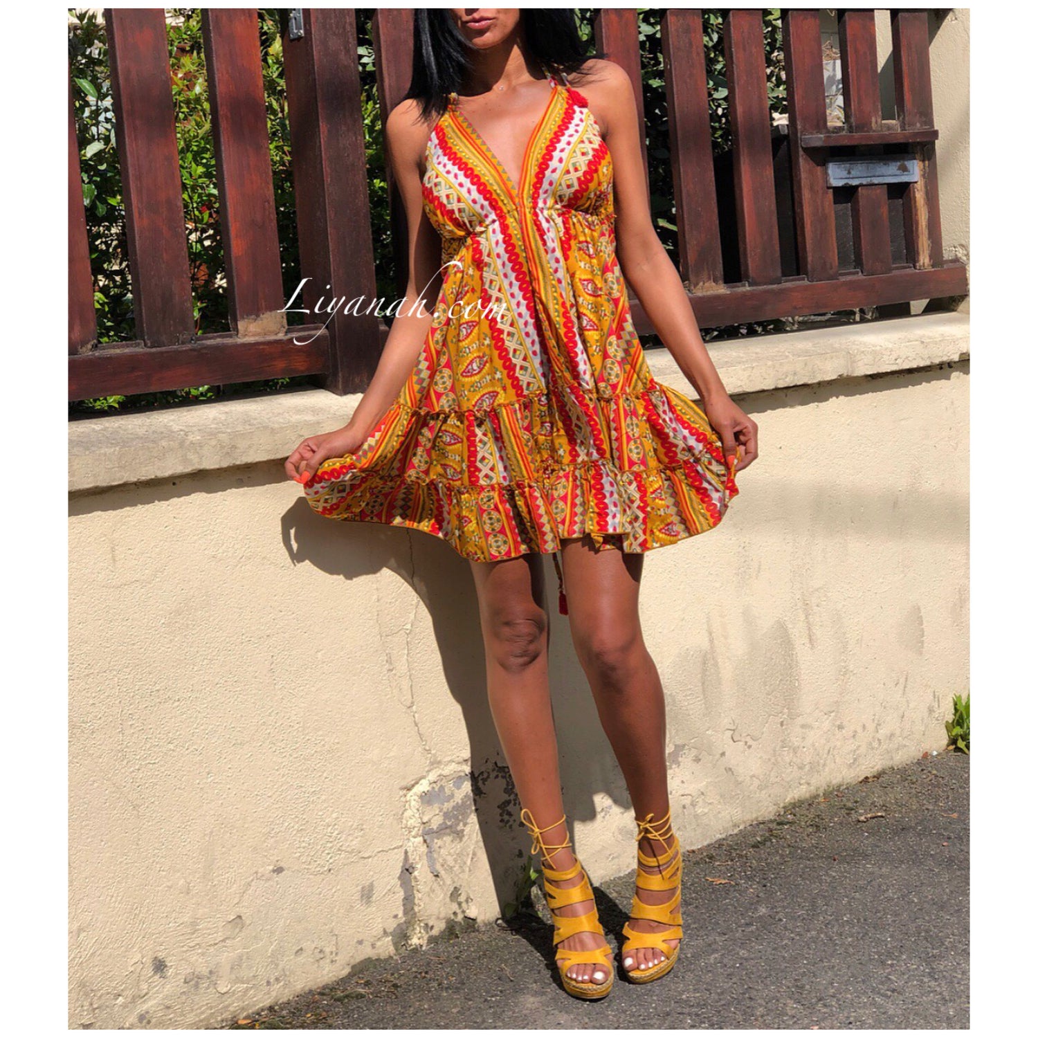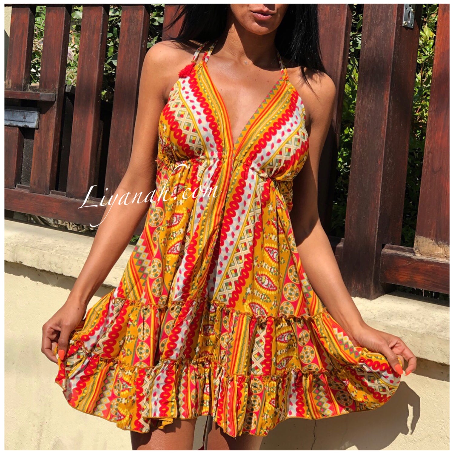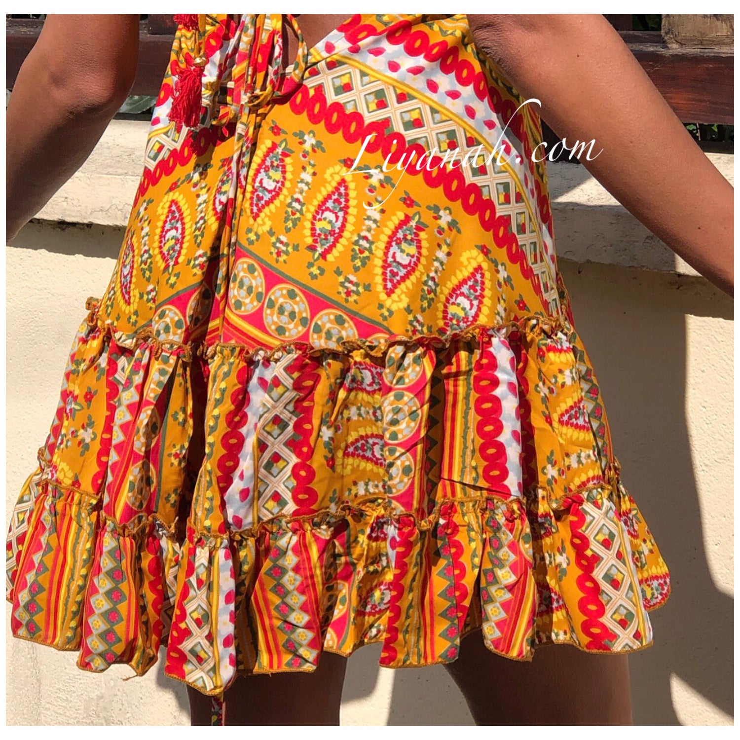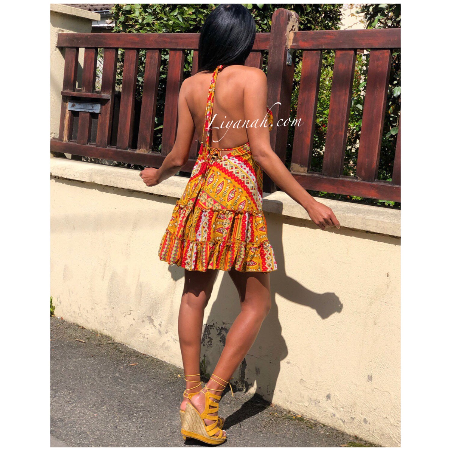 Robe Courte Modèle MOEA - Une robe courte légèrement Asymétrique - Noeud à nouer au dos qui permet de se resserrer à la poitrine et noeud au cou pour resserrer également - Robe à enfiler Dos nu  ... Taille 34/36 ou 38/40 - 100% Polyester - Très agréable à porter et très fluide !!! Portez là à la plage ou piscine sur un maillot de bain ou de sortie avec des sandales ... Elle s’adaptera à vos envies (Longueur : 79 cm)