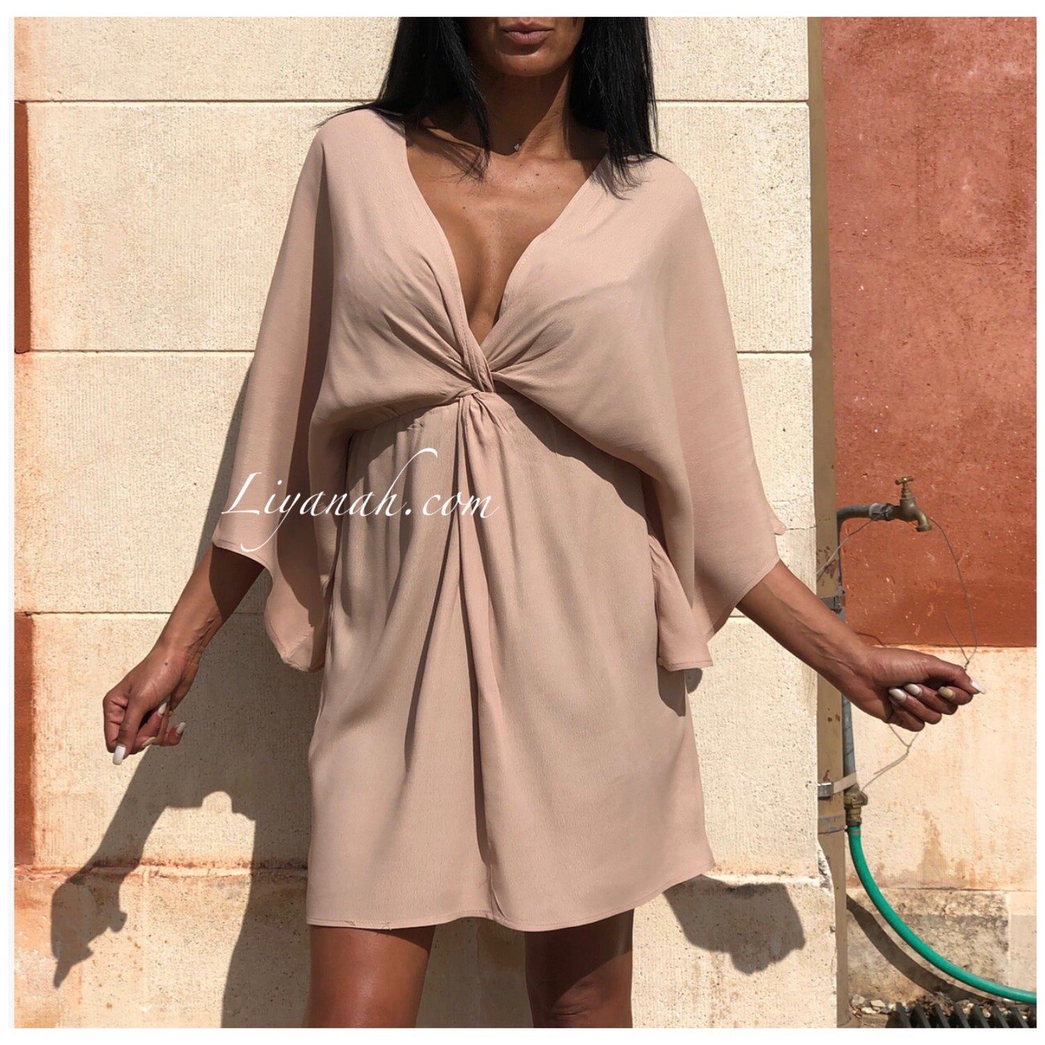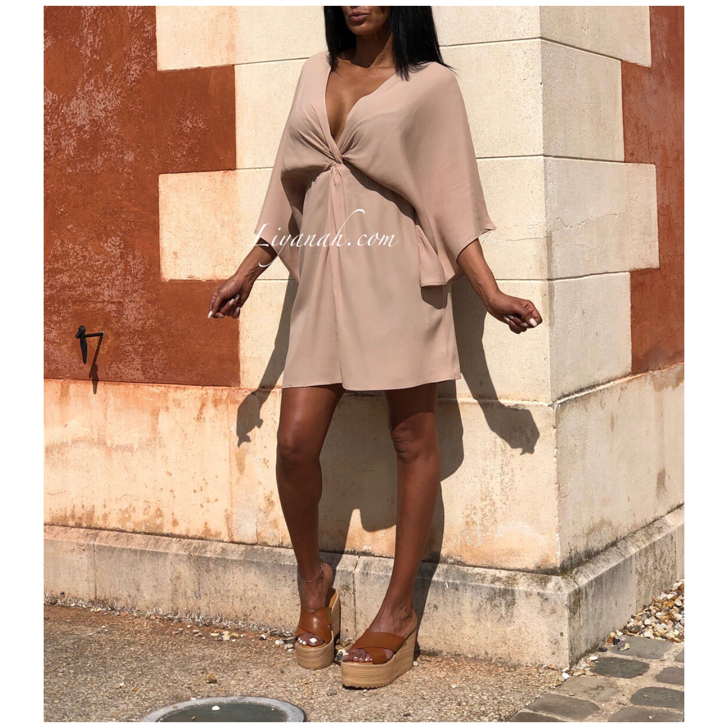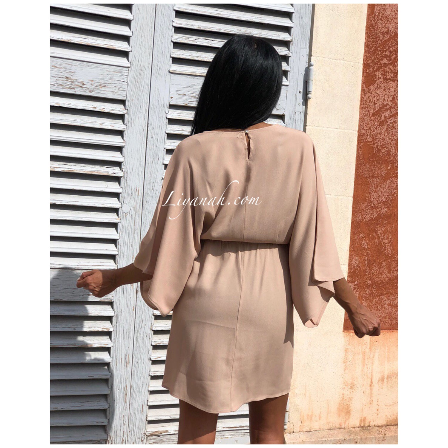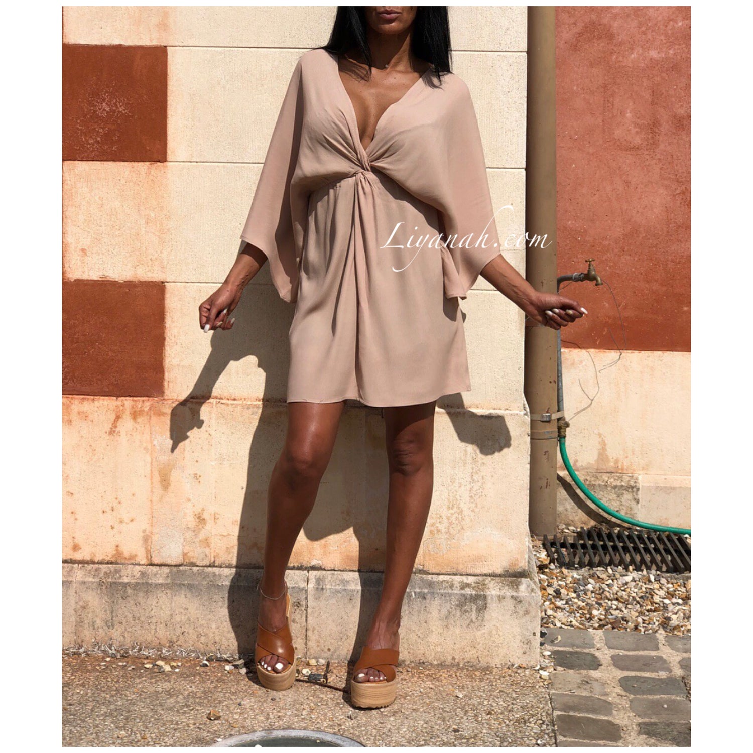 Robe Courte Modèle YELYNA BEIGE - Robe courte style robe de plage, couture fixe nouer sous la poitrine pour un jolie décolleté plongeant et manches évasées, fermeture bouton au cou à l’arrière, élastique à la taille, Matière fluide et agréable à porter - Taille 34/36 ou 38/40 - 100% Polyester