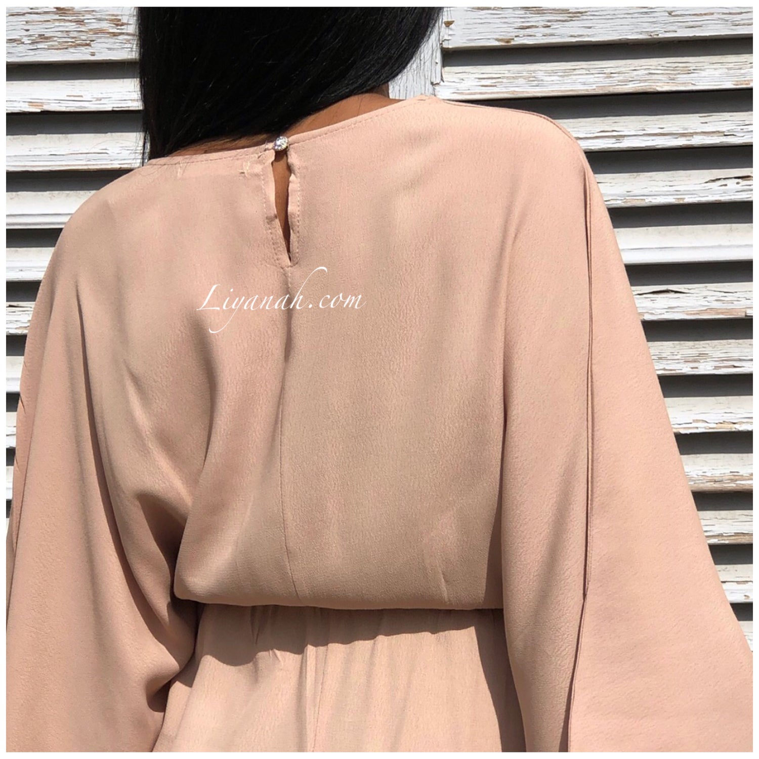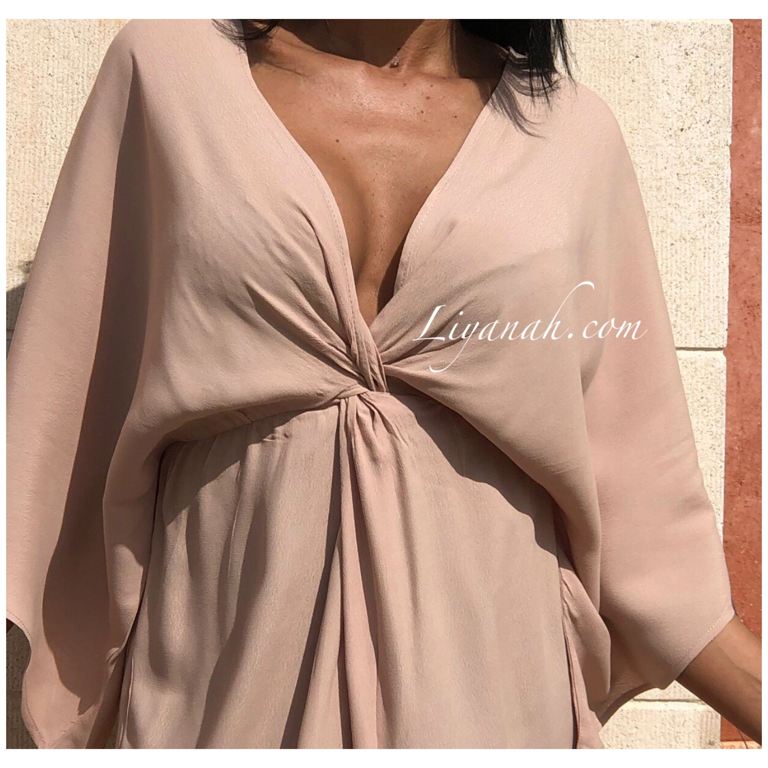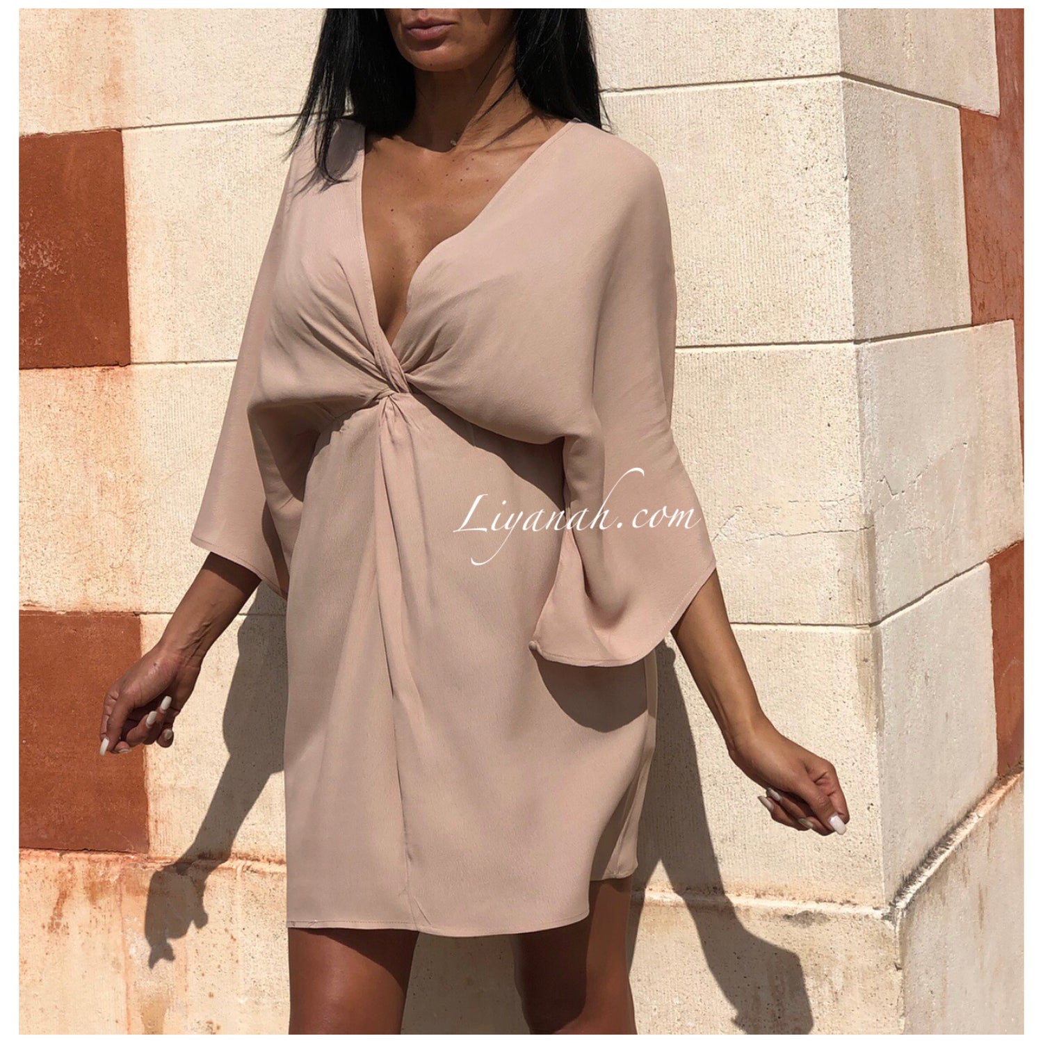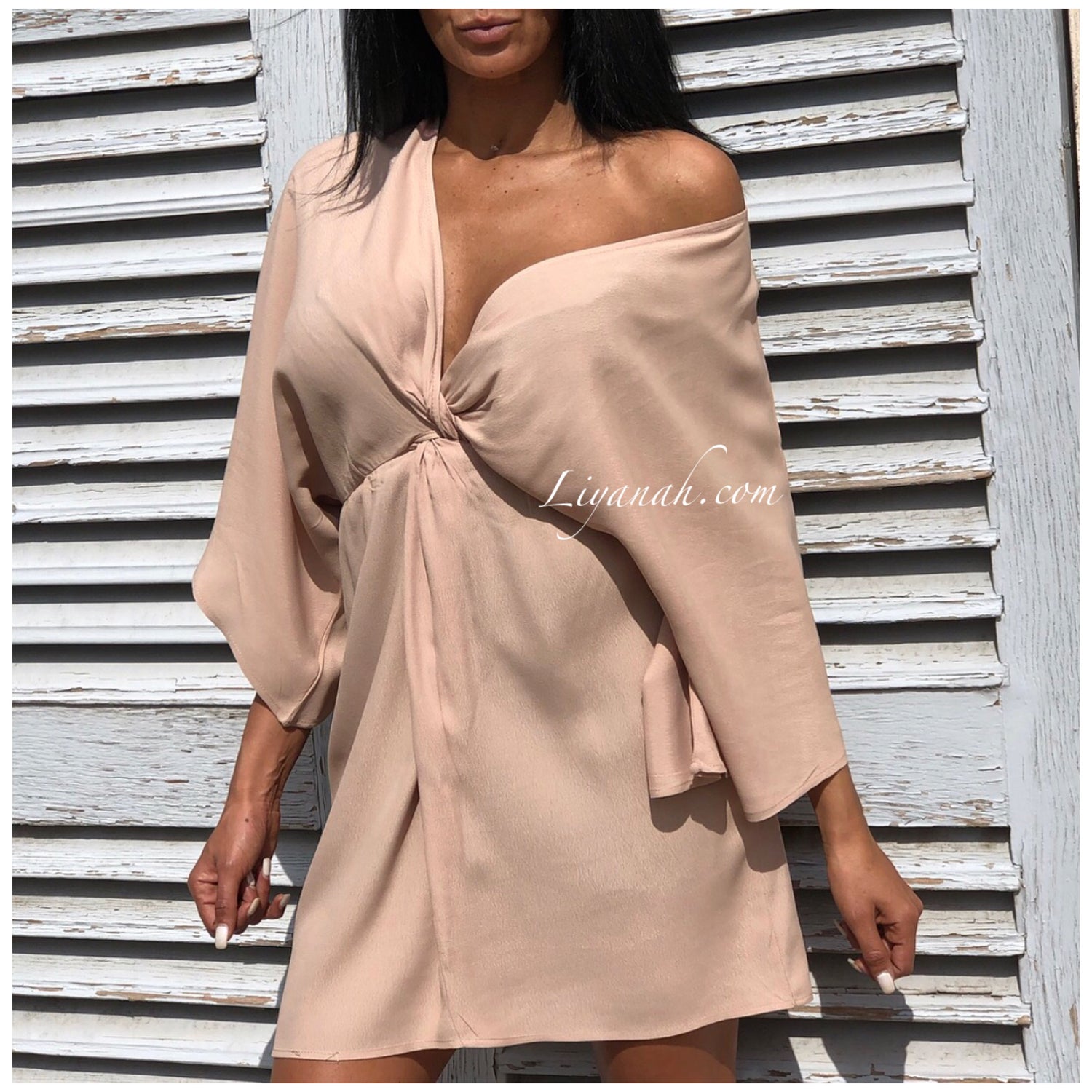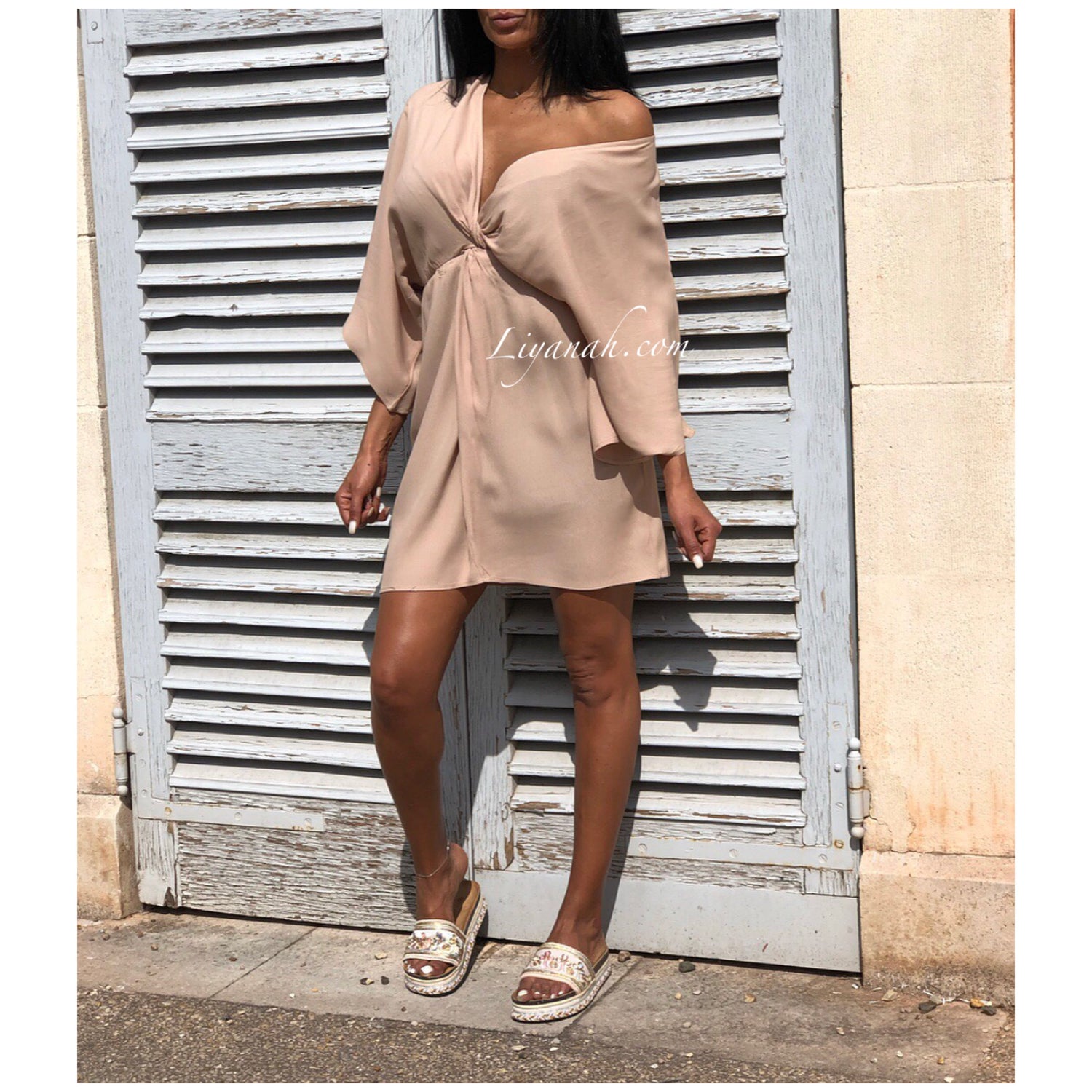 Robe Courte Modèle YELYNA BEIGE - Robe courte style robe de plage, couture fixe nouer sous la poitrine pour un jolie décolleté plongeant et manches évasées, fermeture bouton au cou à l’arrière, élastique à la taille, Matière fluide et agréable à porter - Taille 34/36 ou 38/40 - 100% Polyester