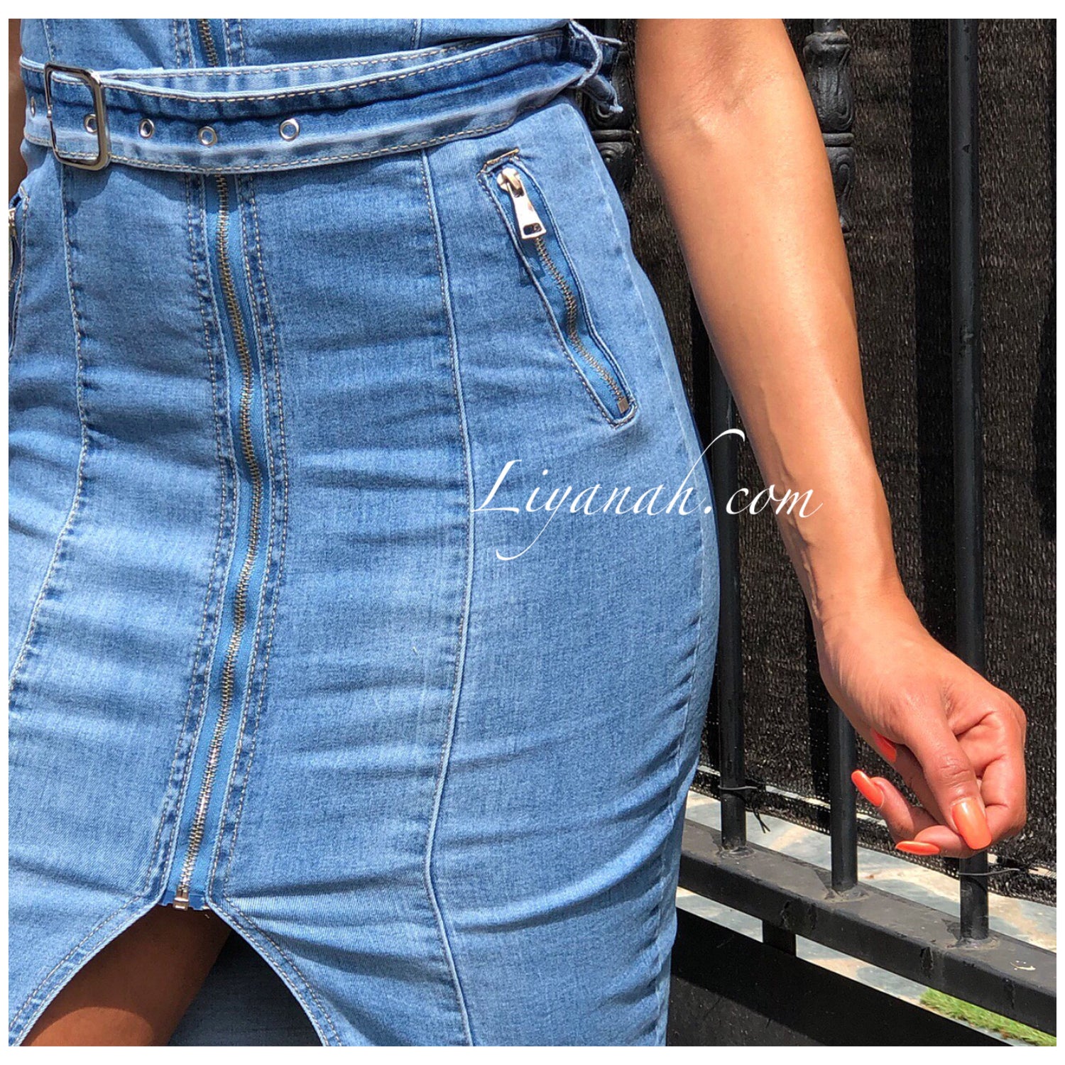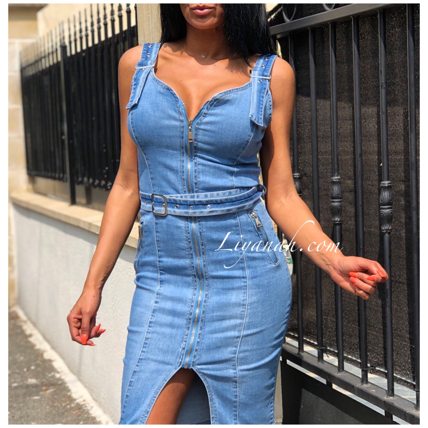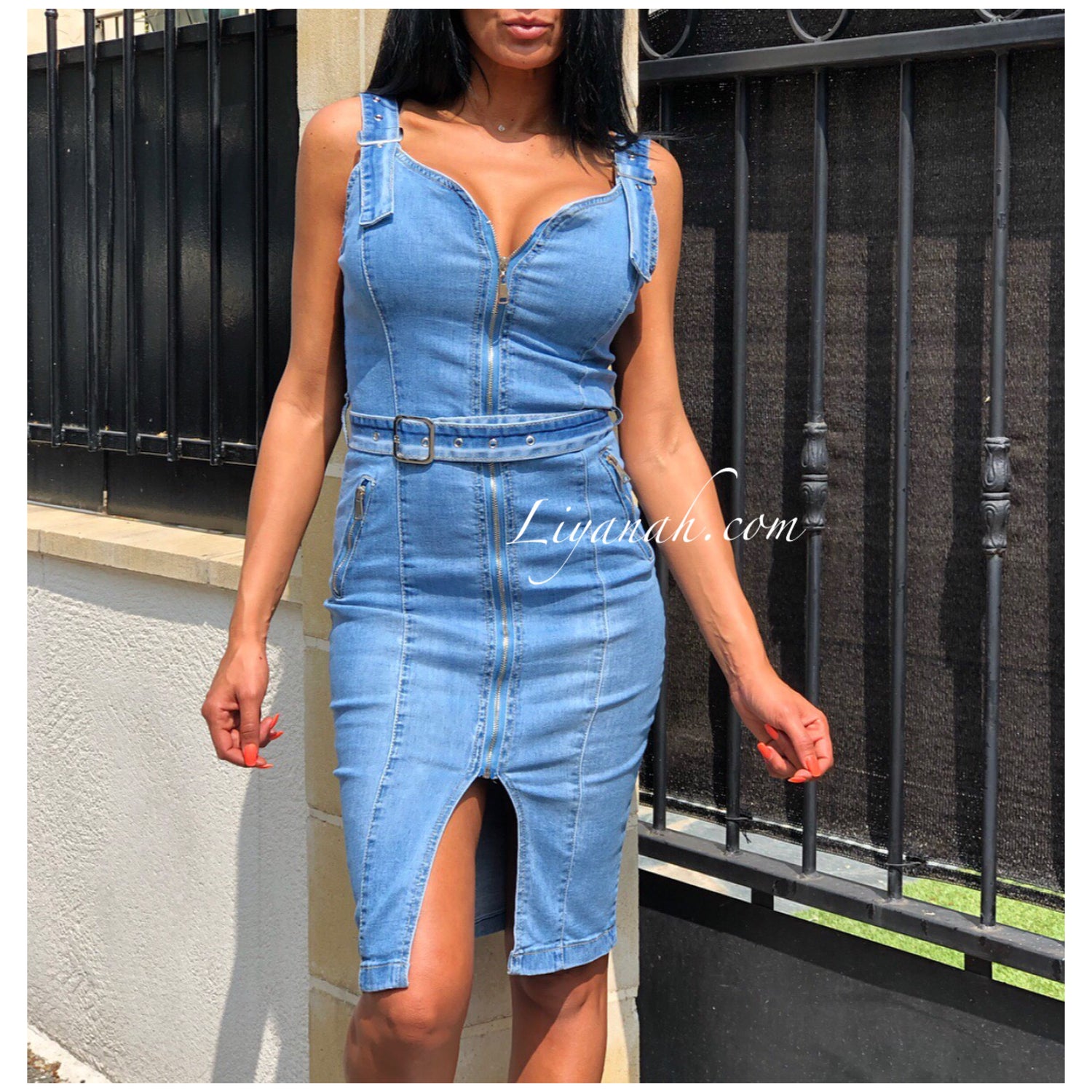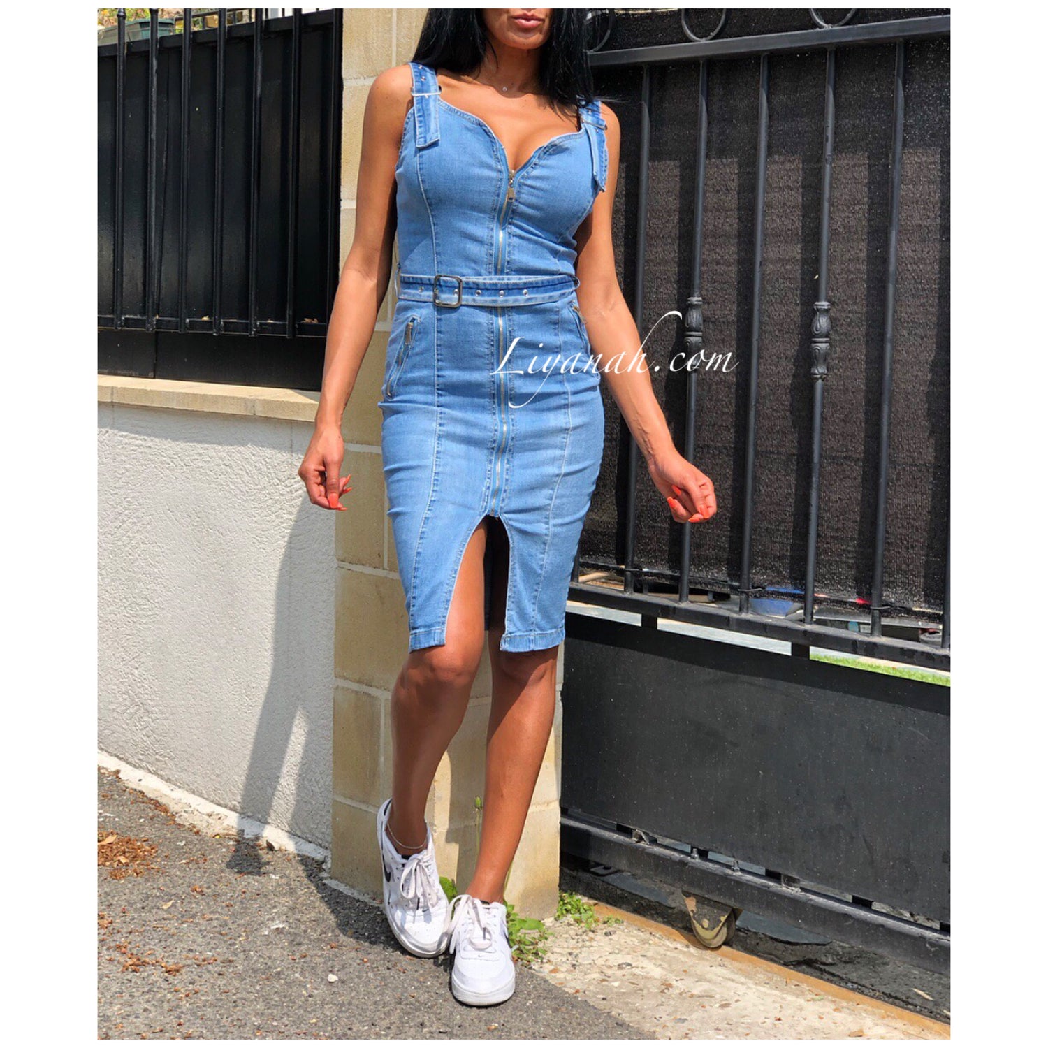 Robe en JEAN Modèle CHYBA BLUE  - Robe jean Bleu avec fausses poches et ceintures à la taille, FERMETURE ZIP à l’avant et bretelles réglables - COUPE PRÈS DU CORPS - 98% COTTON 2% Elasthanne - Taille XS au L - Notre modèle fait une taille 34 et porte une taille XS