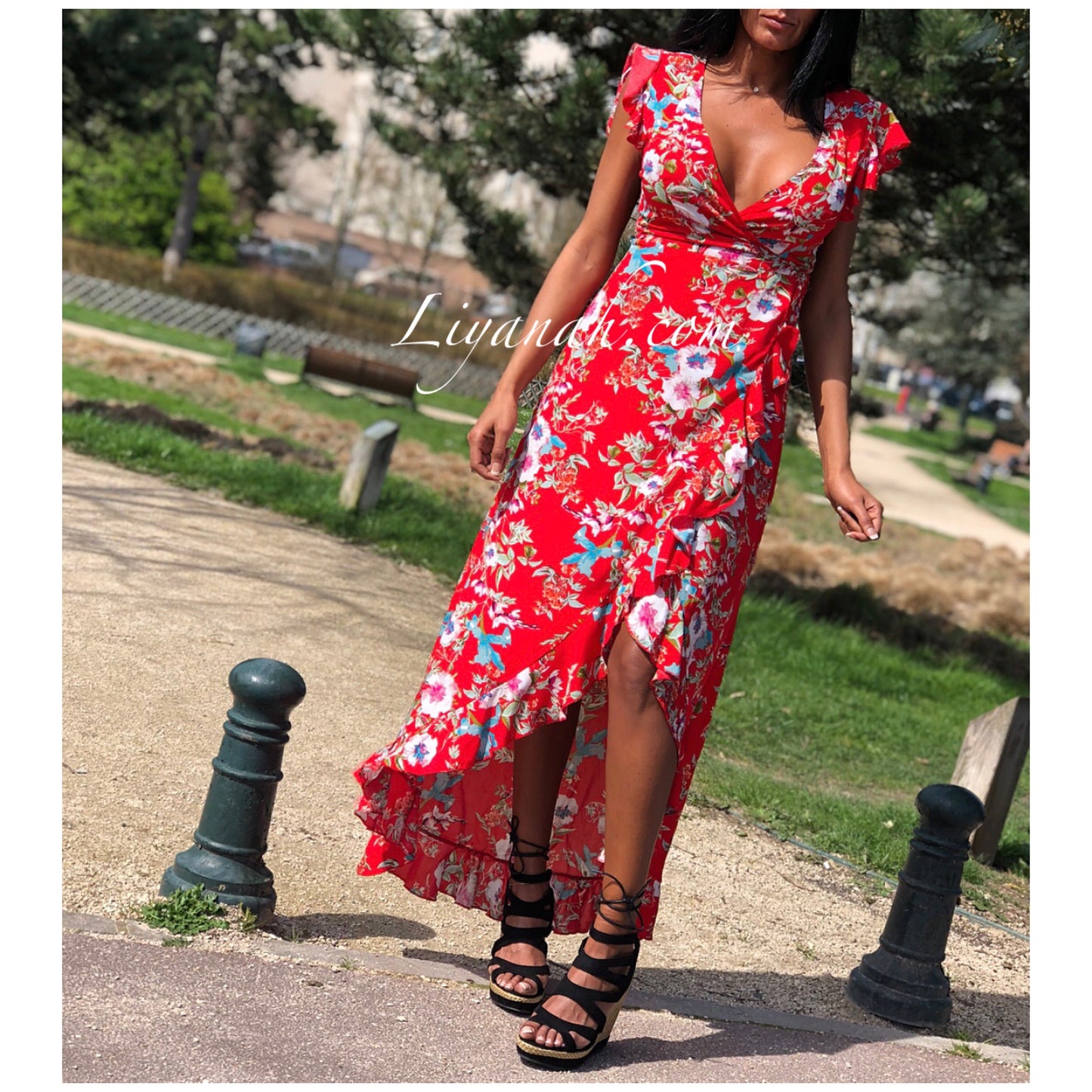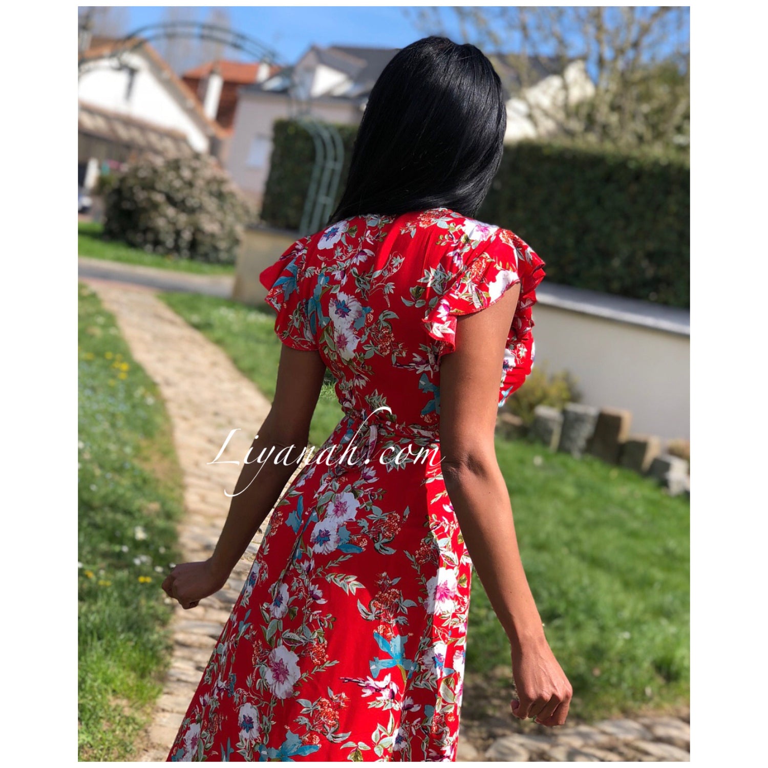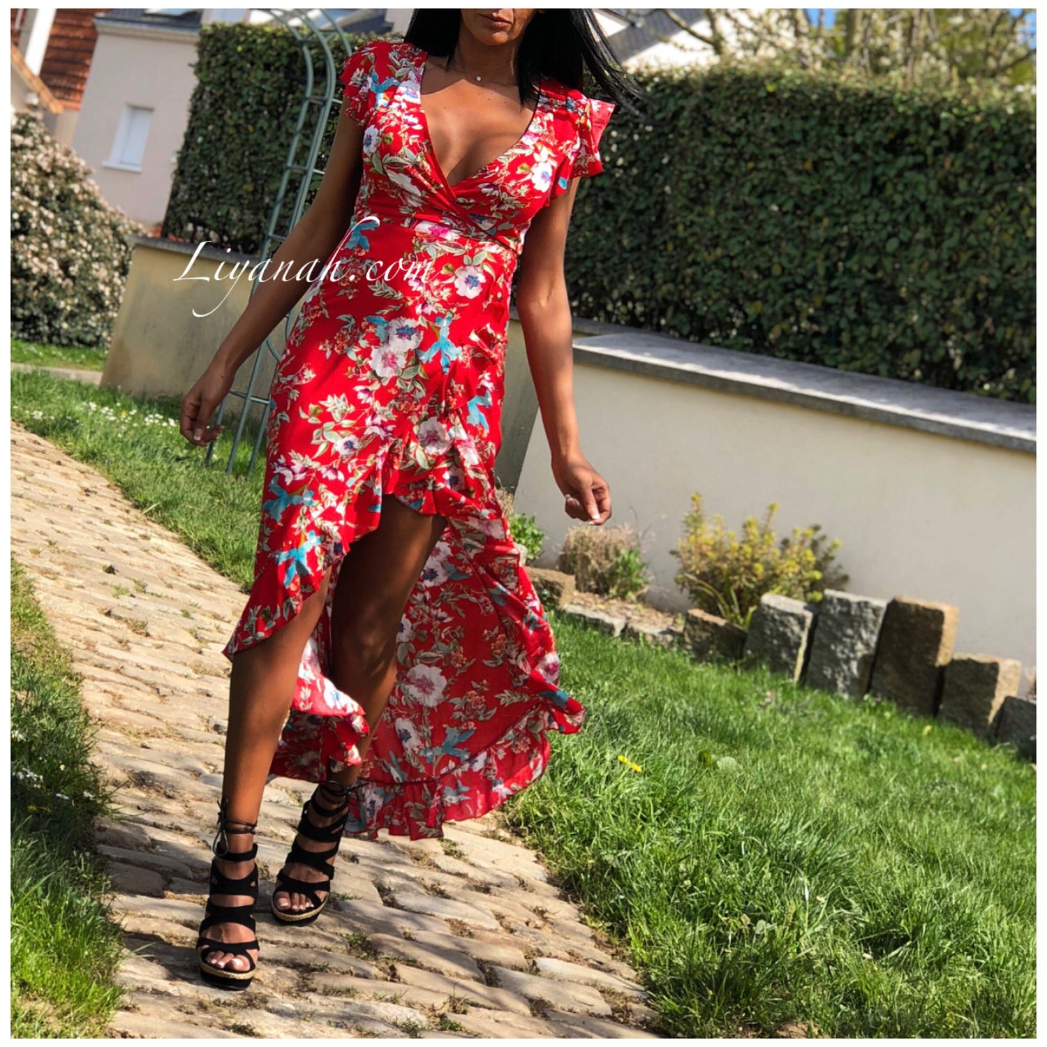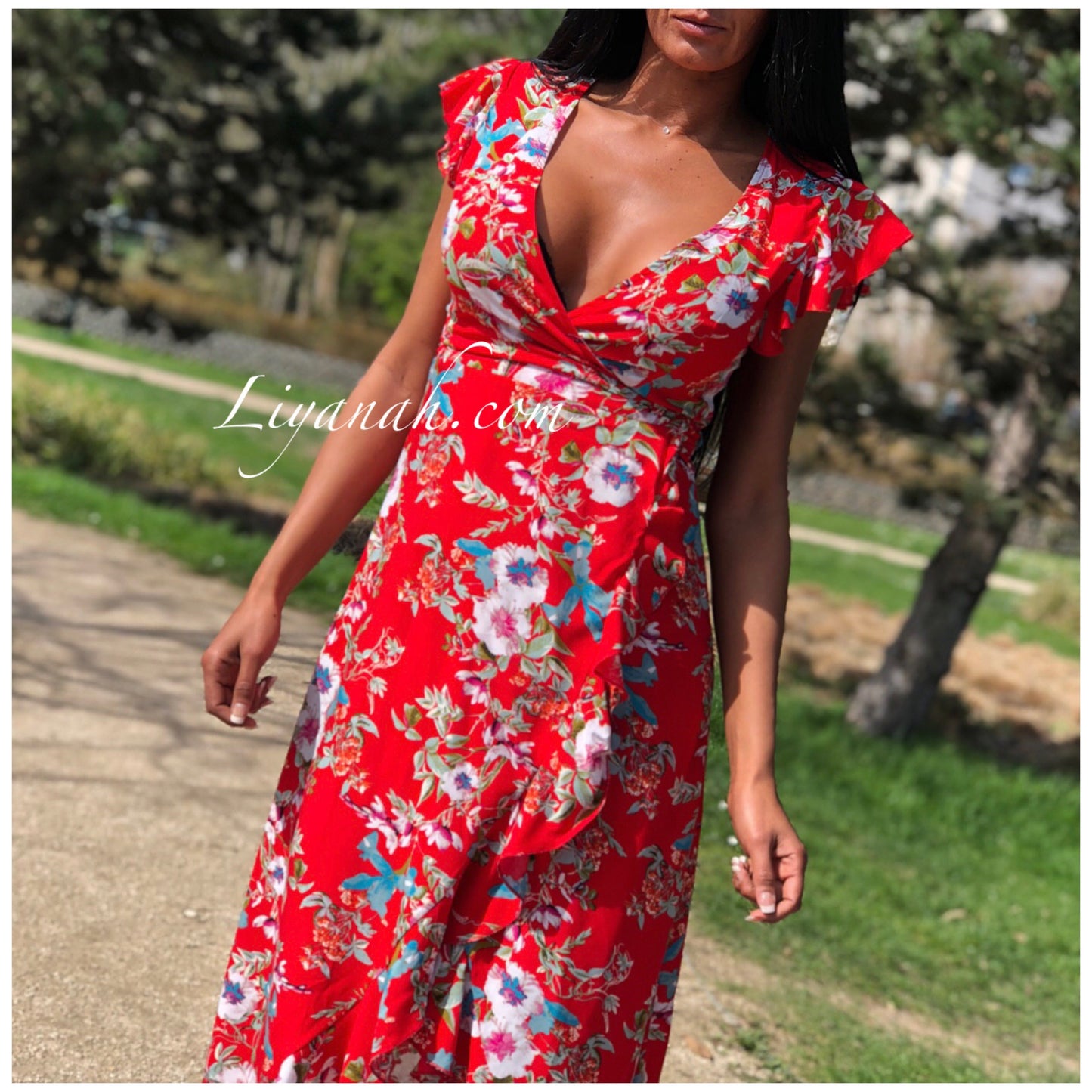 Une Robe longue derrière et plus courte à l’avant !!! Modèle à volant, ceintures fixe à nouer Cache Cœur 🌸 Imprimé fleuri !!! Robe à Croisée a l’avant - Corsage ajusté et jupe évasée (Taille XS à L) Taille normalement !! Disponible en Noir, Rouge ou Vert 🖤❤️💚100% RAYON