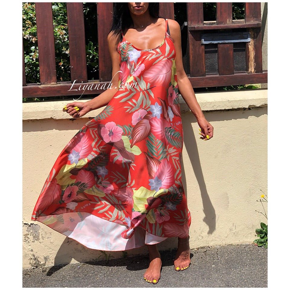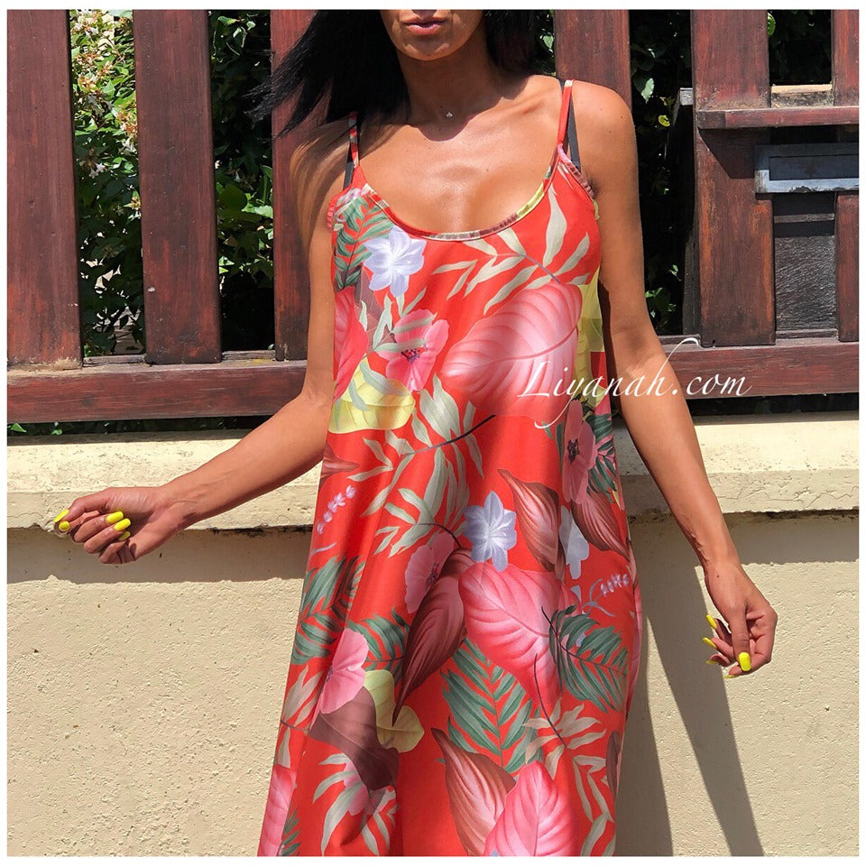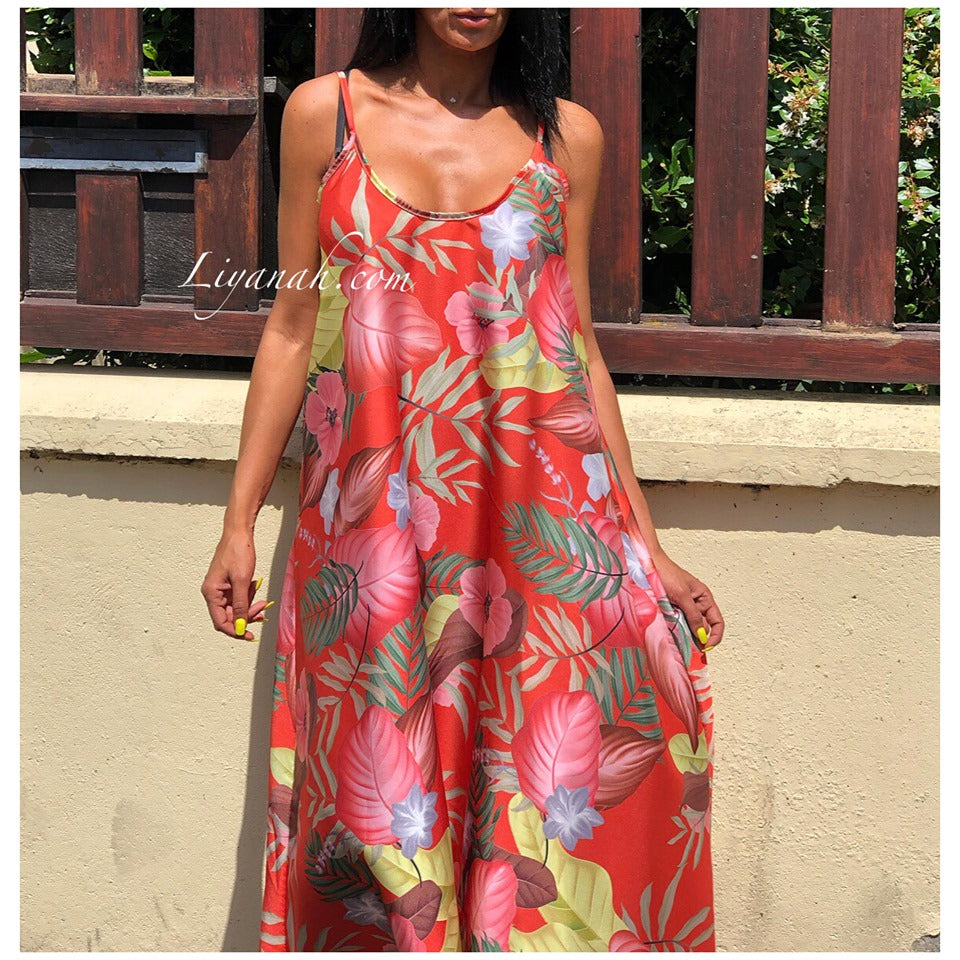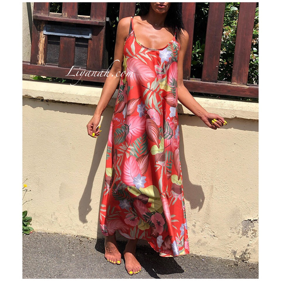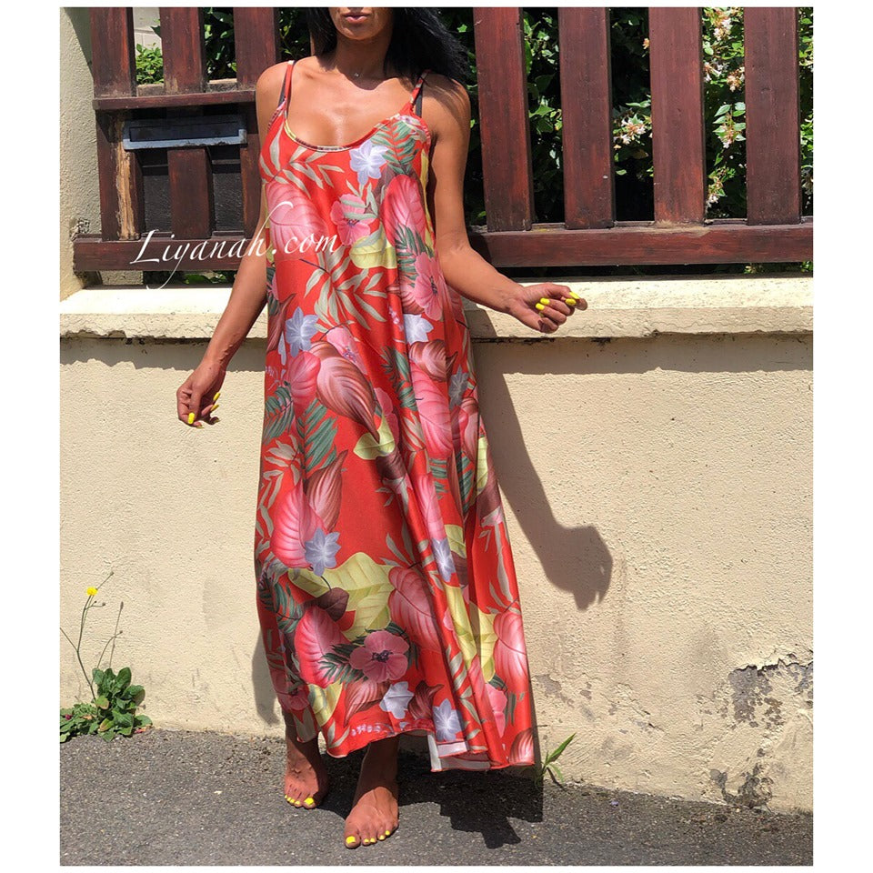 Robe Longue Modèle LYS FLOWERS ORANGE - Robe longue et coupe très large, bretelle non réglable, Aspect satin, Imprimé Fleuri - Modèle à enfiler pour un style chic et décontracté - Taille Unique du 34 au 40 - 100% Polyester