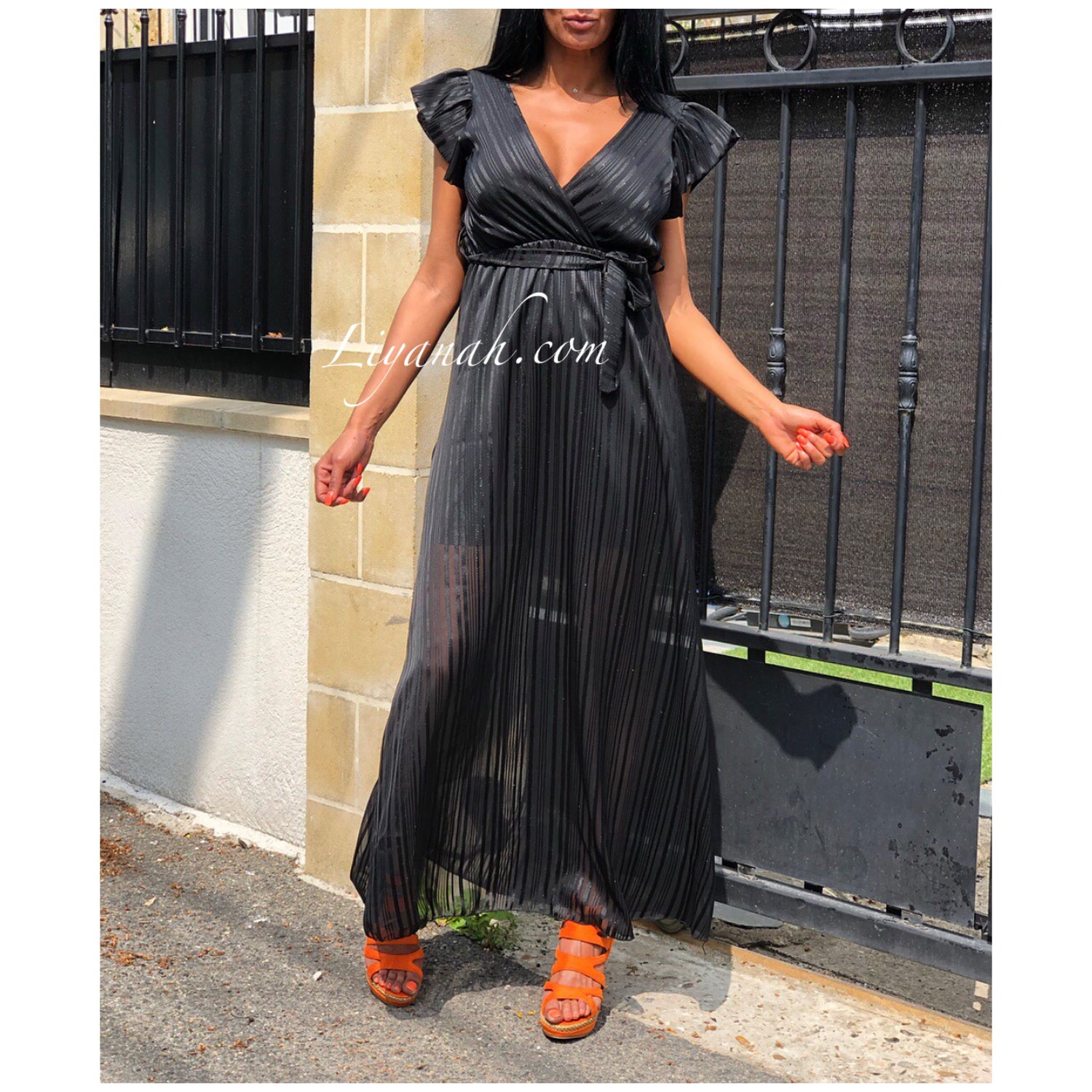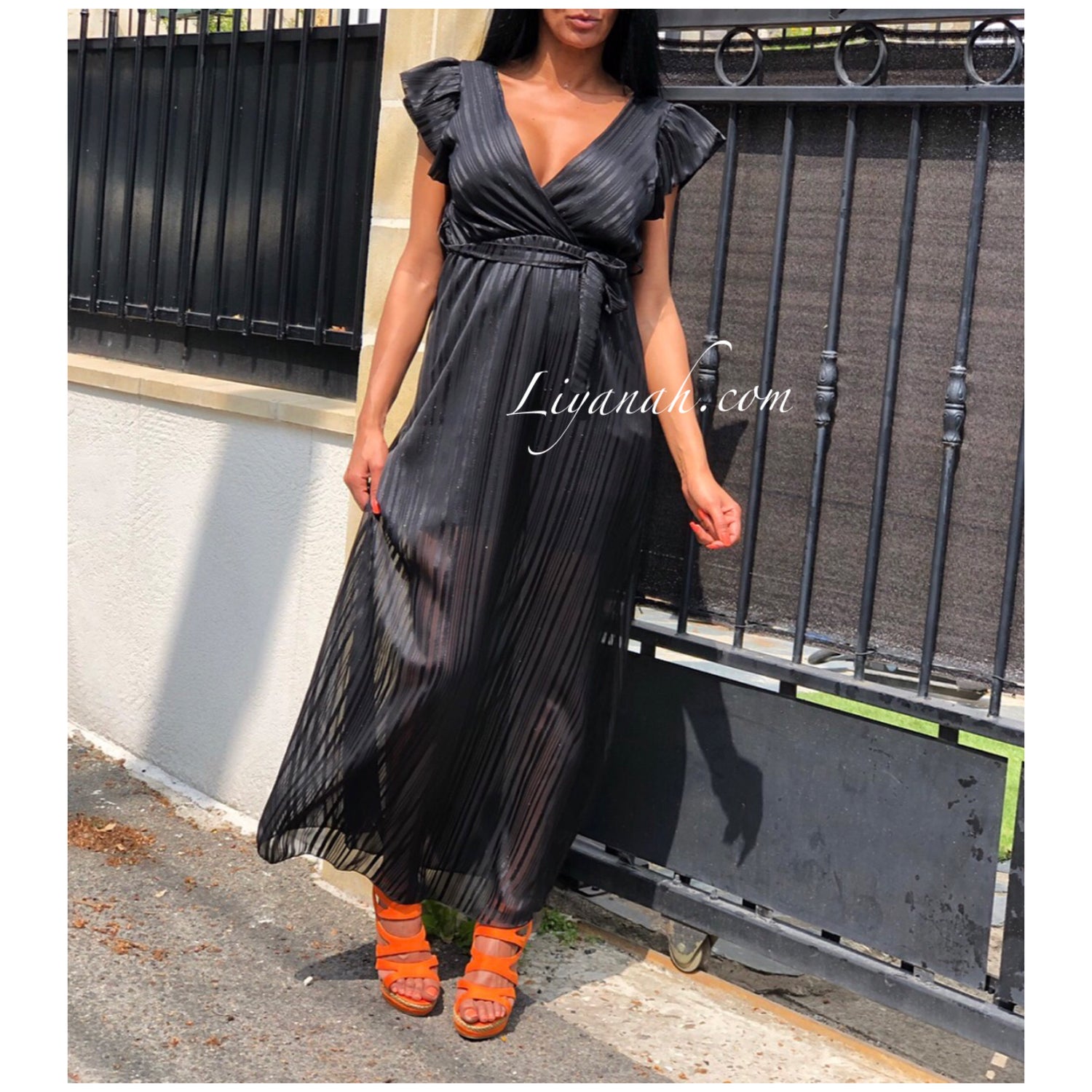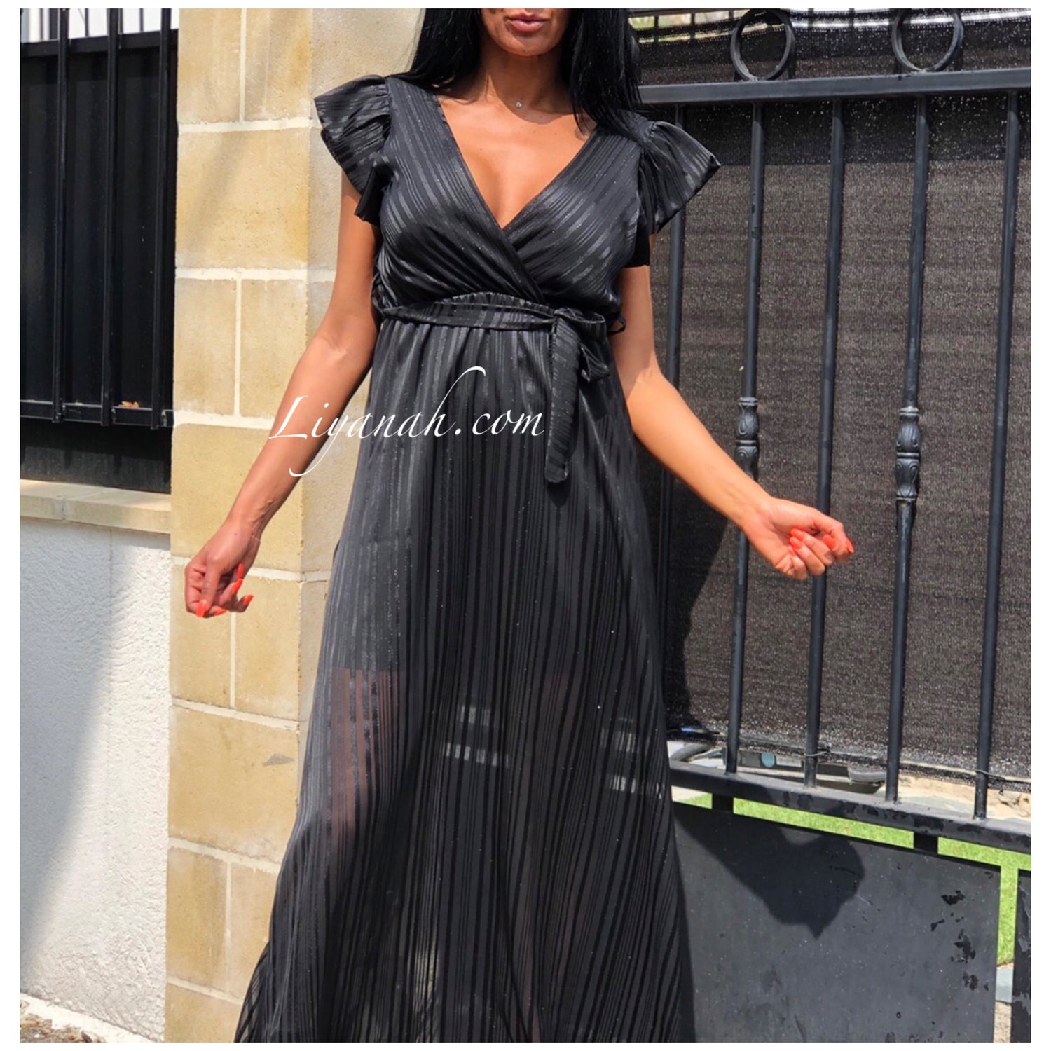 Robe Longue Modèle MELARA - Robe longue fluide et agréable à porter, décolleté plongeant et sans manches, noeud à nouer à la taille, légèrement transparente mais avec doublure - Pailleté - Taille Unique du 34 au 40 - 95% Polyester 5 % Elasthanne