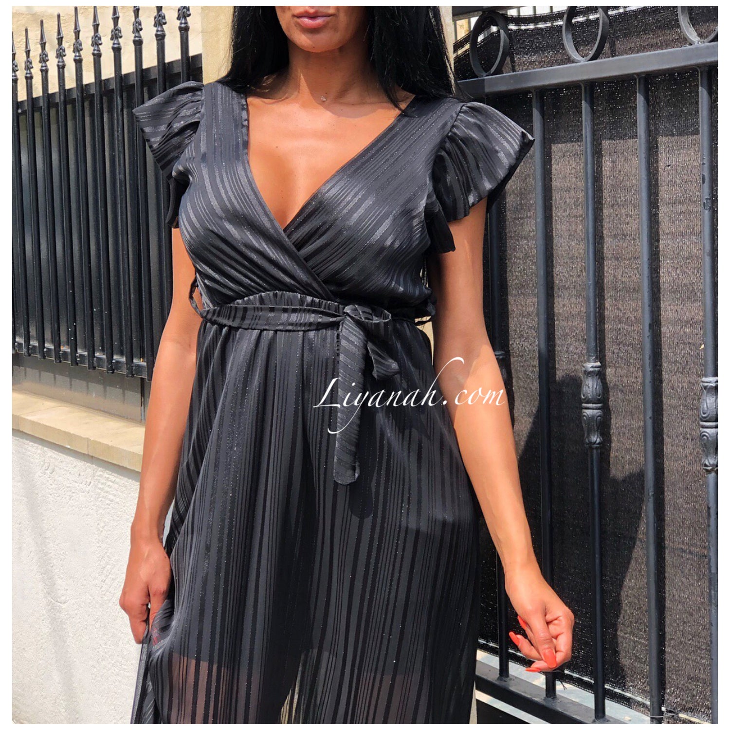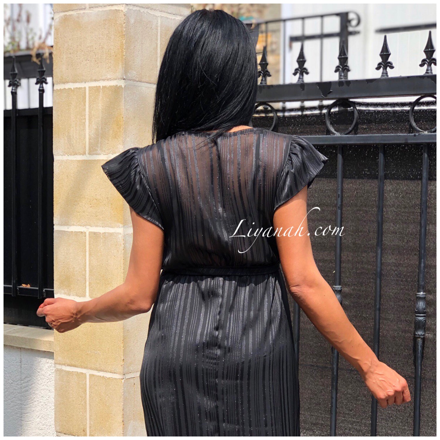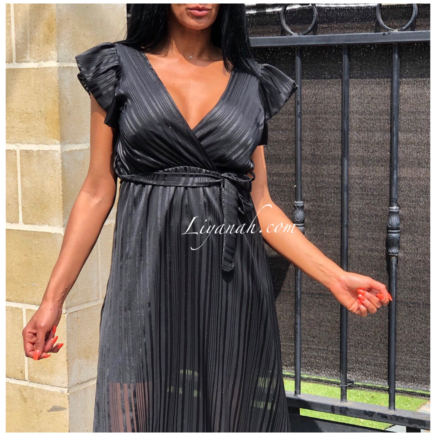 Robe Longue Modèle MELARA - Robe longue fluide et agréable à porter, décolleté plongeant et sans manches, noeud à nouer à la taille, légèrement transparente mais avec doublure - Pailleté - Taille Unique du 34 au 40 - 95% Polyester 5 % Elasthanne